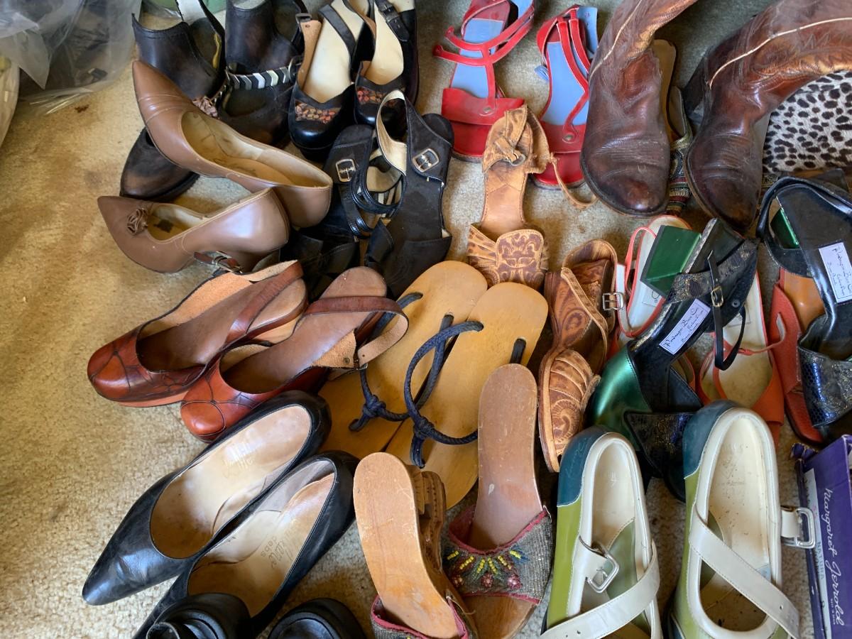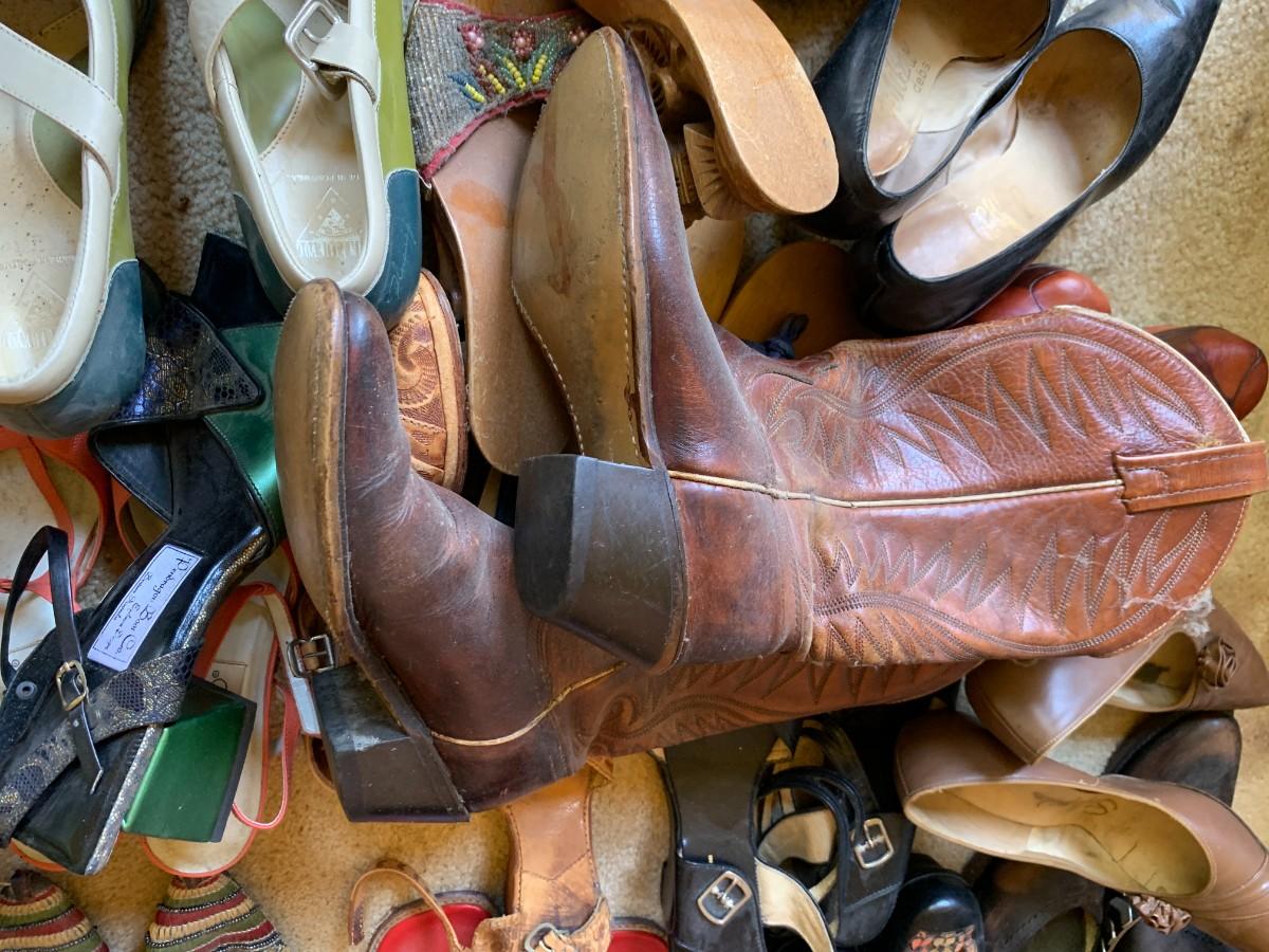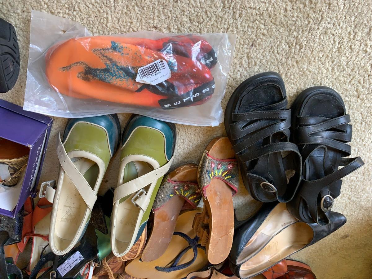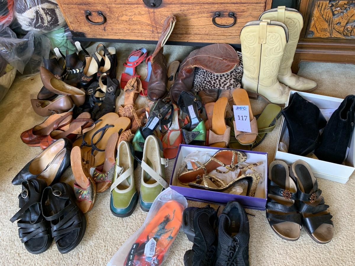 Assorted sandals and heels, mostly size 7 - 7.5US and 37 -37.5Eur. Includes cowboy boots, water shoes and dance shoes