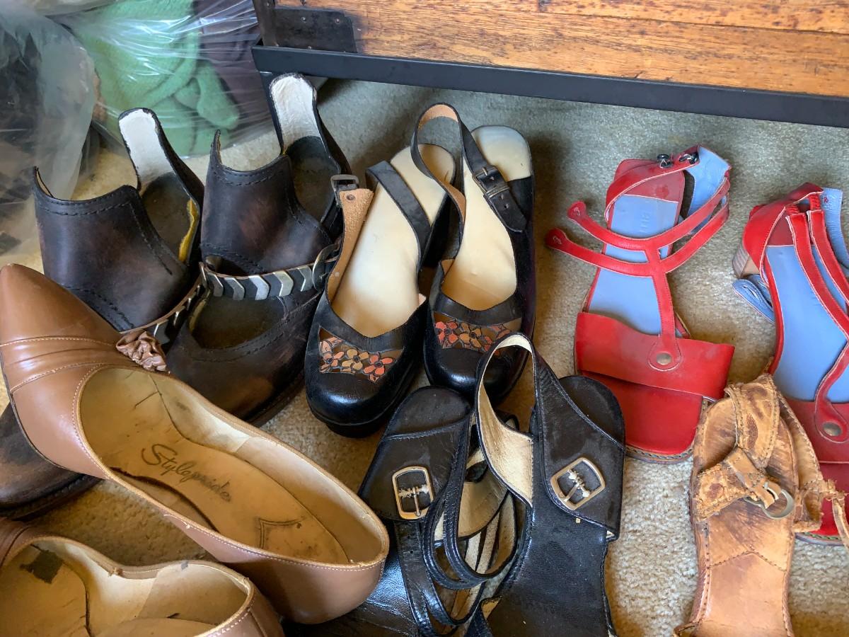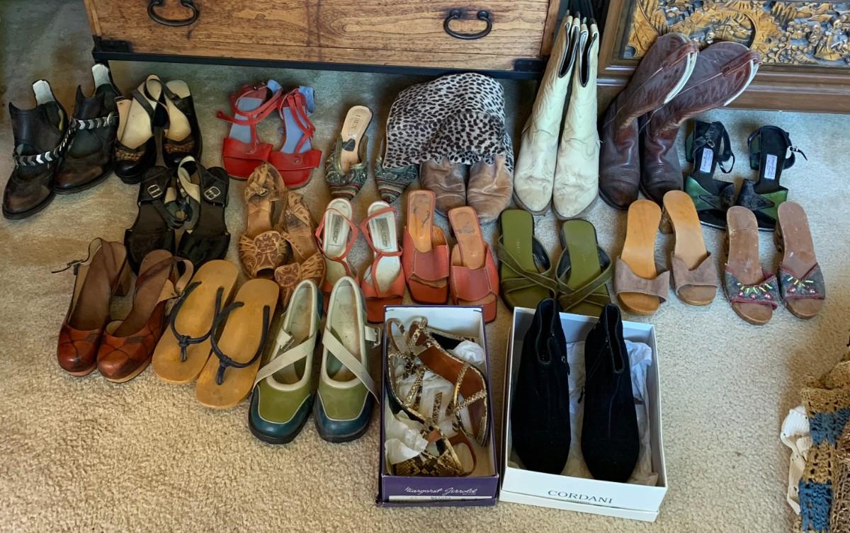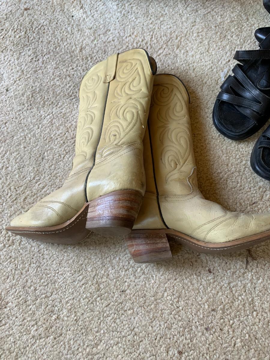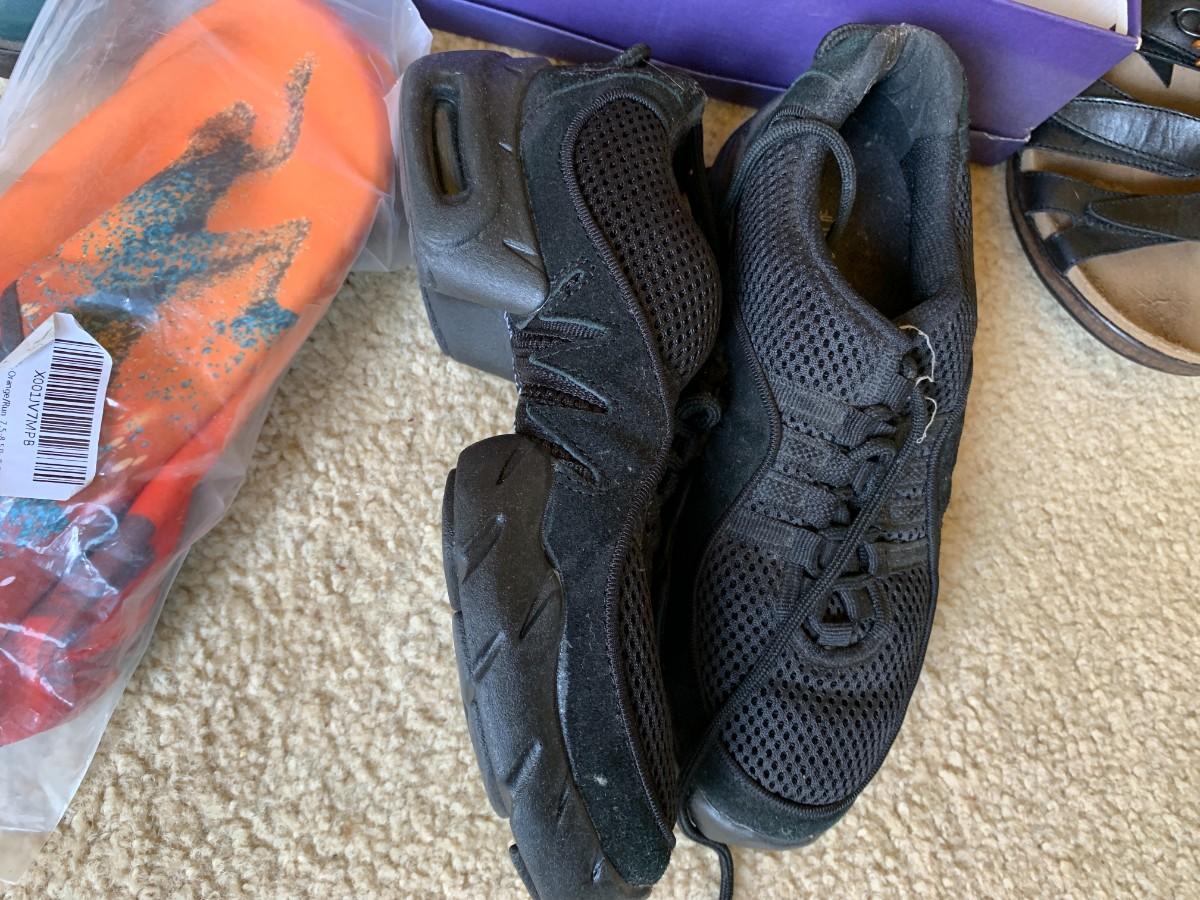Assorted sandals and heels, mostly size 7 - 7.5US and 37 -37.5Eur. Includes cowboy boots, water shoes and dance shoes