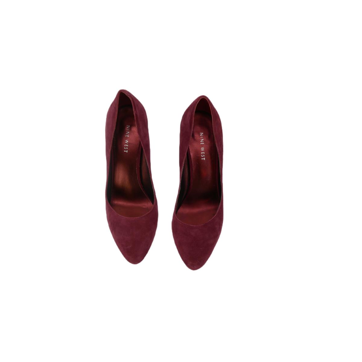 Four pairs of women's shoes size US 7.5. One pair magenta Nine West pumps, Enzo Angiolini leather loafer style flats, Taryn Rose pink ballet style flats, and black Calvin Klein pointed toe slip ons. Pre-owned, may have scuffs and marks. All in good condition. (F22)