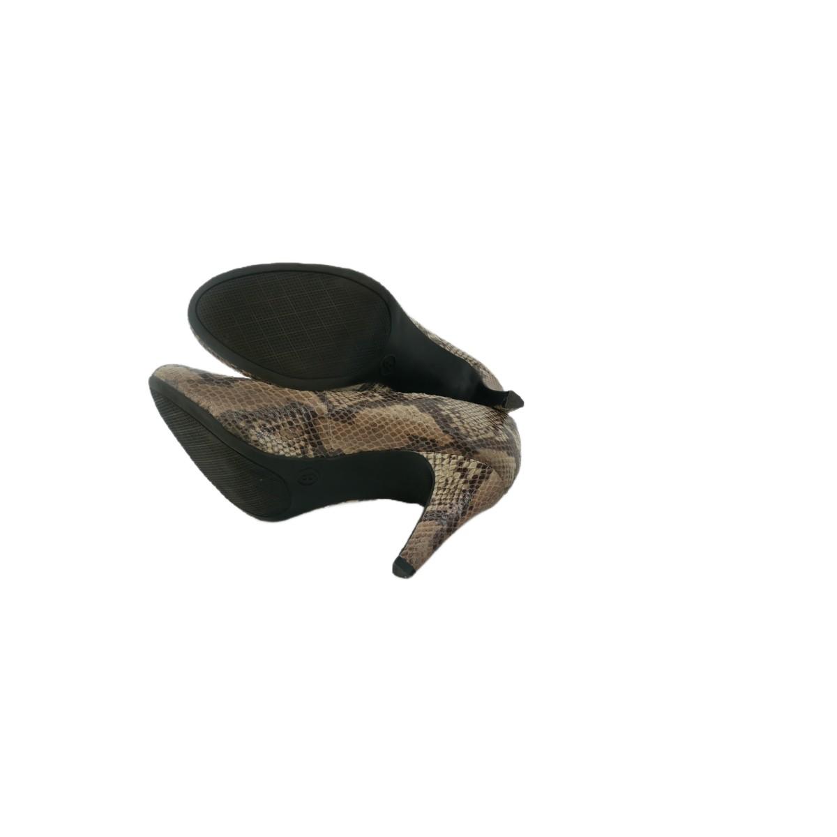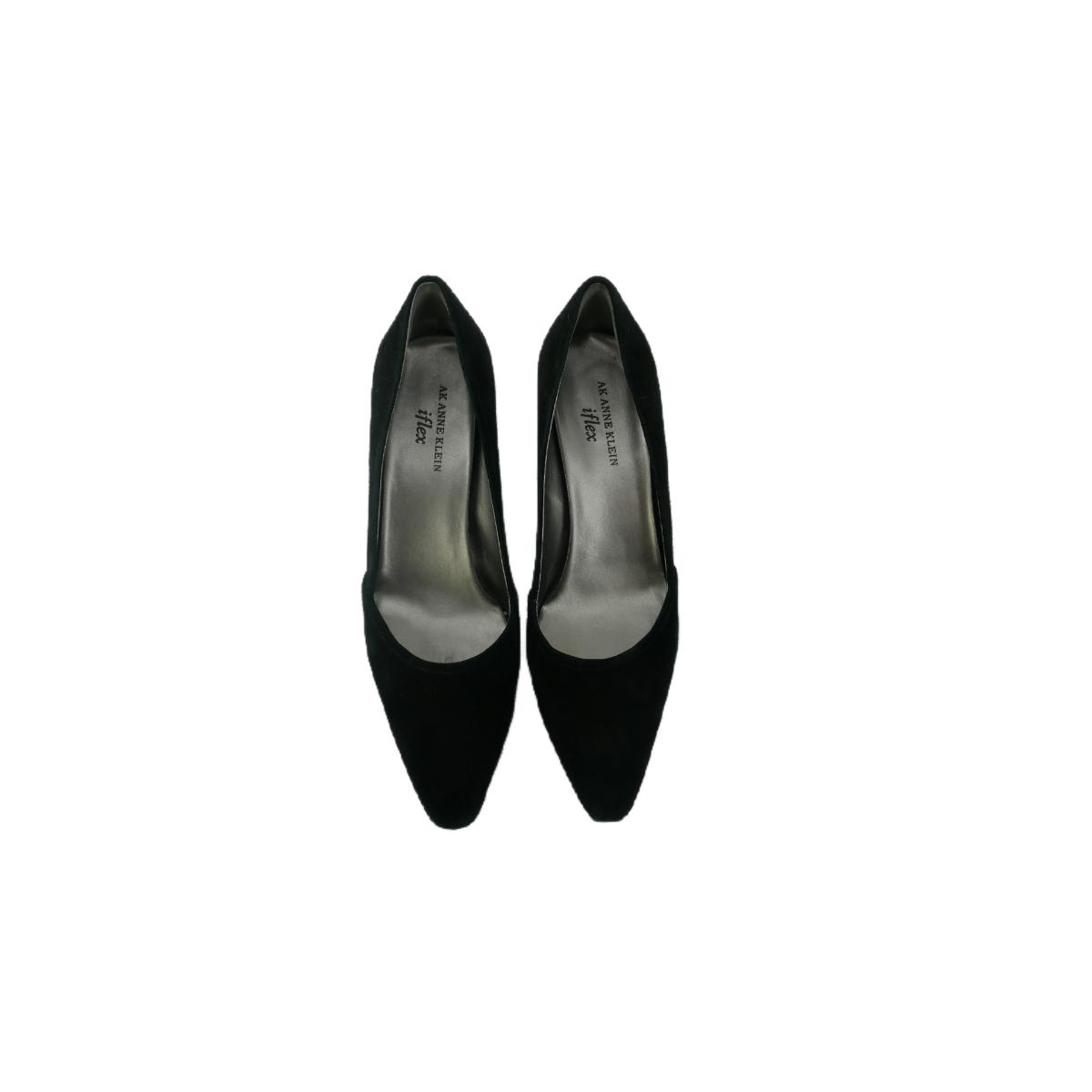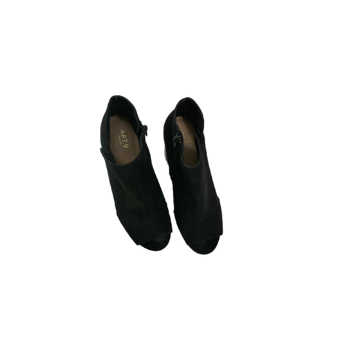 Three pairs of women's shoes in size US 8. One Anne Klein iflex pointed toe black heels, one Merona faux snake skin pumps, and one Apt. 9 black ankle booties. Pre-owned, scuffing and marks may be present. All in good condition. (F19)