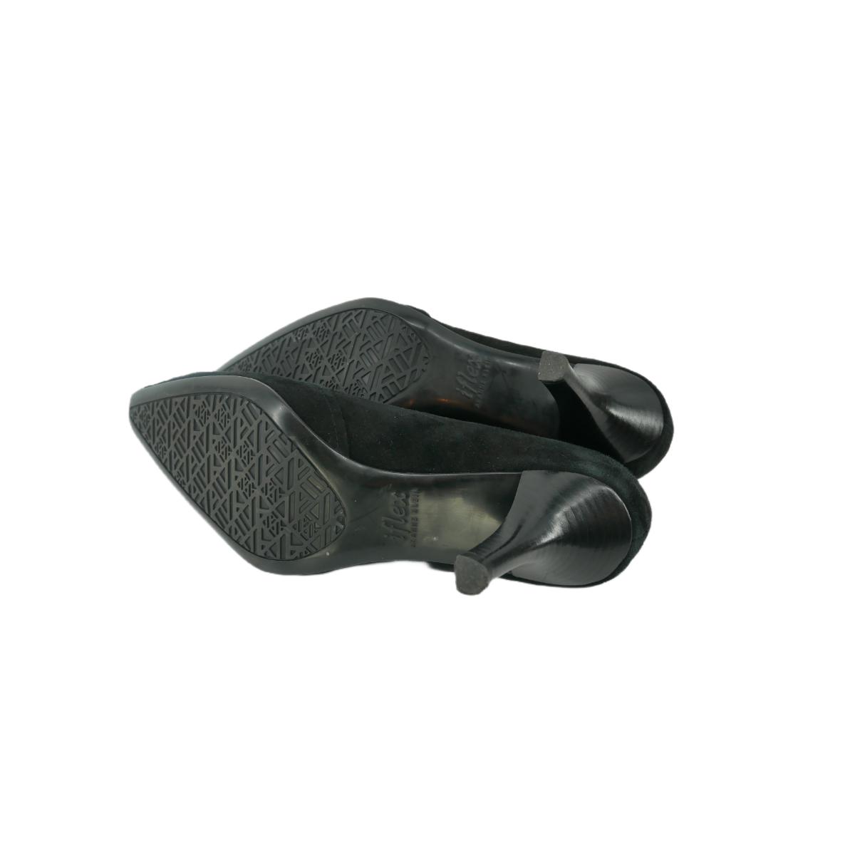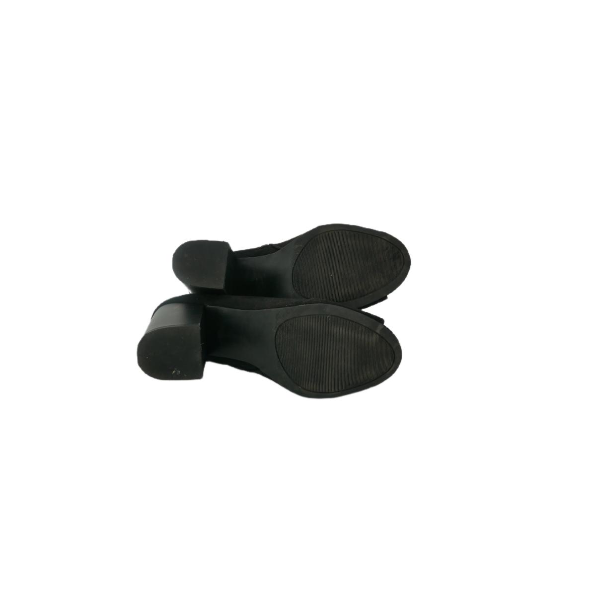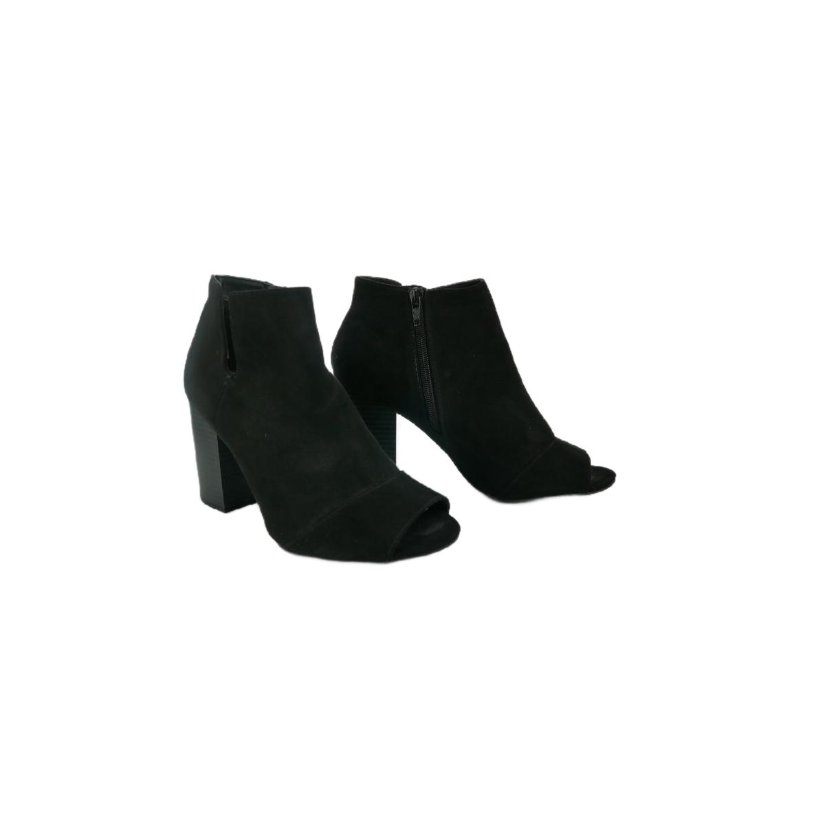 Three pairs of women's shoes in size US 8. One Anne Klein iflex pointed toe black heels, one Merona faux snake skin pumps, and one Apt. 9 black ankle booties. Pre-owned, scuffing and marks may be present. All in good condition. (F19)