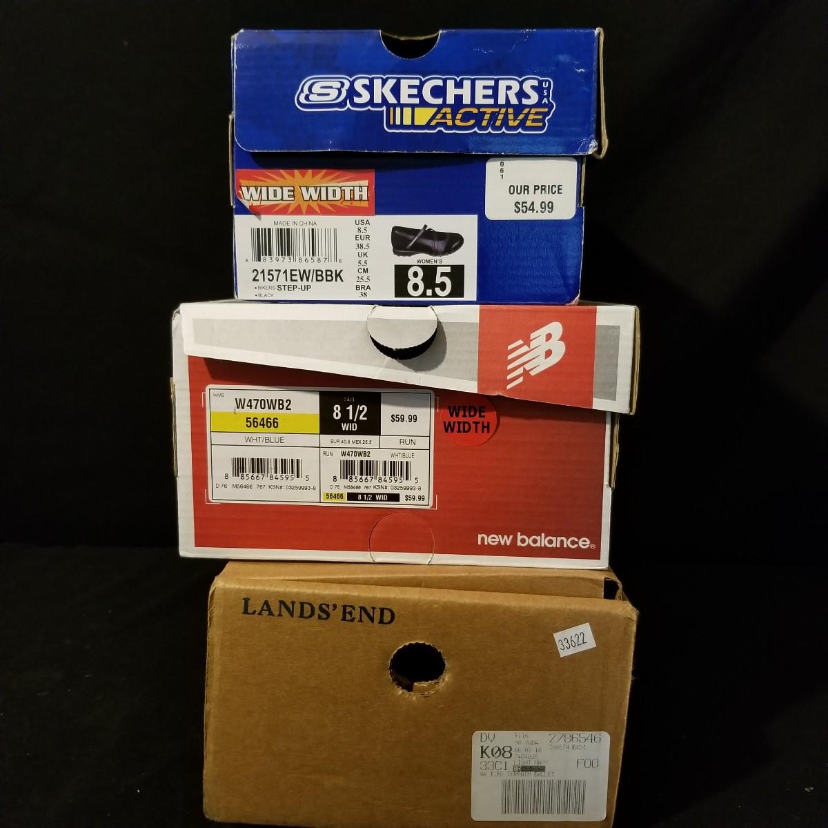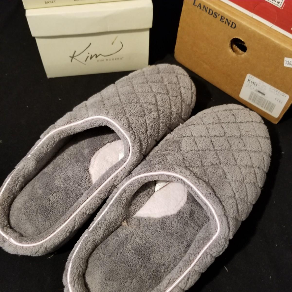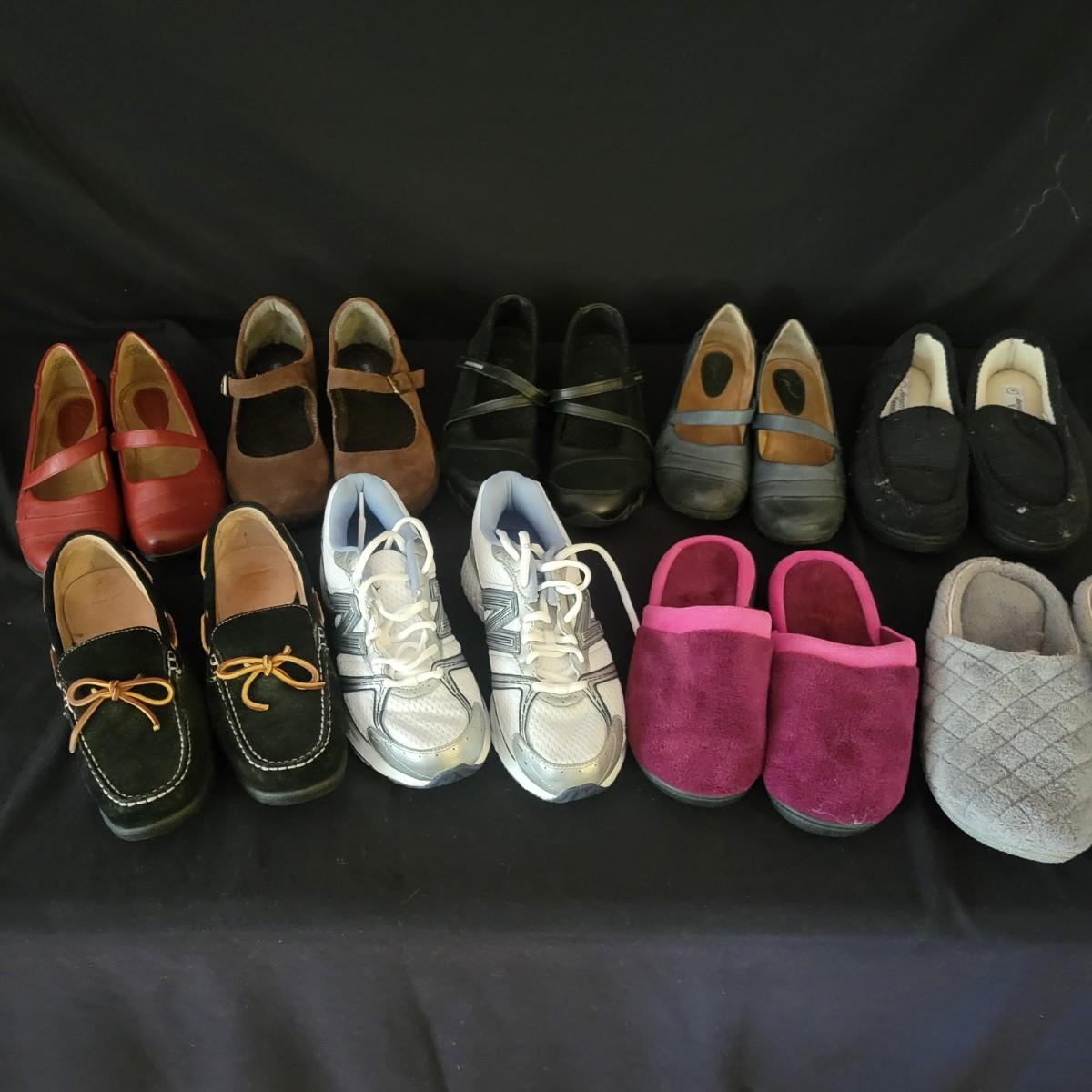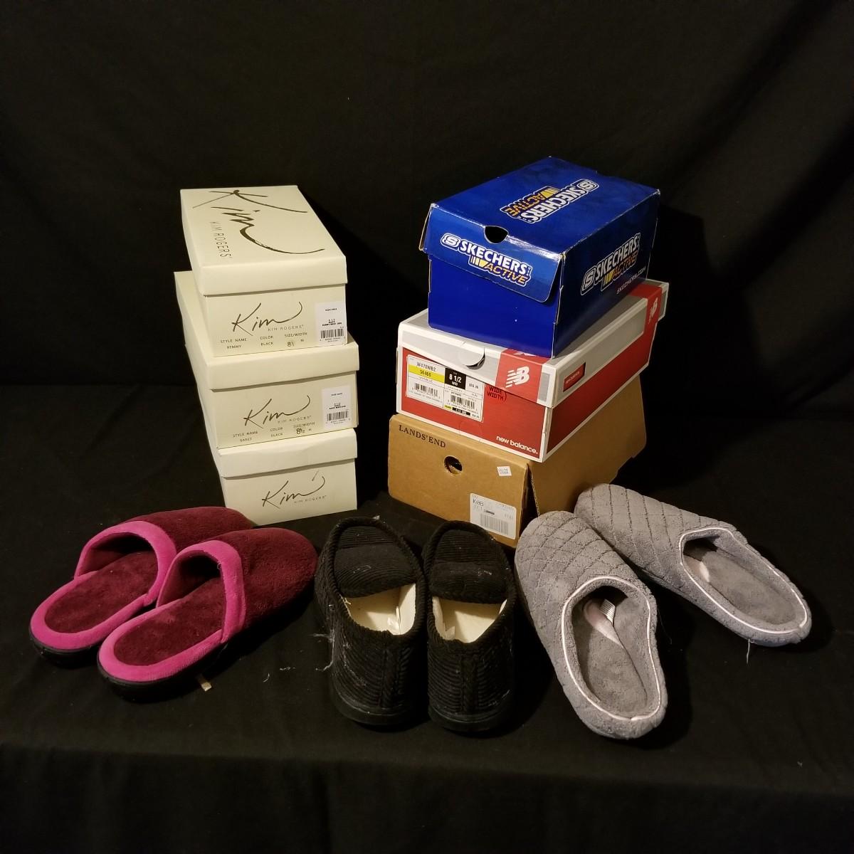 Six pairs of ladies shoes and three pairs of slippers. Kim Rogers, Skechers, Lands End, New Balance, and more. All items size 8.5 except gray slippers, which are XL. Items in fair to good condition, see photos for details.