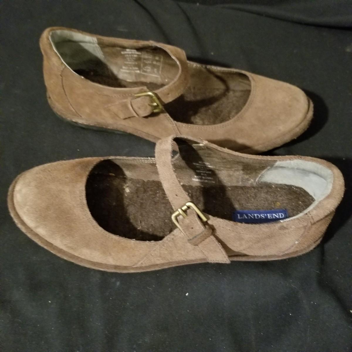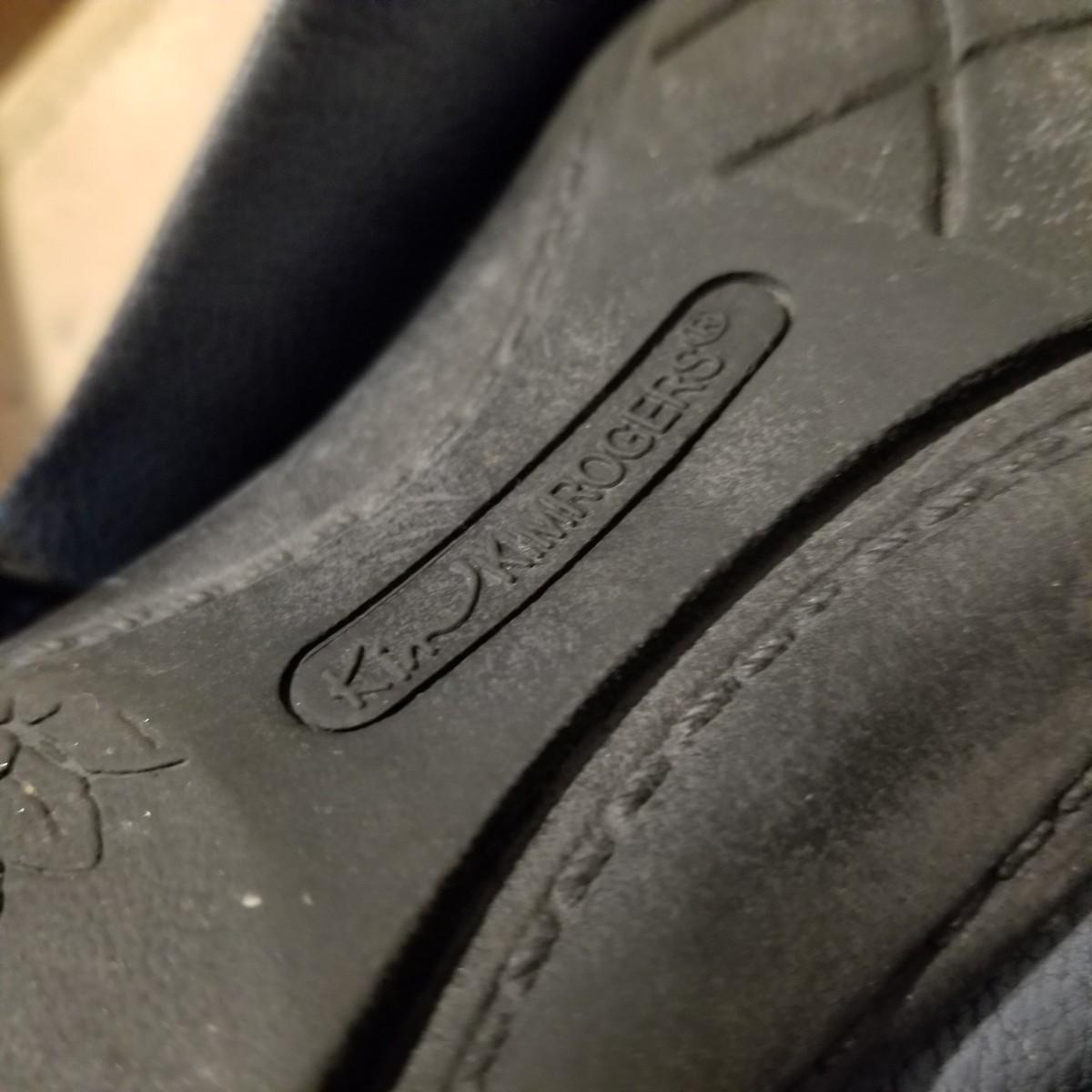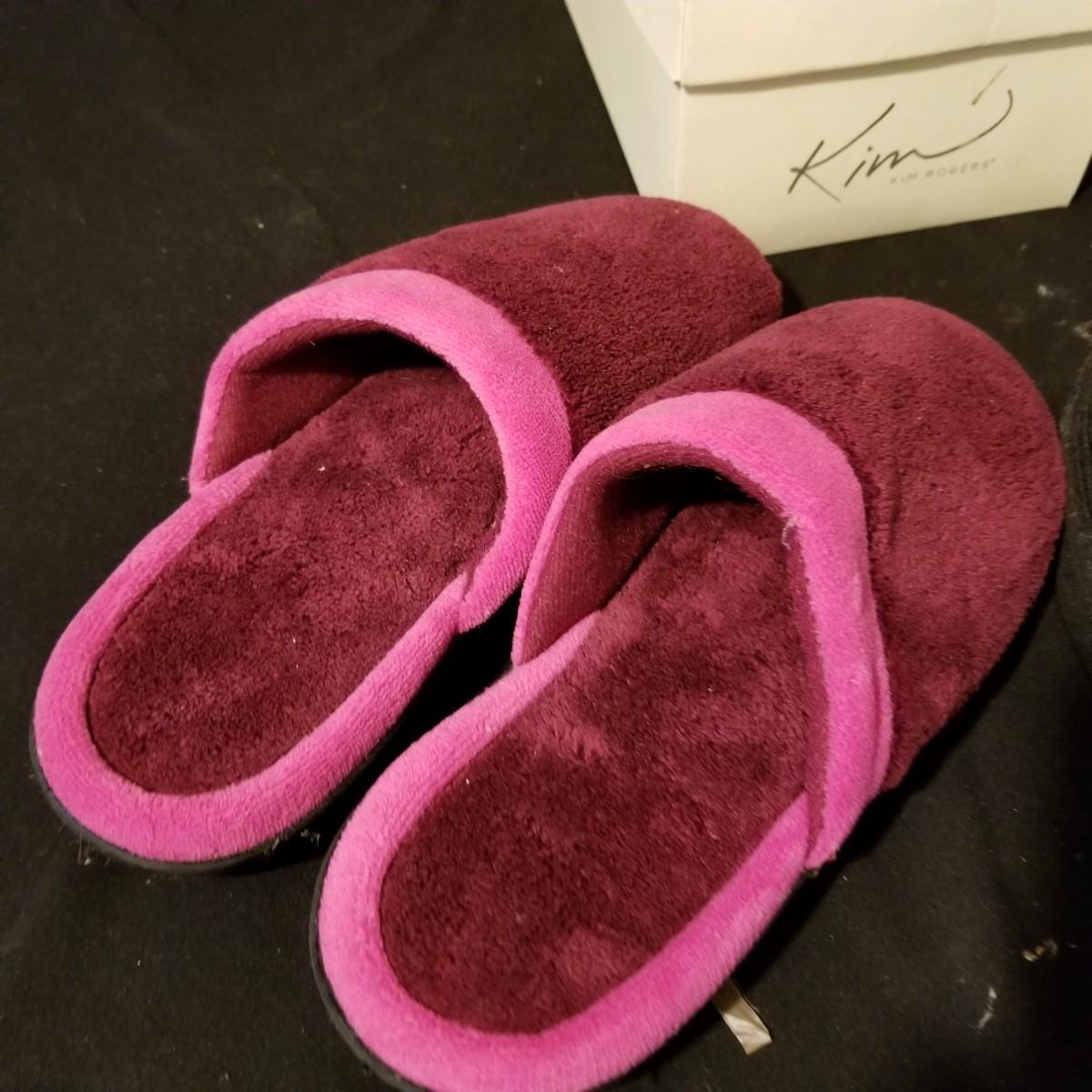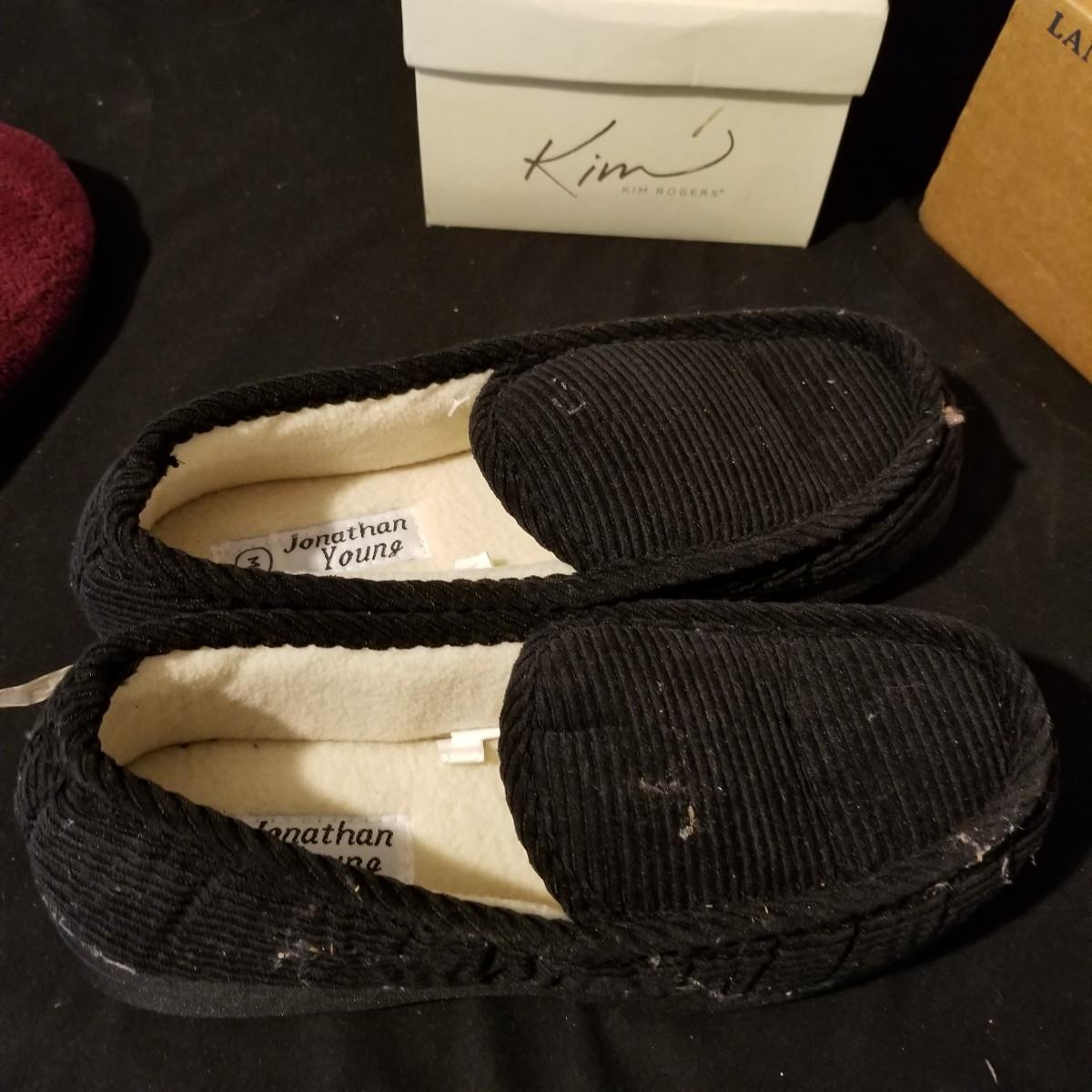 Six pairs of ladies shoes and three pairs of slippers. Kim Rogers, Skechers, Lands End, New Balance, and more. All items size 8.5 except gray slippers, which are XL. Items in fair to good condition, see photos for details.