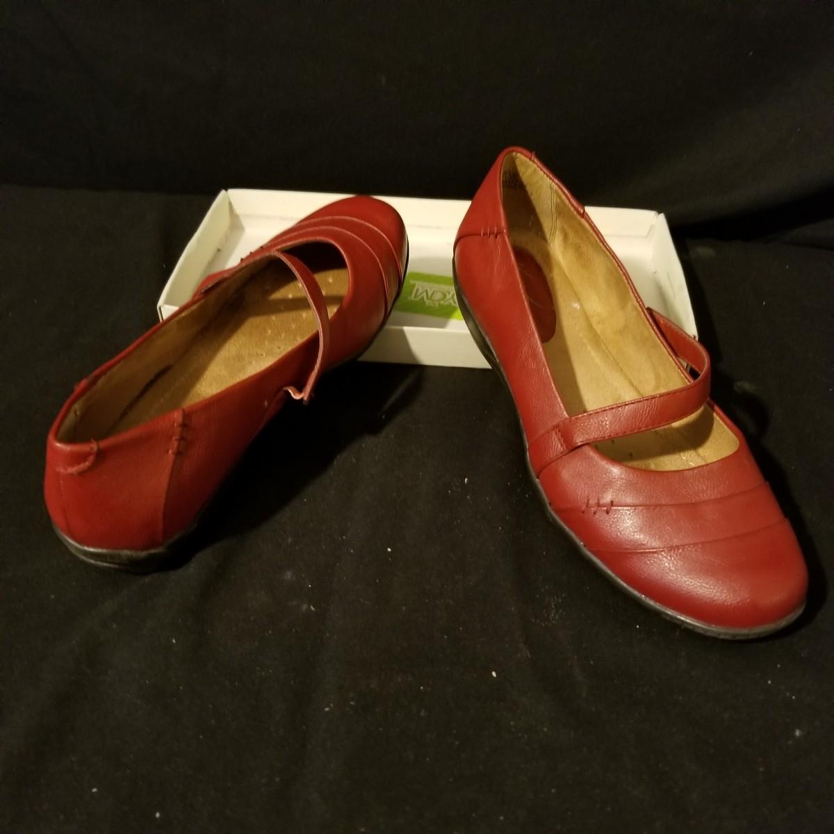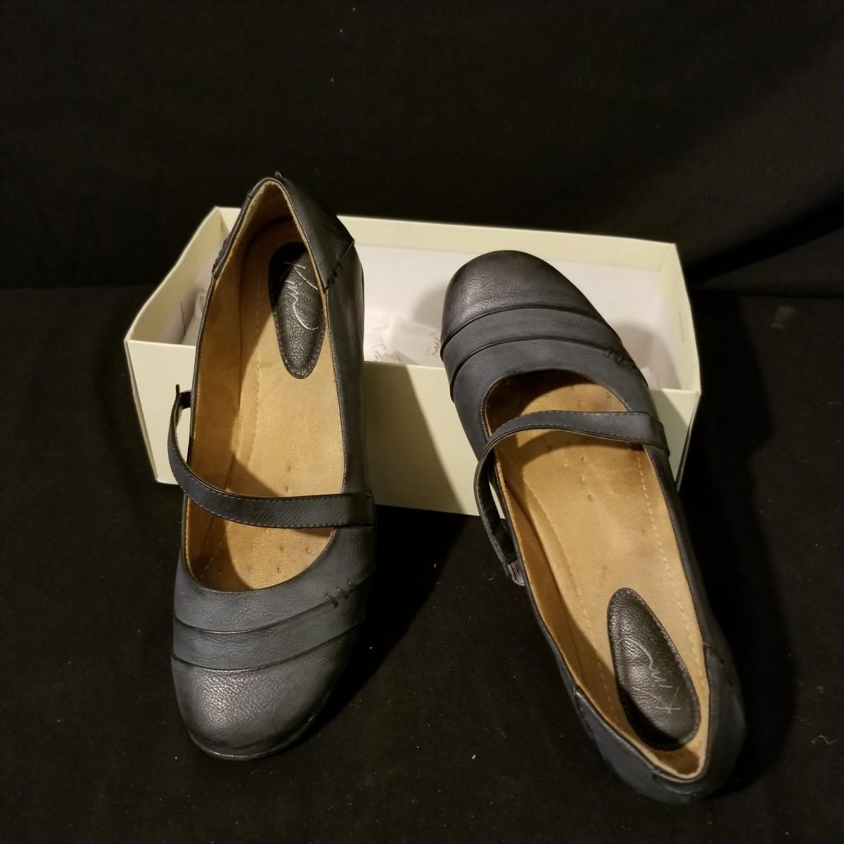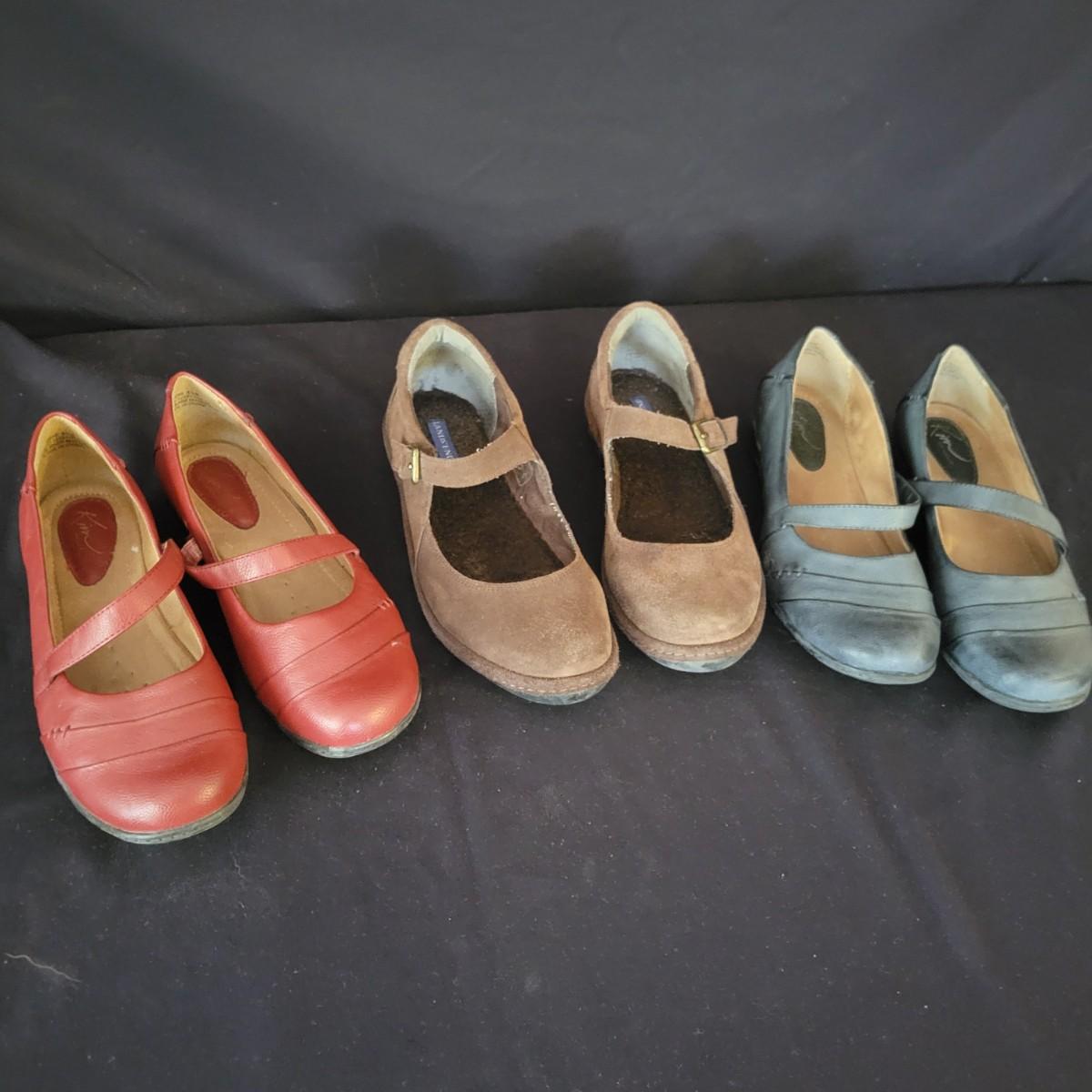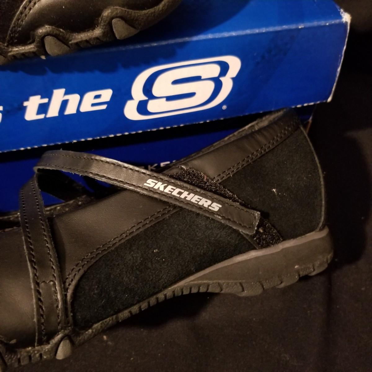 Six pairs of ladies shoes and three pairs of slippers. Kim Rogers, Skechers, Lands End, New Balance, and more. All items size 8.5 except gray slippers, which are XL. Items in fair to good condition, see photos for details.