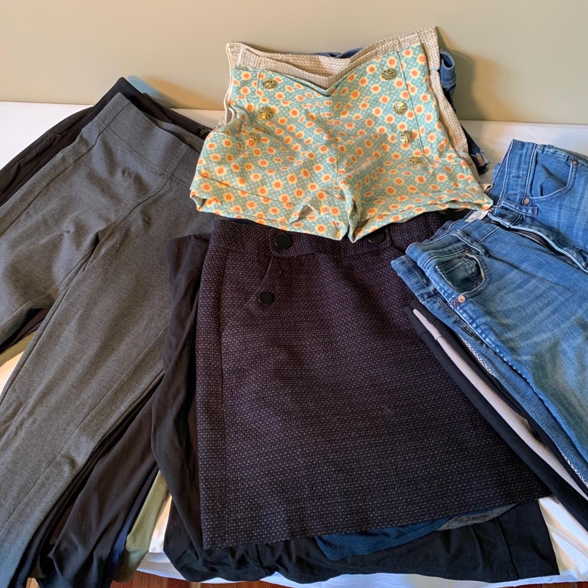 There is a large variety of items included in this lot of women’s size 4-6 pants, shorts, and skirts. There are four skirts, all above-the-knee length. Two pairs of denim jeans are included, plus seven other pairs of long pants, as well as four leggings, three Avia pants, and three pairs of shorts. Please see photos for brand names and other details.