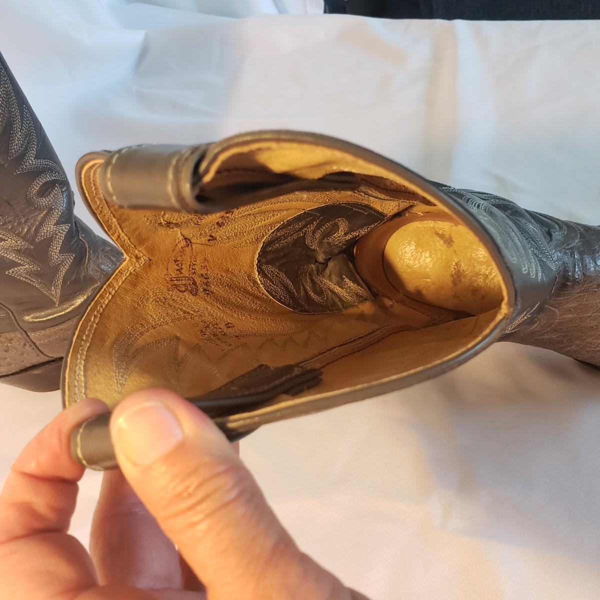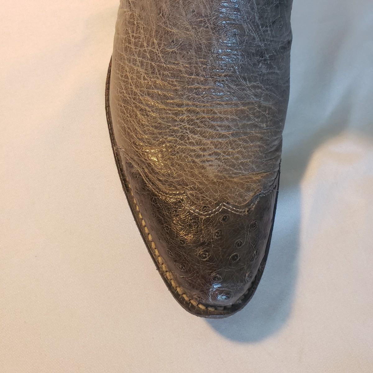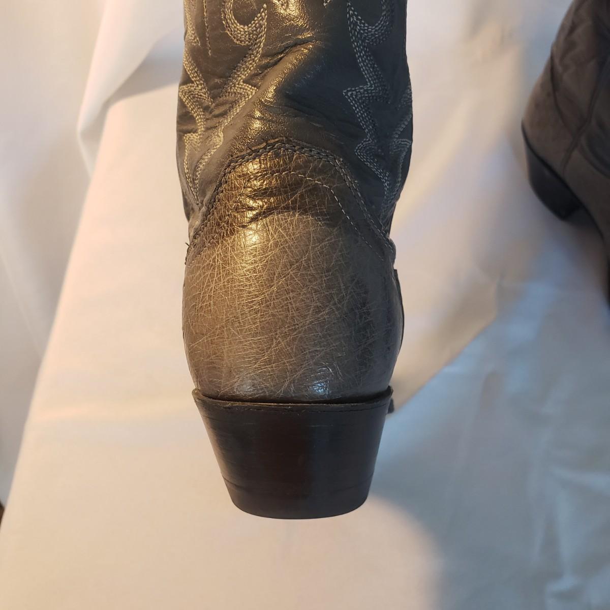 This is a pair of grey leather size 7 Justin boots for women. The leather and stitching is grey. There are three different types of leather, one at the toe, across the foot and the uppers. The bottoms have some scuff marks, but you can still see the Justin stamp.