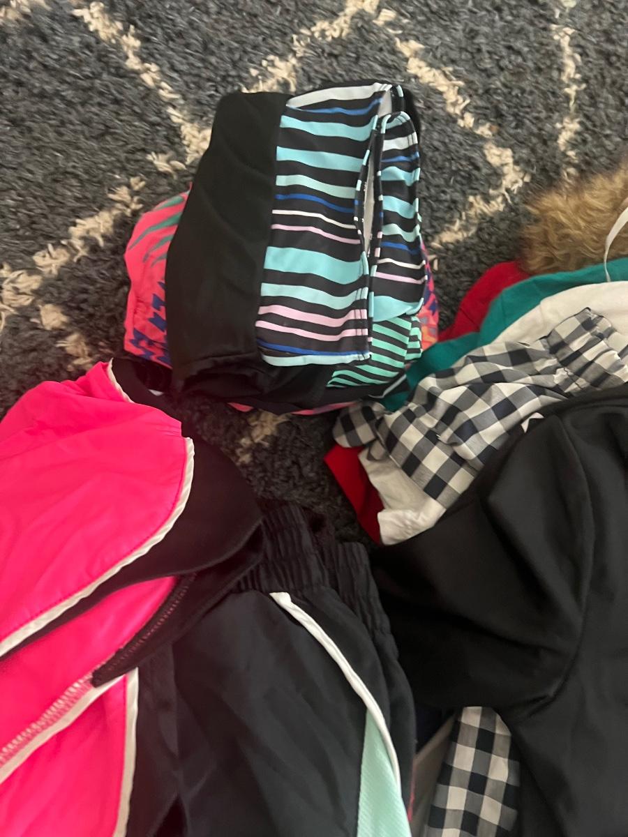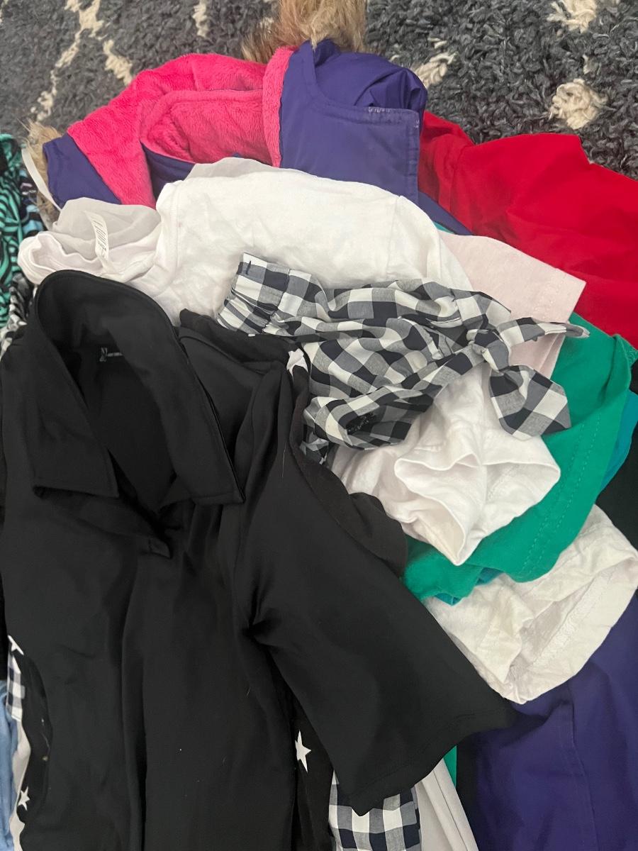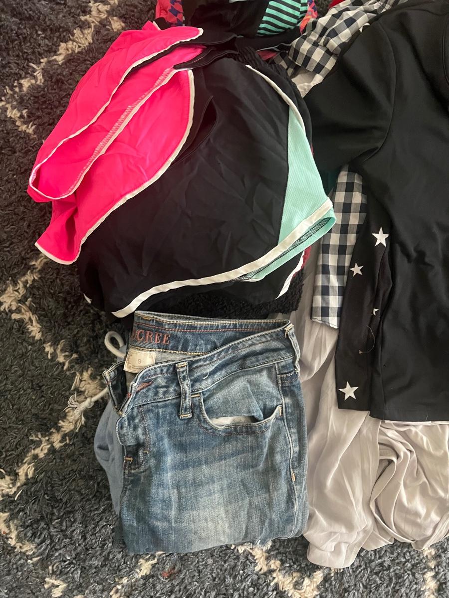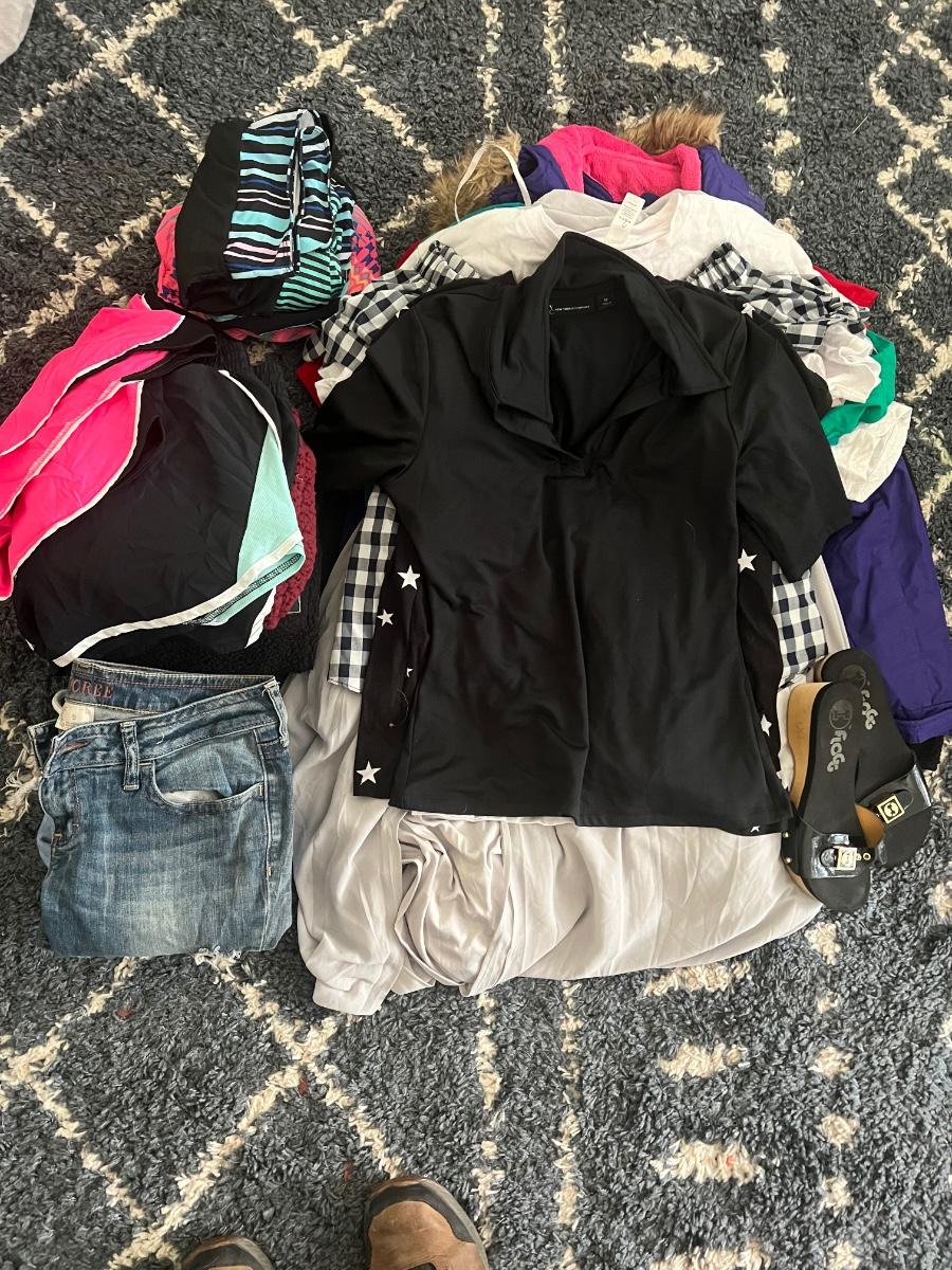 Includes a grey formal dress, swimsuits, jeans, sandals, athletic shorts, a snow jacket, and many tops.