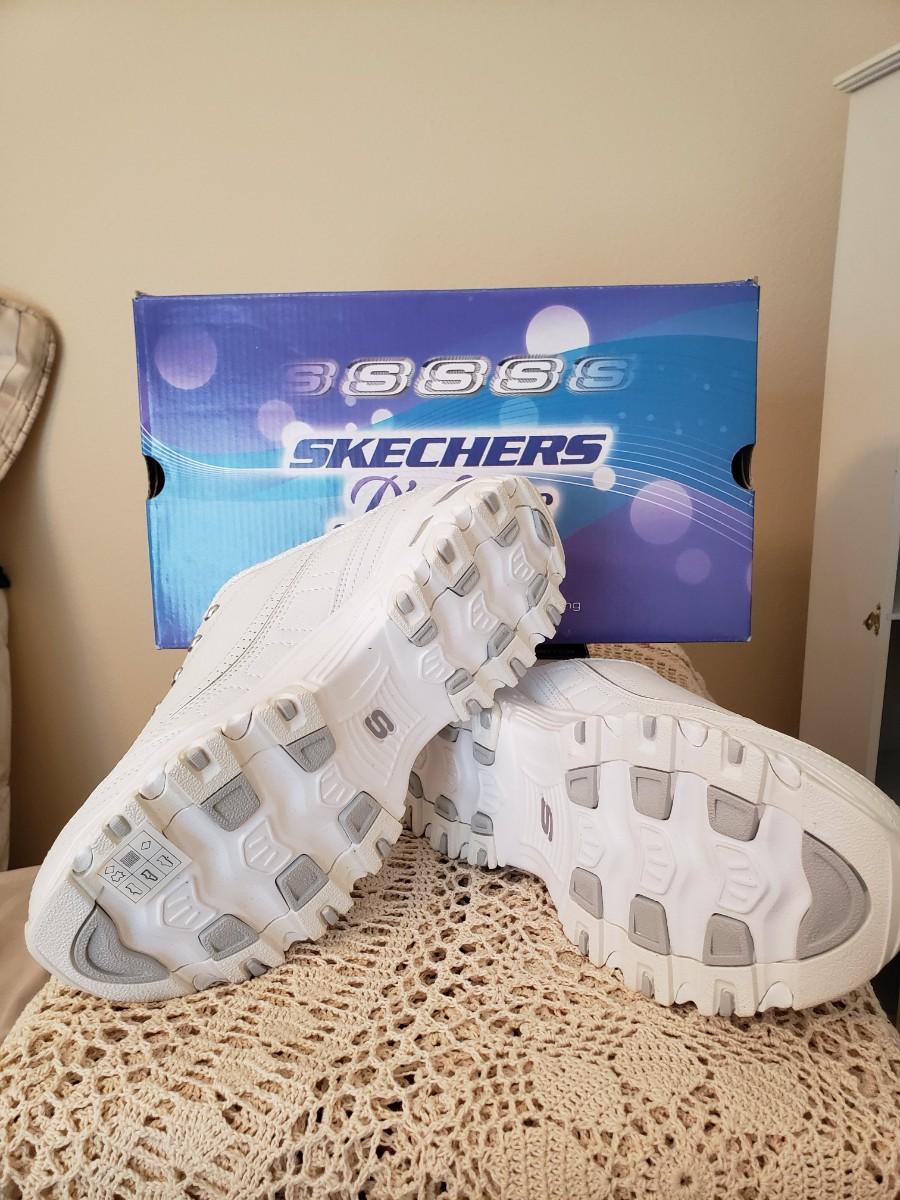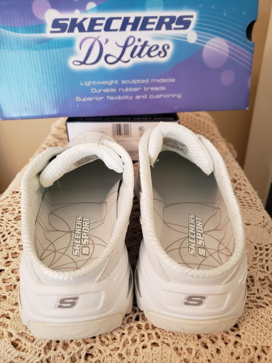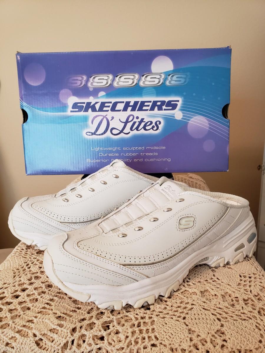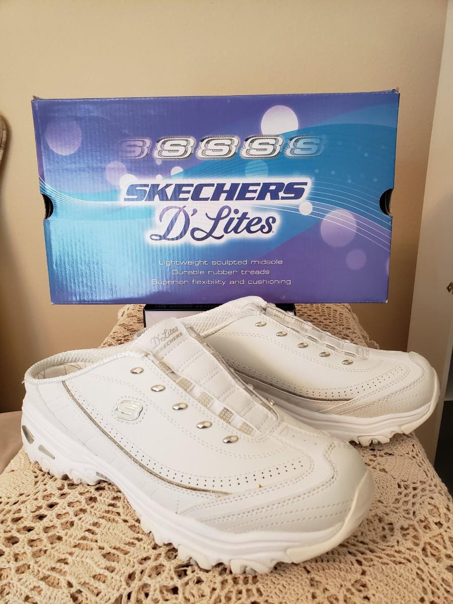 Women's Skechers D'Lites mule style slip on white sneakers. Size 8.5. NIB Excellent condition.