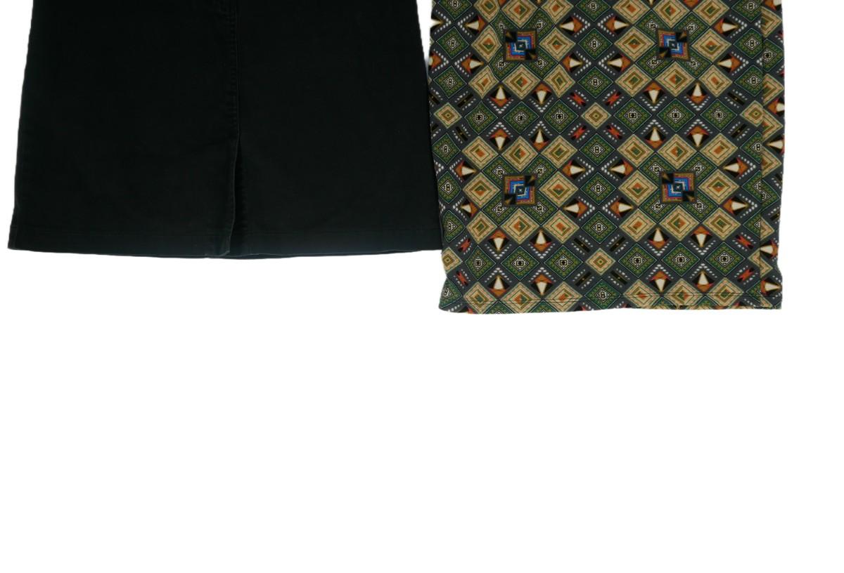 Two women's skirts, black jean skirt in size 10 and patterned skirt in size M.