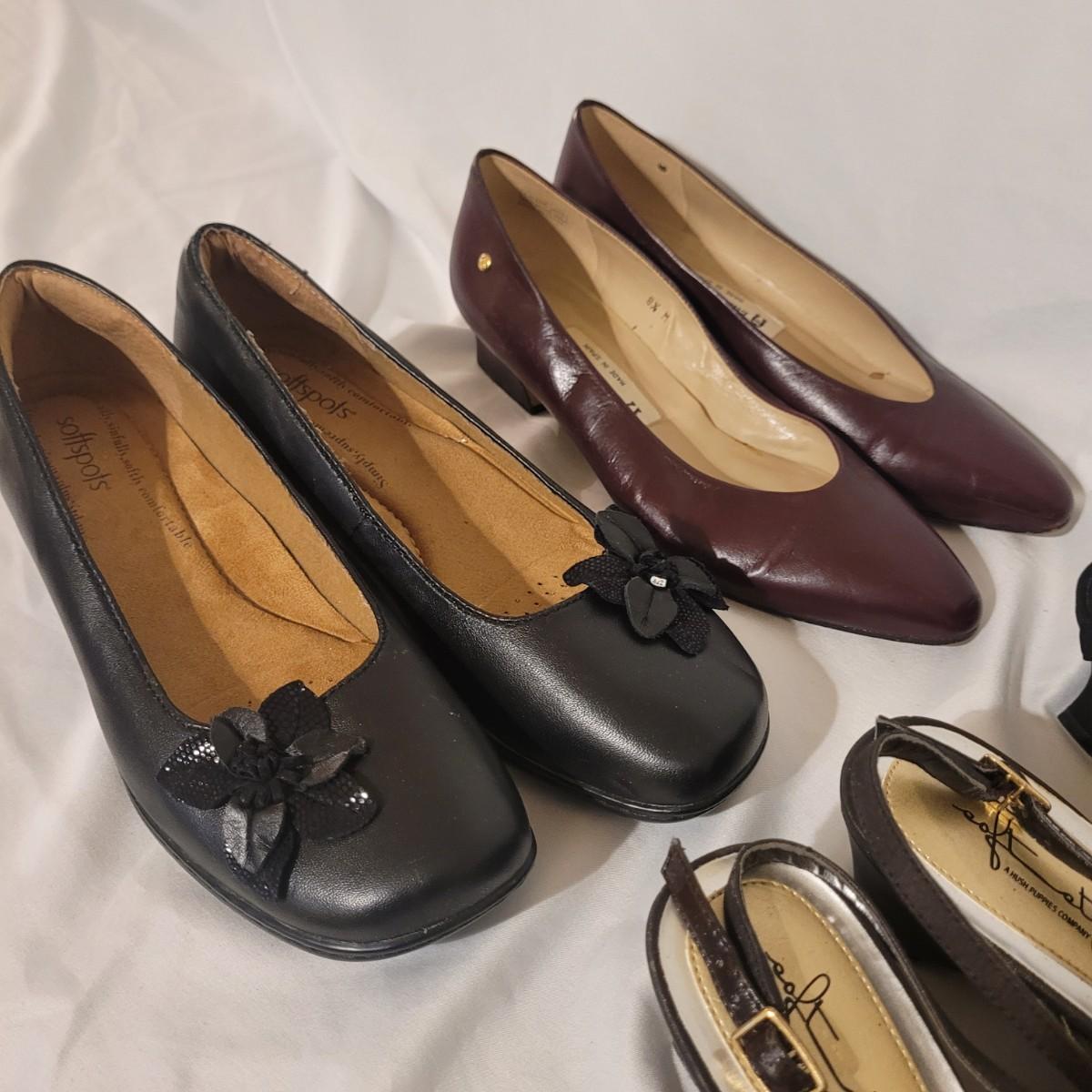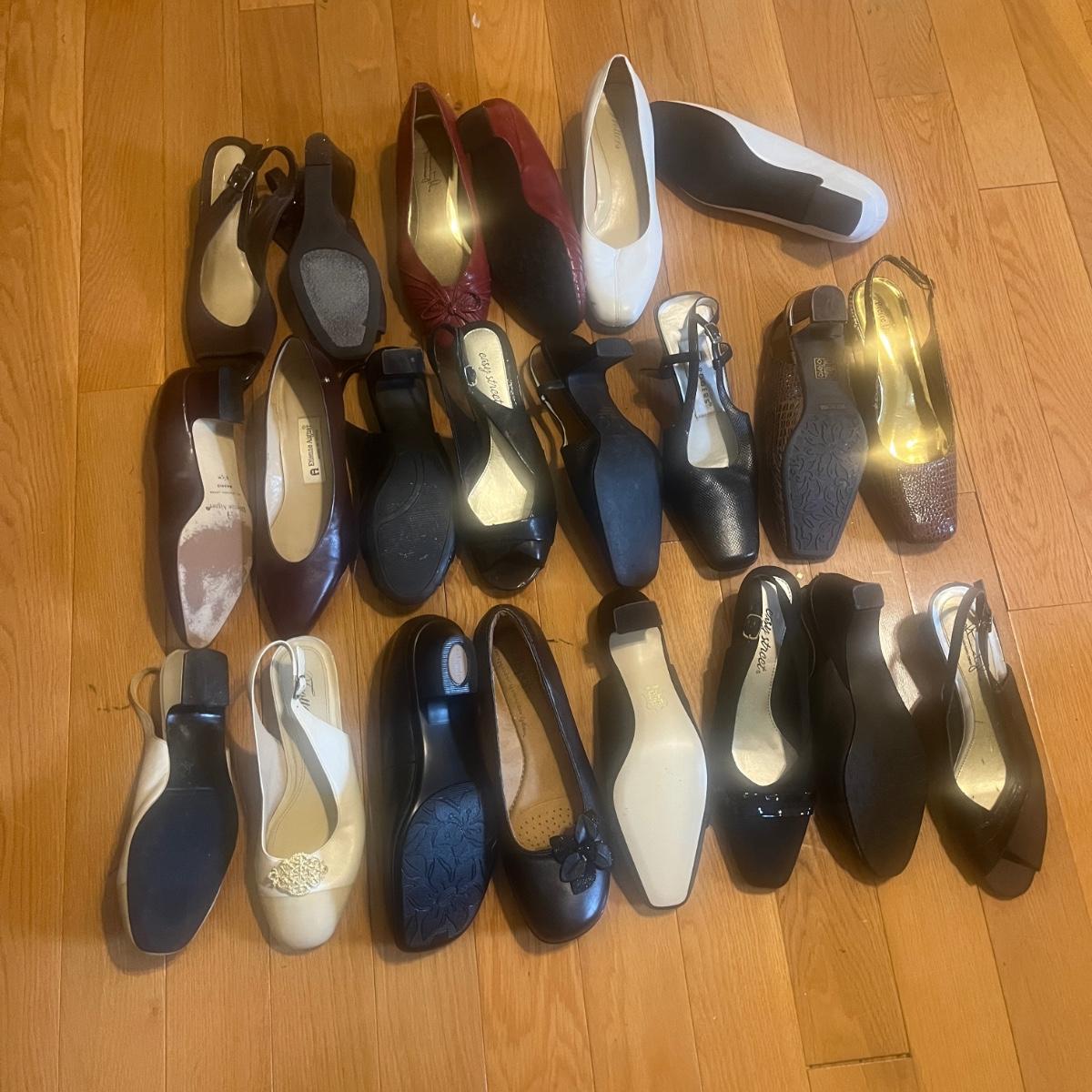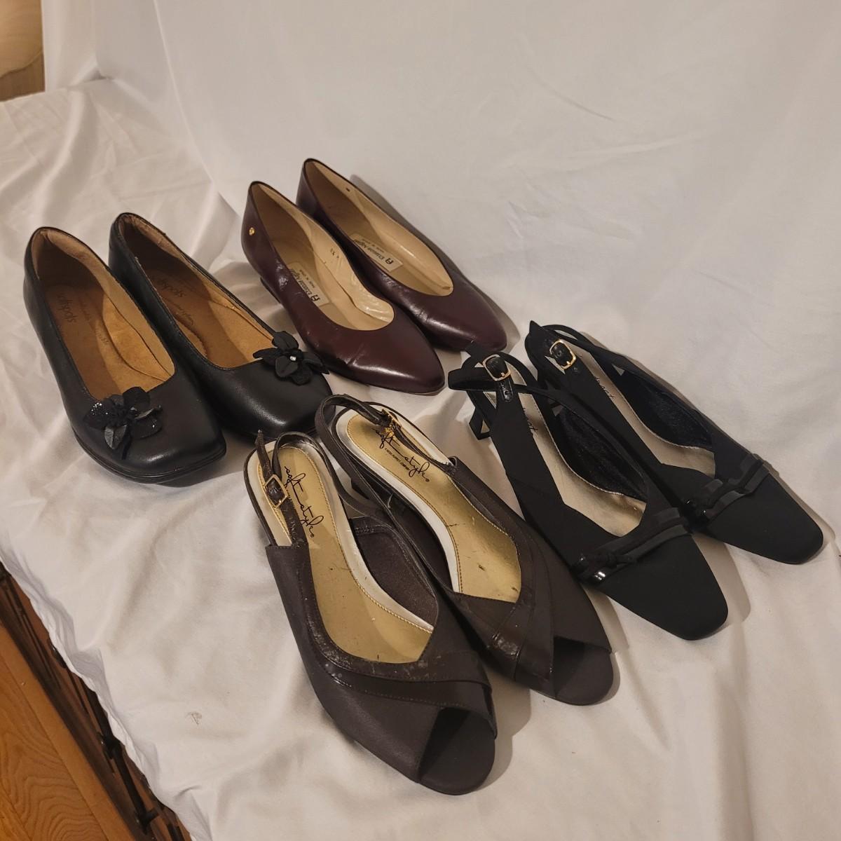 This lot includes 11 pairs of low heels, with a size range of 7W to 8. Brands include Hush Puppies, Kim Rogers and more. Shipping available.