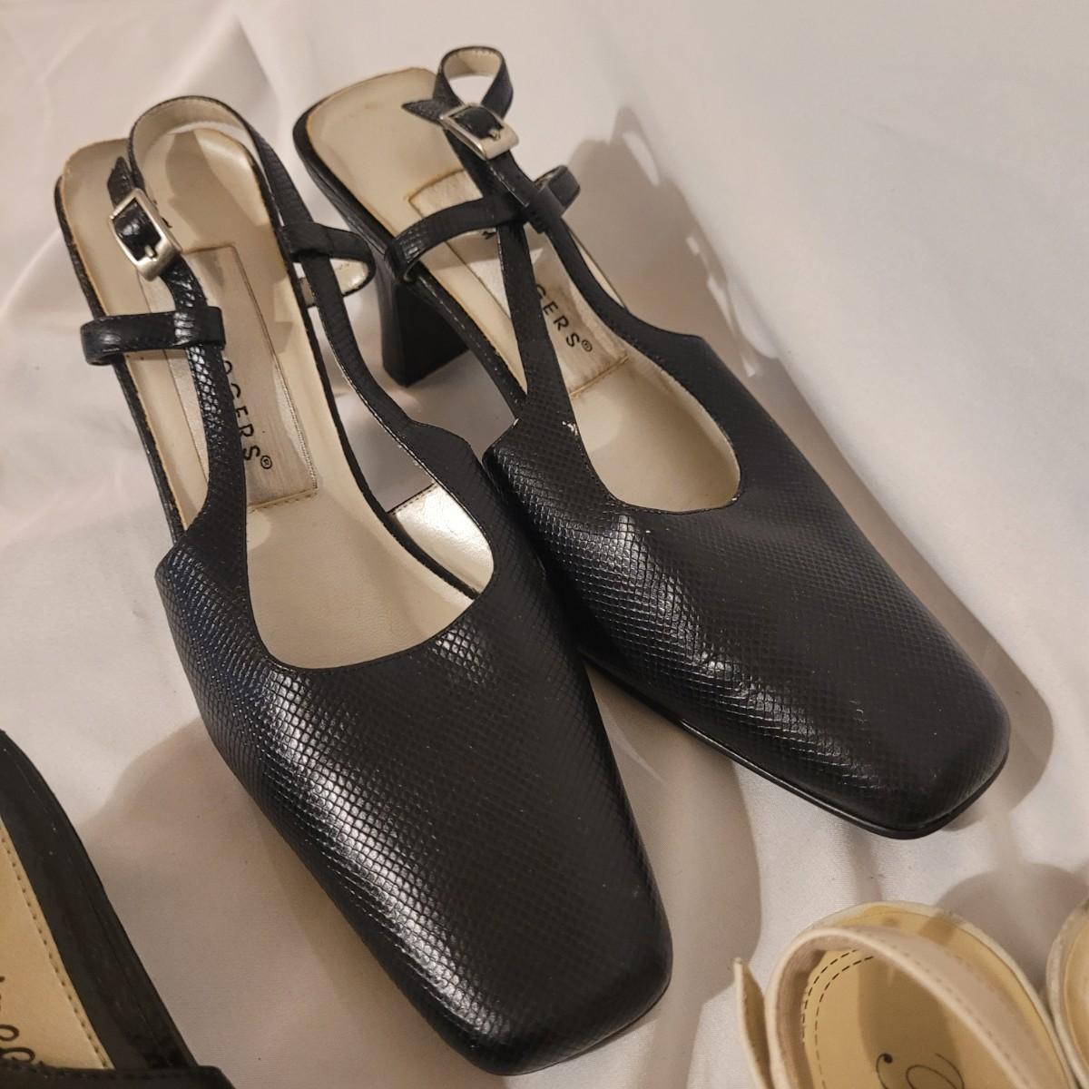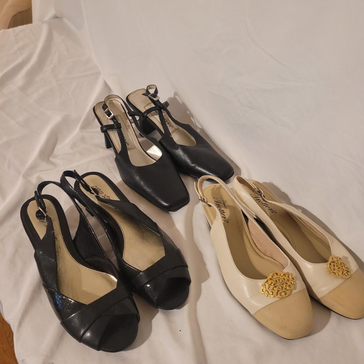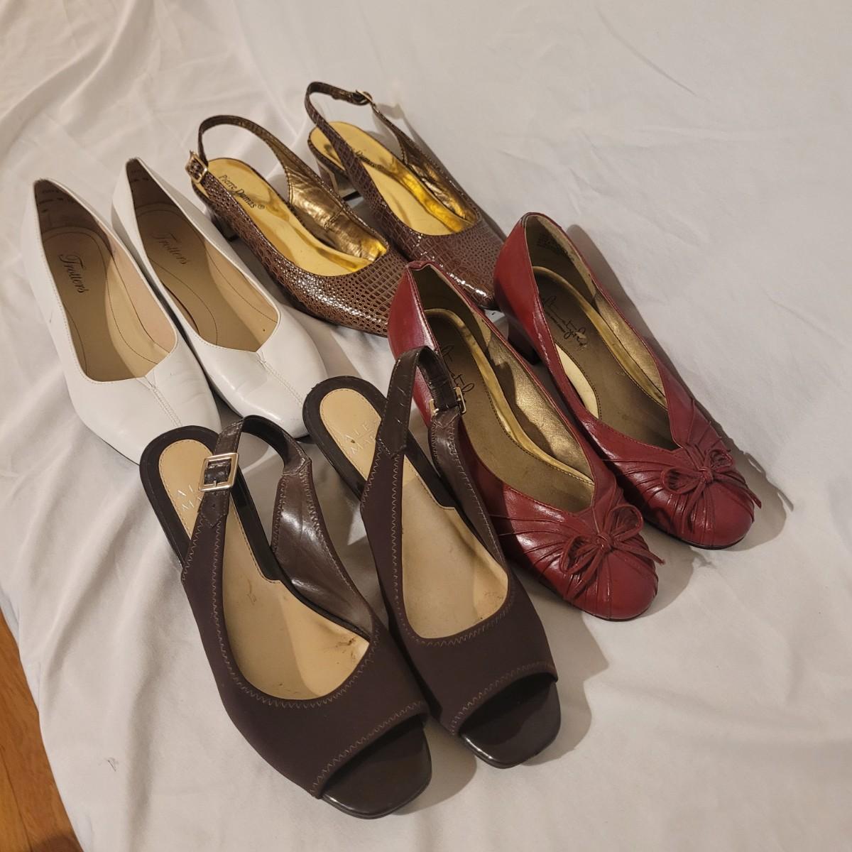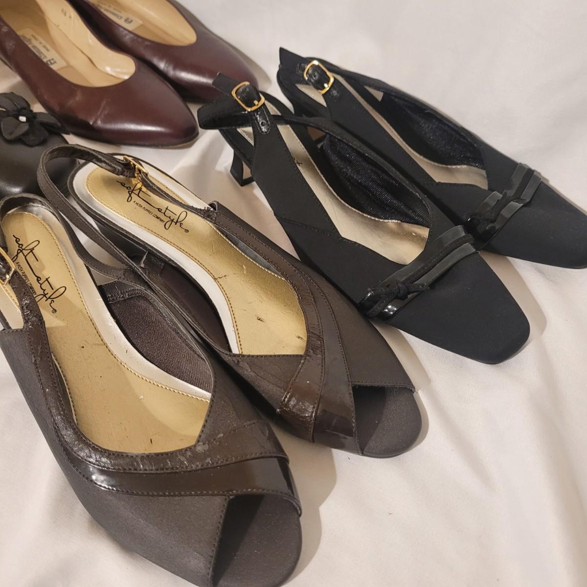This lot includes 11 pairs of low heels, with a size range of 7W to 8. Brands include Hush Puppies, Kim Rogers and more. Shipping available.