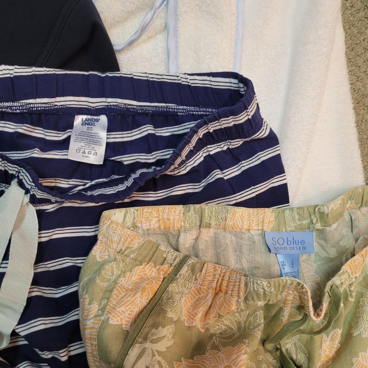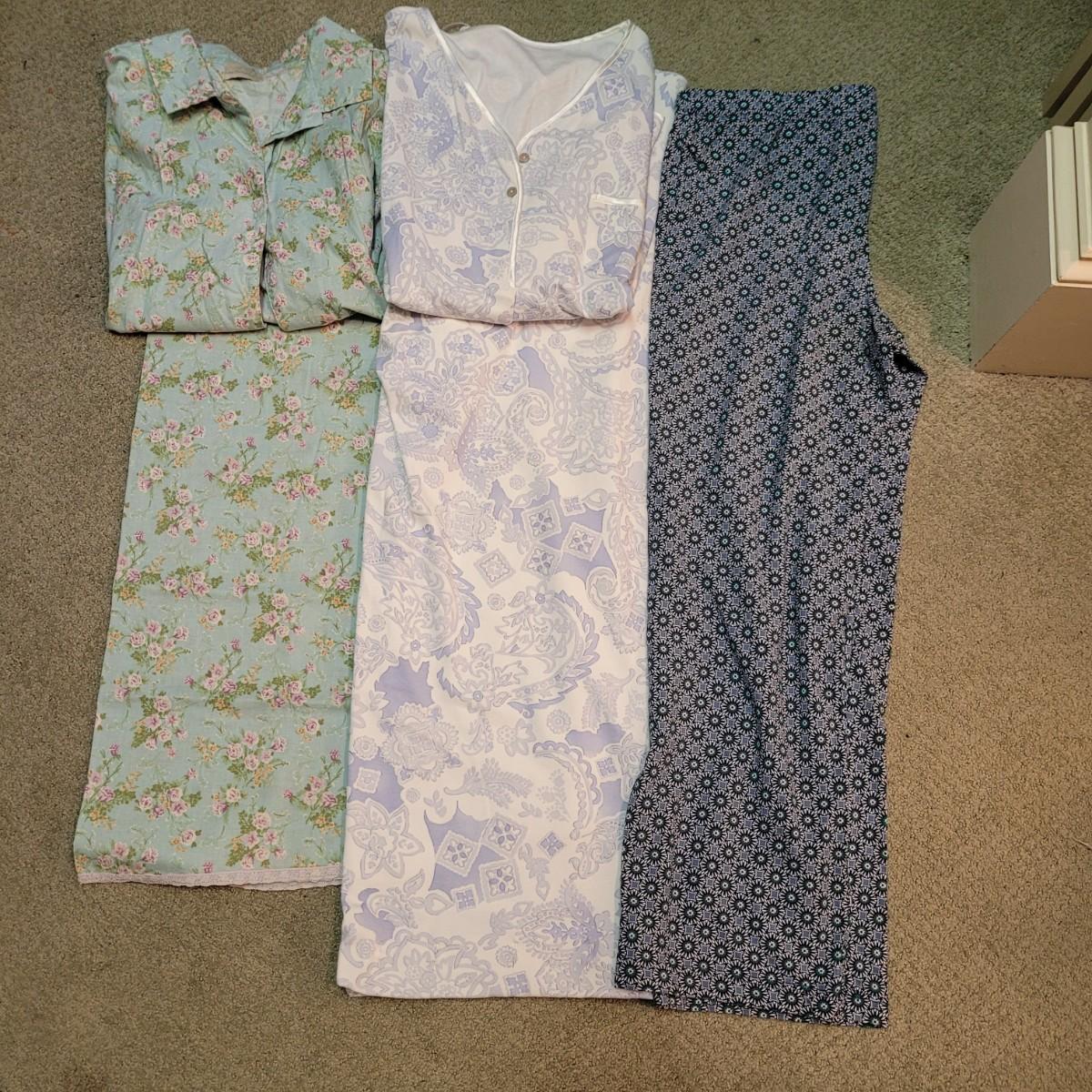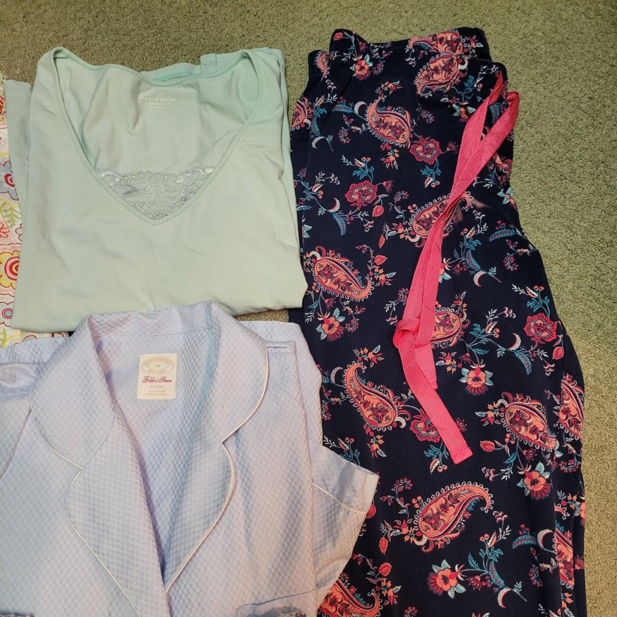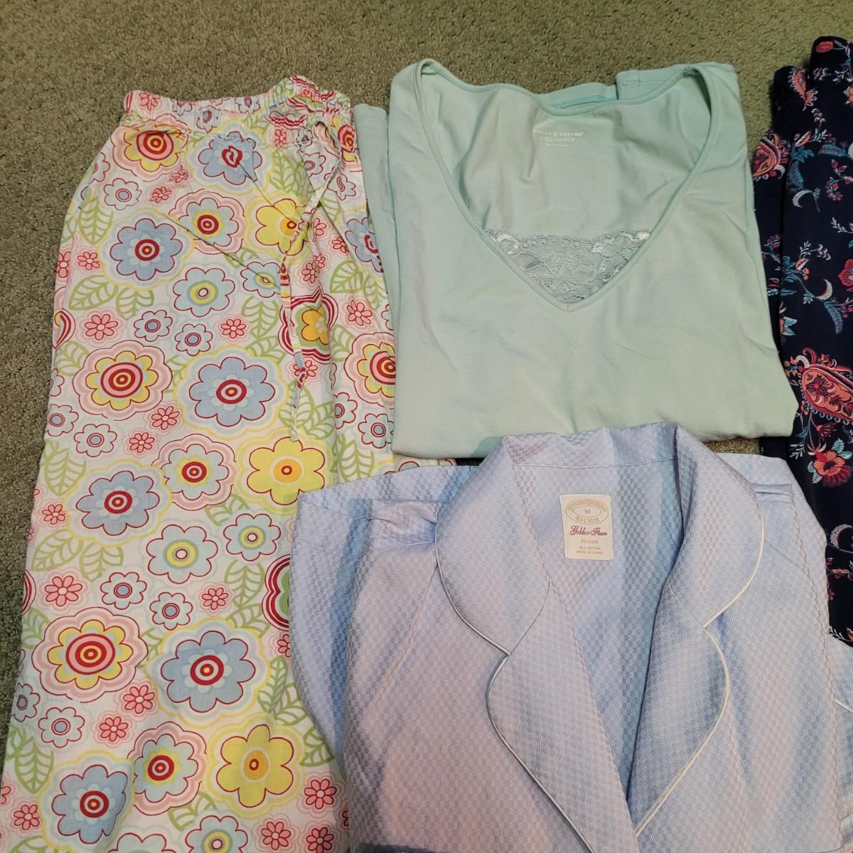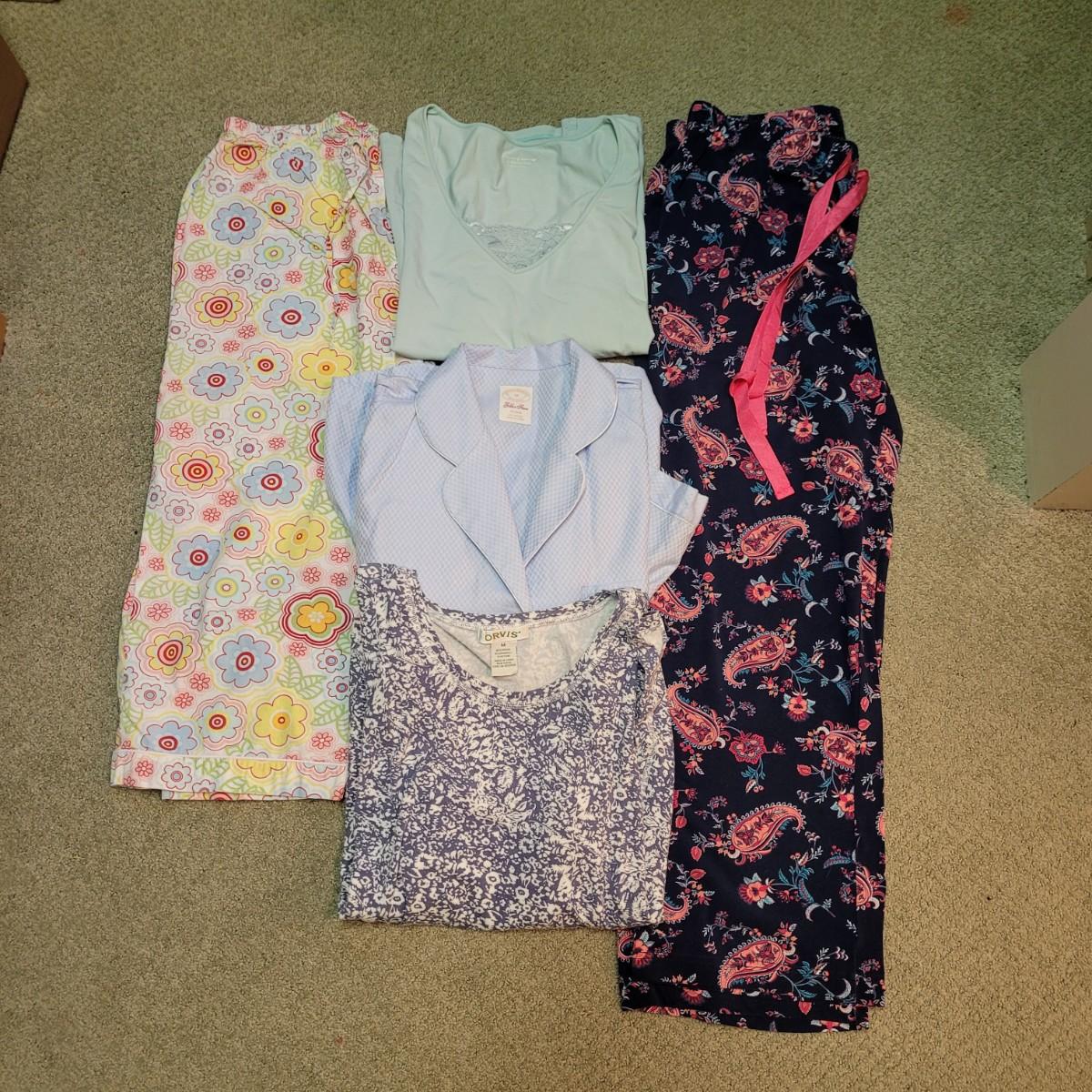 Large assortment of women’s pajamas, including drawstring pants, top and bottom sets, nightgowns and more, as well as terry cloth, fleece and satin robes. There is approximately 20 pieces of pajamas. Some stains on one top shown in an image. Shipping available.