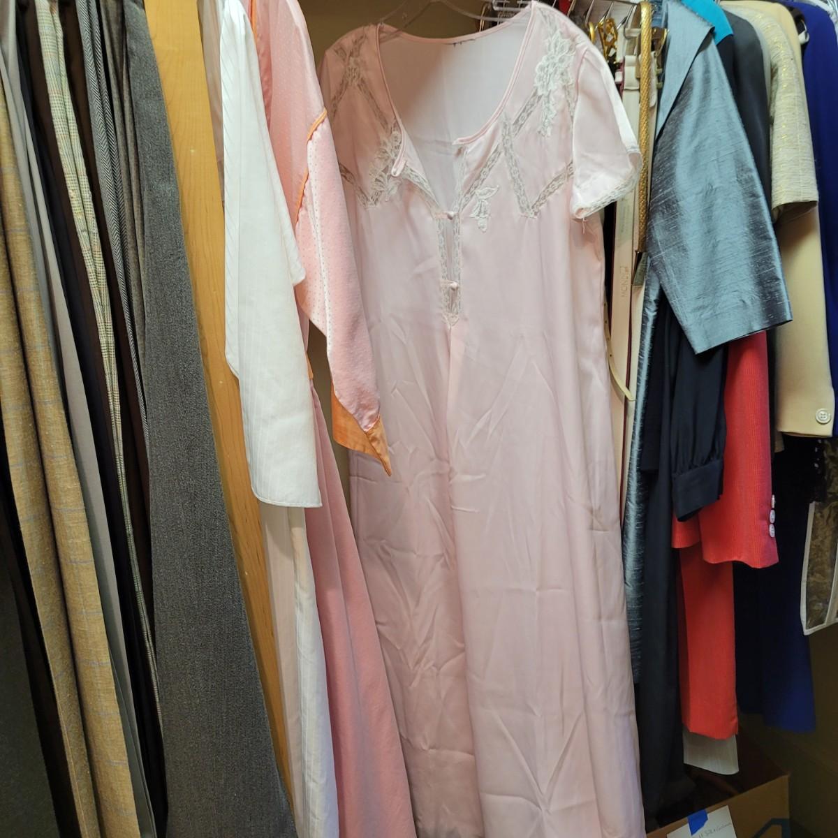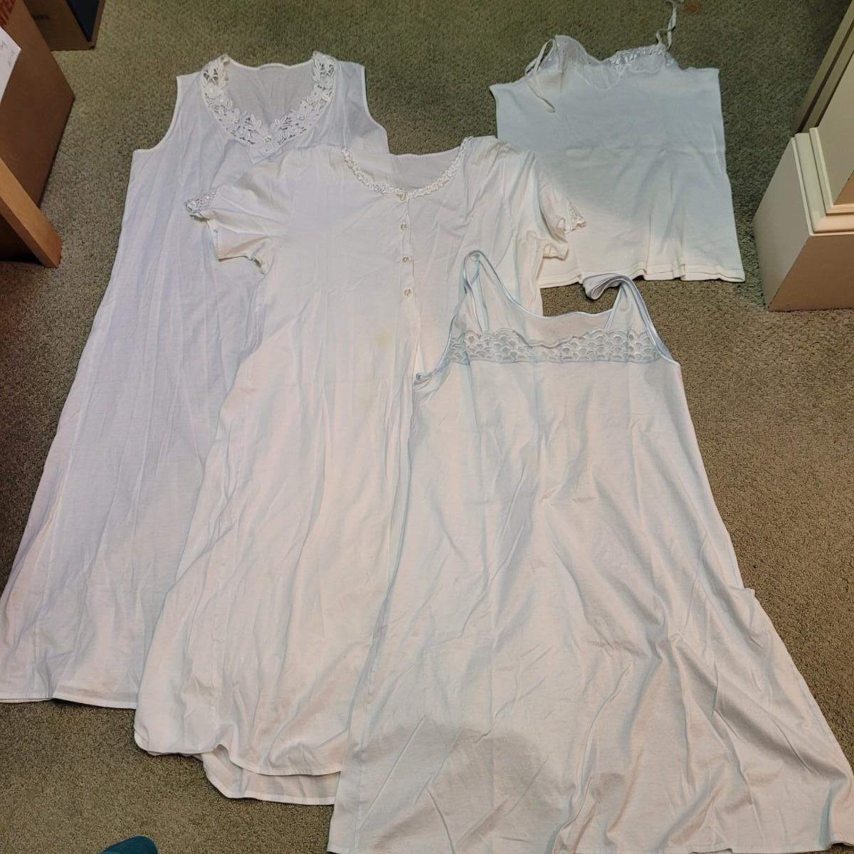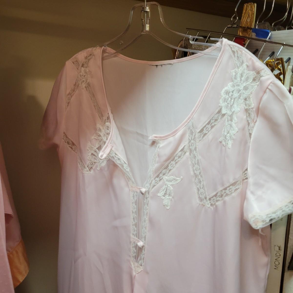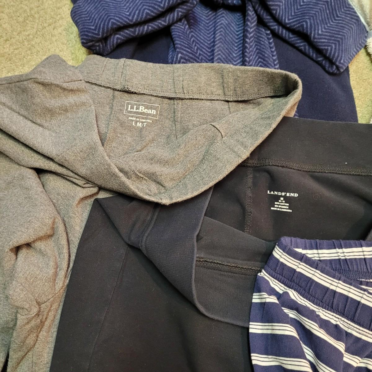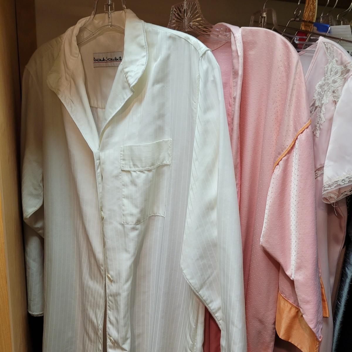 Large assortment of women’s pajamas, including drawstring pants, top and bottom sets, nightgowns and more, as well as terry cloth, fleece and satin robes. There is approximately 20 pieces of pajamas. Some stains on one top shown in an image. Shipping available.