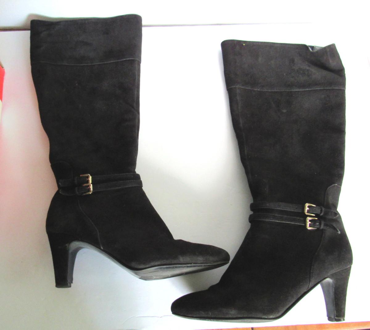 Nice shape, lightly used, has minor wear in some spots, still looks nice. Very long zipper, both good. About 18" tall sole to top. Decorative bands and buckles at ankles. Shipping is available at actual shipping cost plus $5.00 handling fee per box for supplies/labor. See our terms for details. All sales are final. Condition notes may not be all inclusive, we may miss some issues as most vintage items are not in mint condition and have some degree of wear, paint loss, etc, but we always try to note obvious damage.