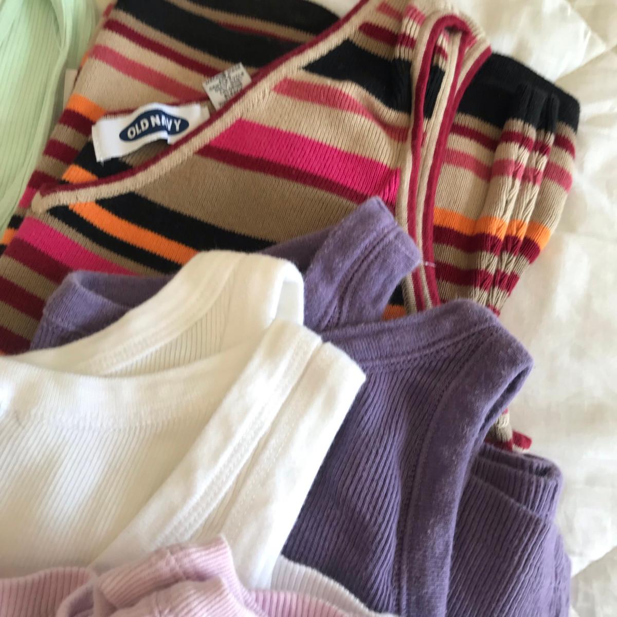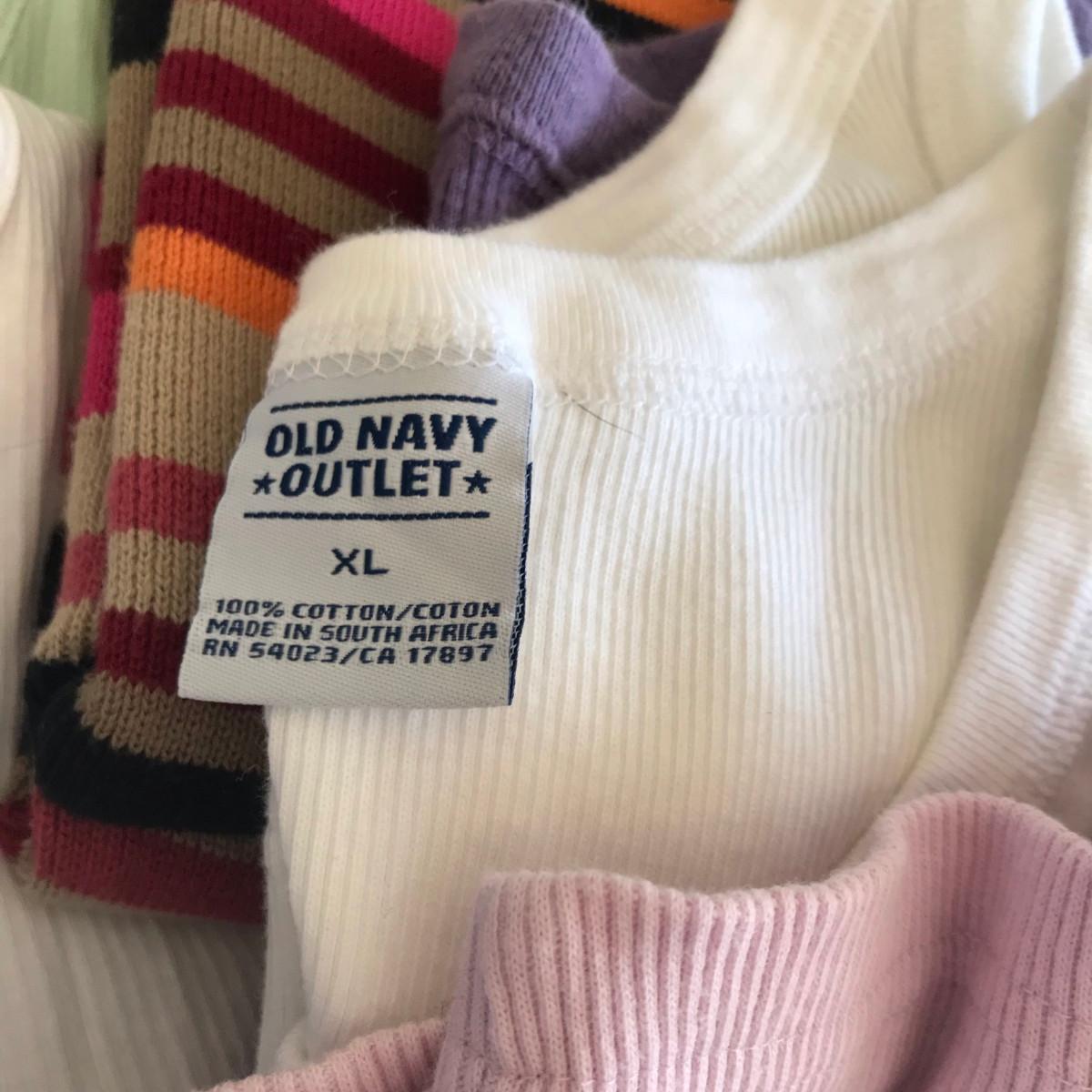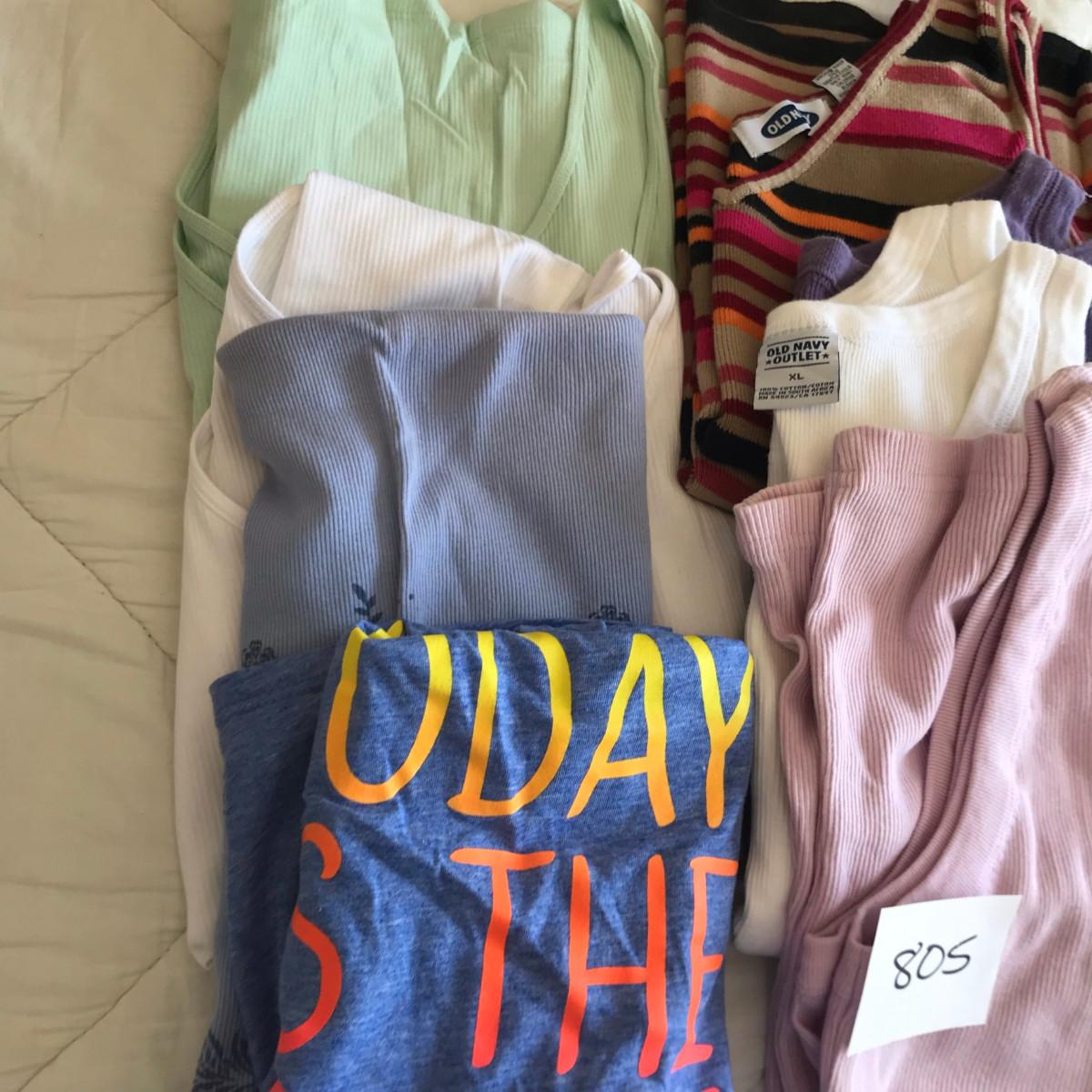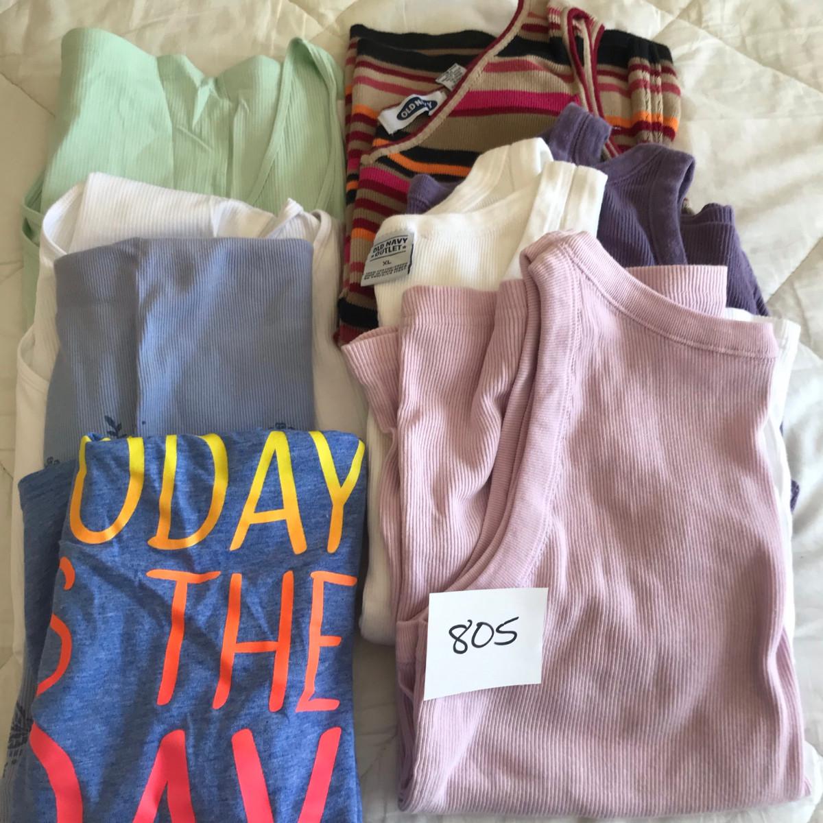 On clothing: New, some with tags! Please see photos for quantity, colors, size, and condition. Please, also most items are Large or XL in women's clothing.