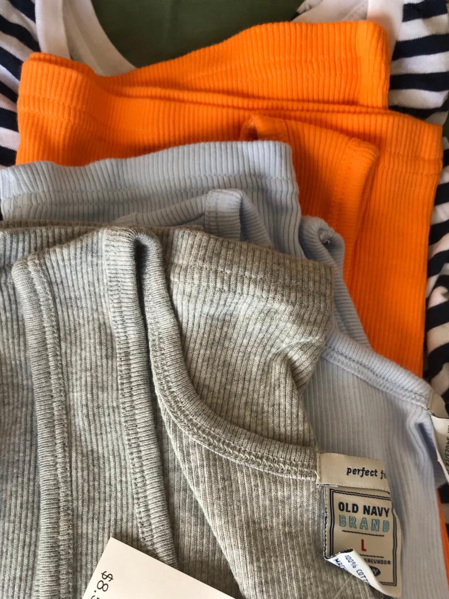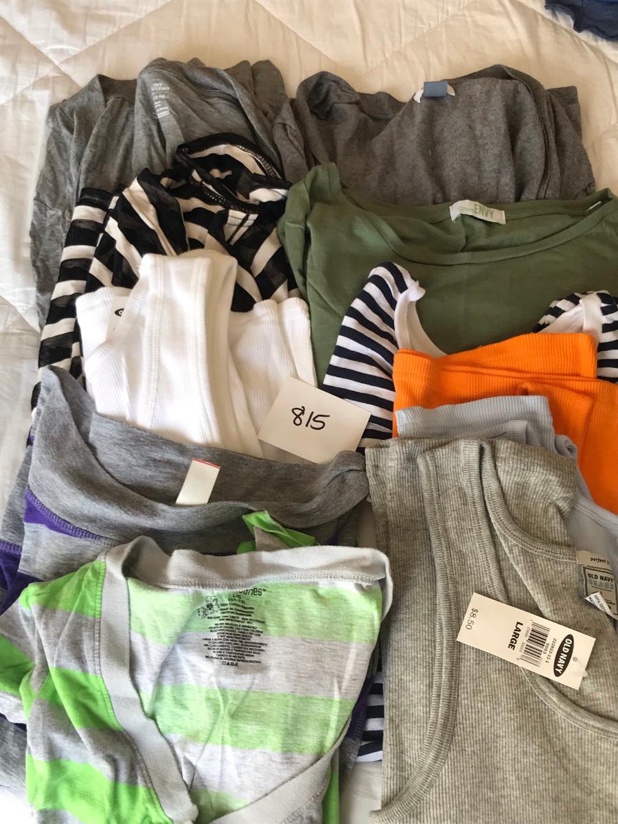 On clothing: New, some with tags! Please see photos for quantity, colors, size, and condition. Please, also most items are Large or XL in women's clothing.