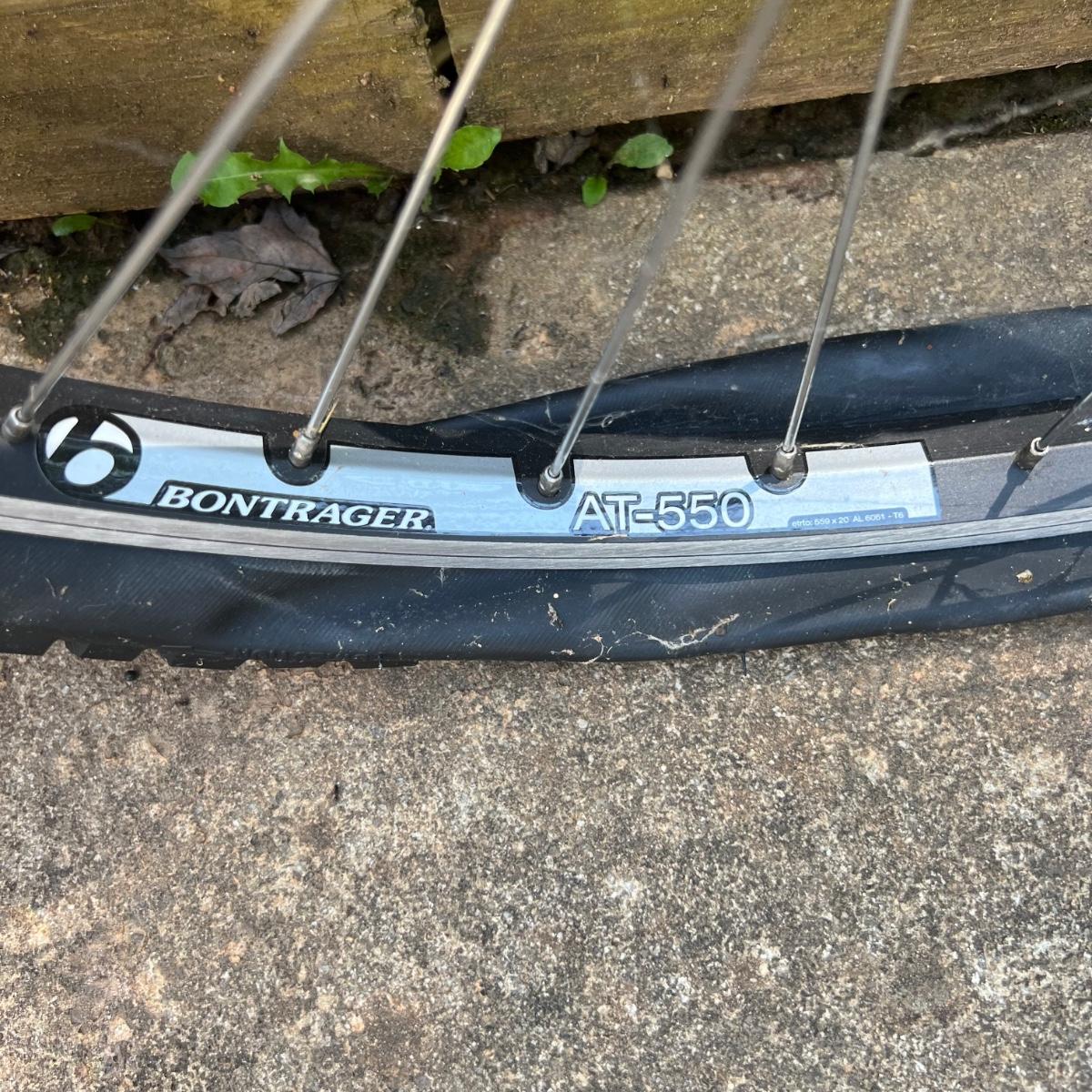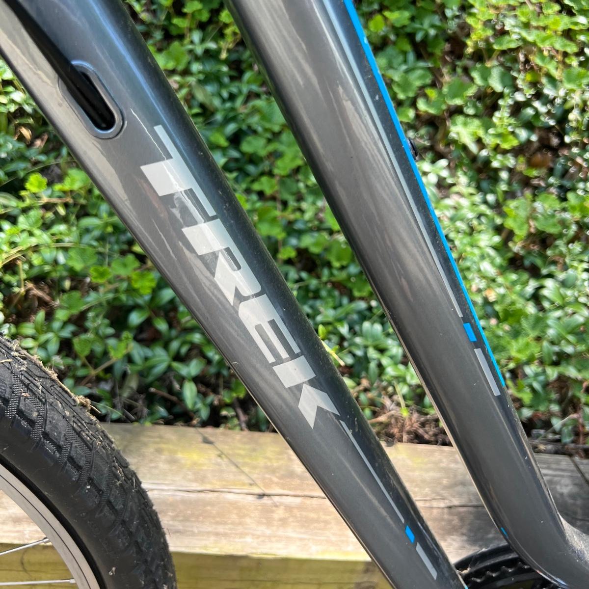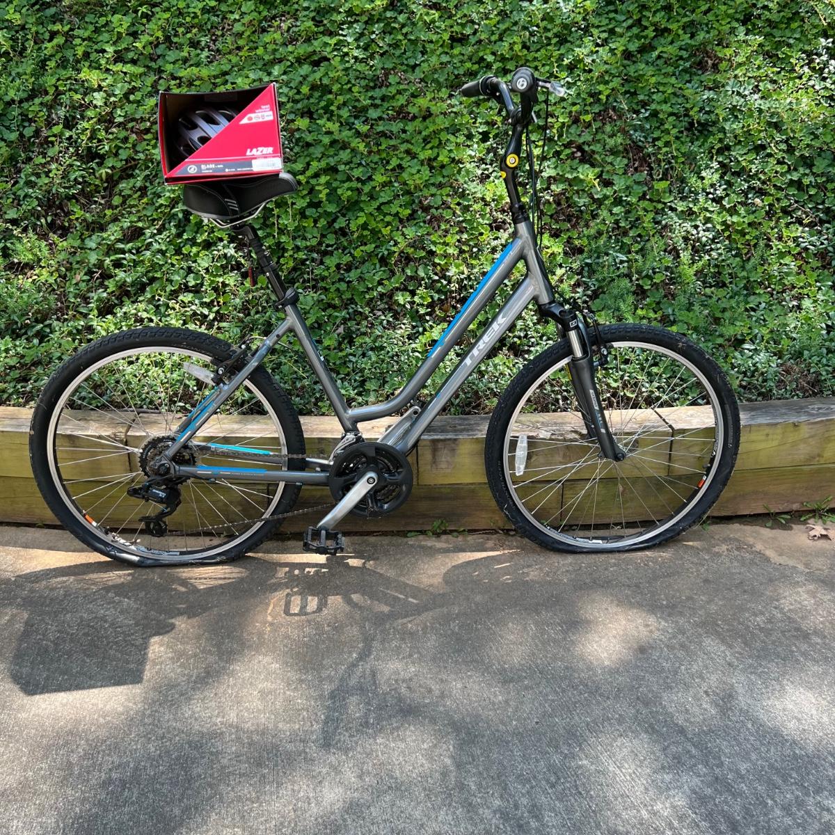 Women’s Trek Bike and Lazer Blade MIPS helmet size small. All component parts are photographed where names can be identified for each piece of equipment. WTU008C0493L is the identifier on the frame. The tires are flat.