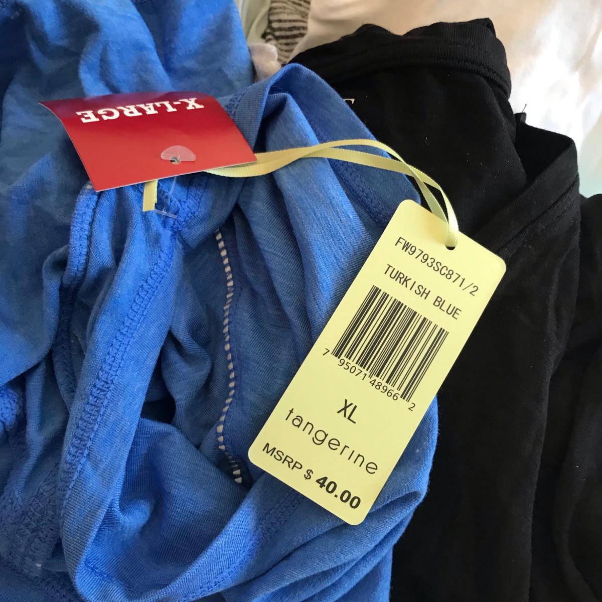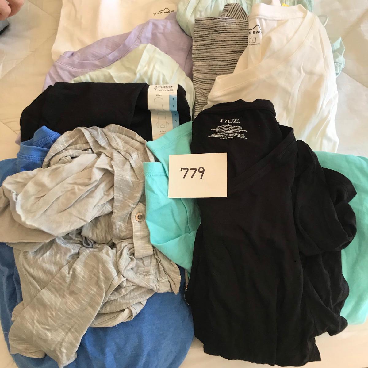On clothing: New, some with tags! Please see photos for quantity, colors, size, and condition. Please, also most items are Large or XL in women's clothing.