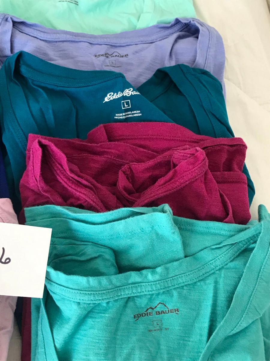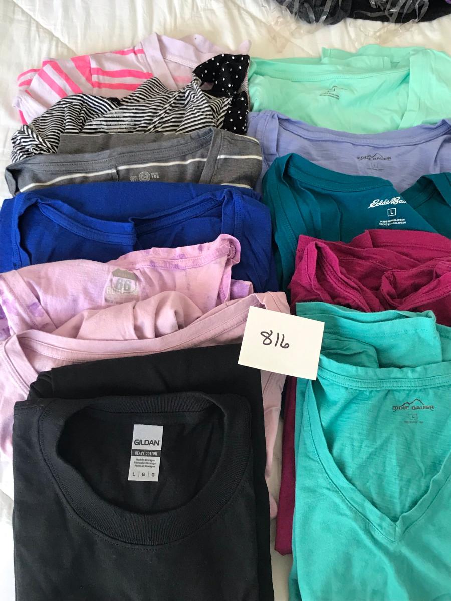 On clothing: New, some with tags! Please see photos for quantity, colors, size, and condition. Please, also most items are Large or XL in women's clothing.