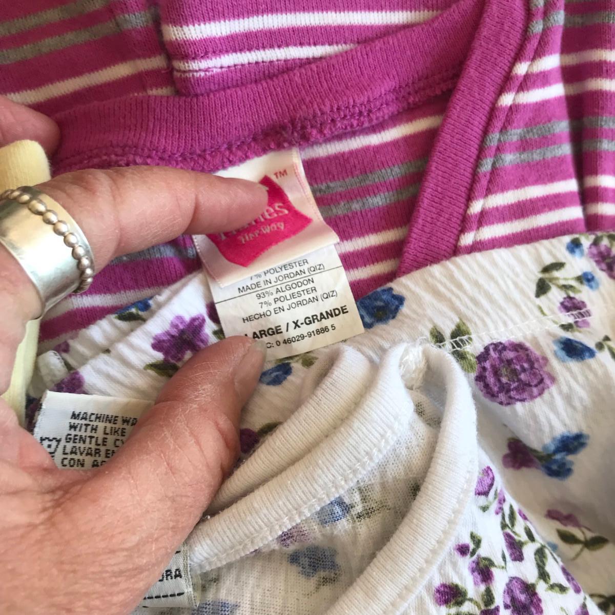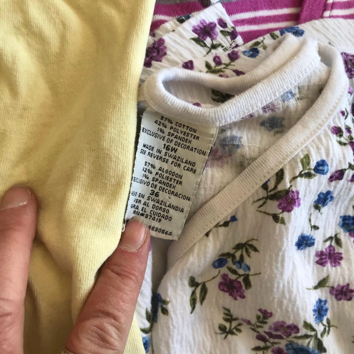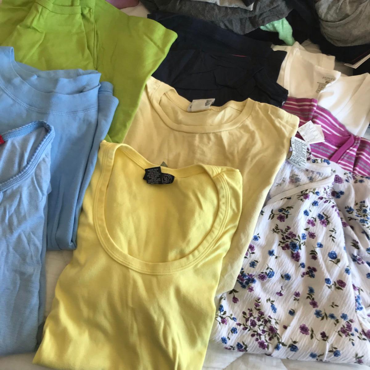 On clothing: New, some with tags! Please see photos for quantity, colors, size, and condition. Please, also most items are Large or XL in women's clothing.
