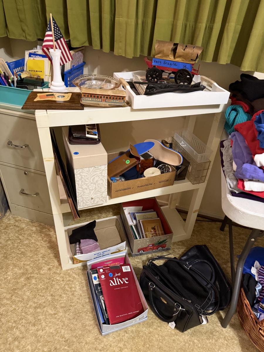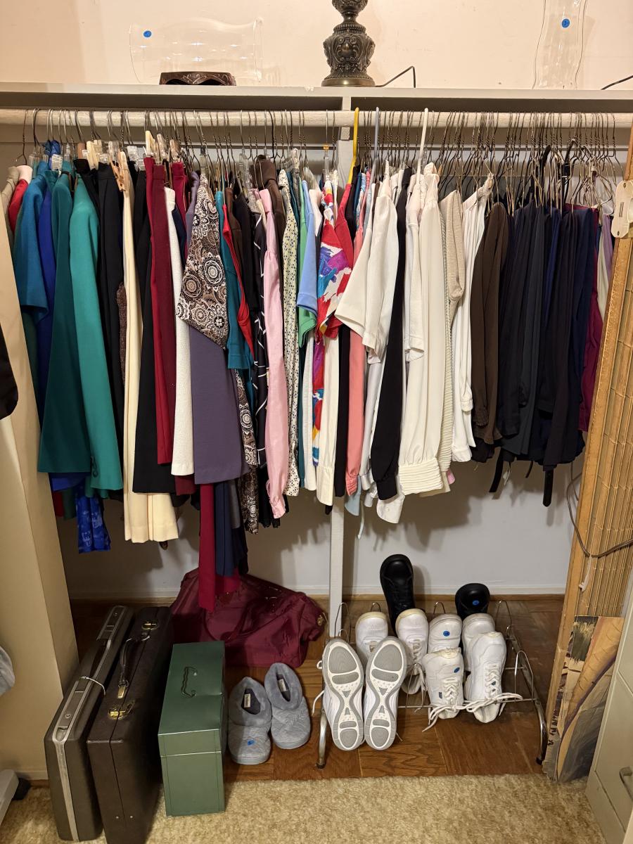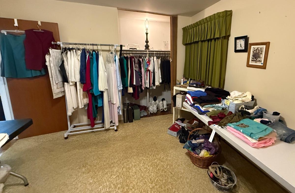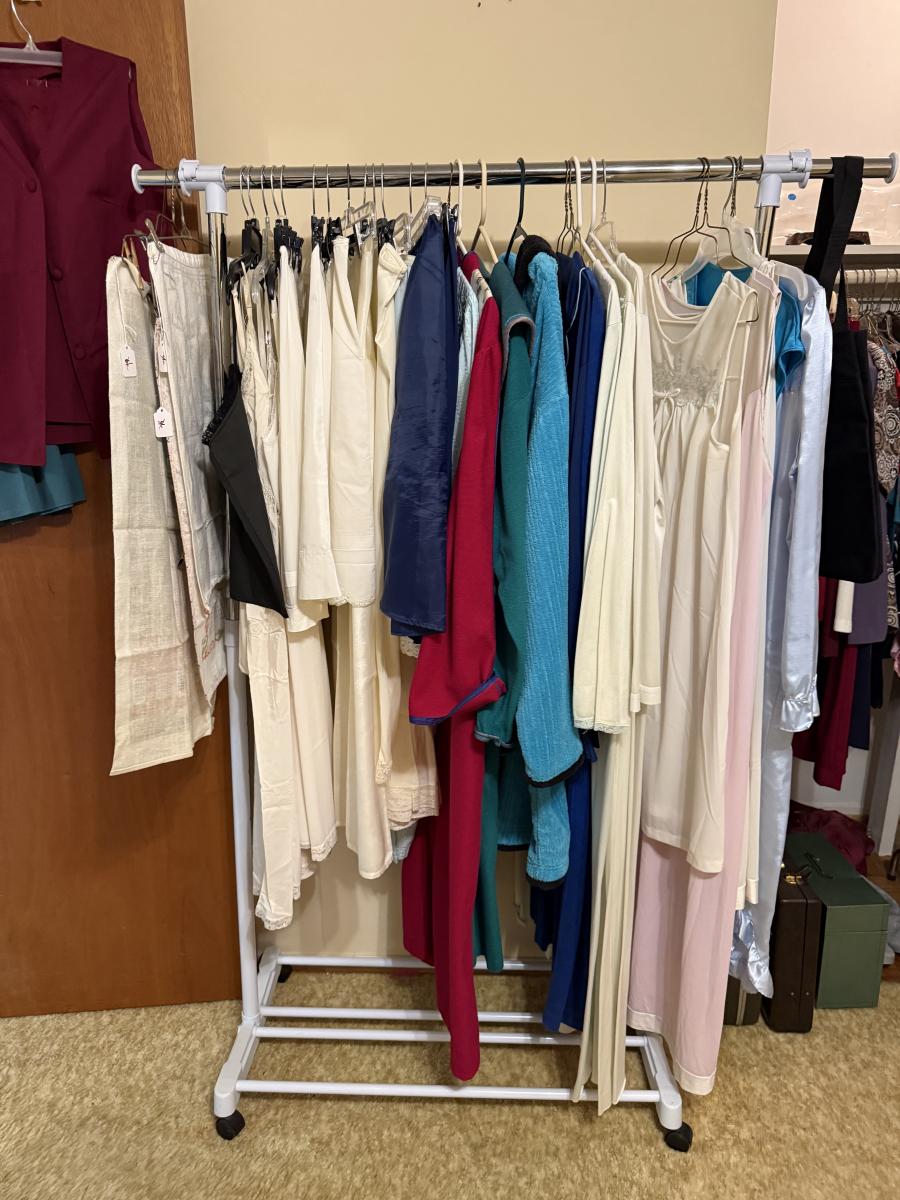 Women’s vintage clothing, shoes, purses, art work, file cabinet, clothes rack, curtains,