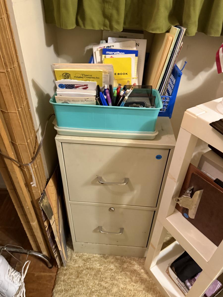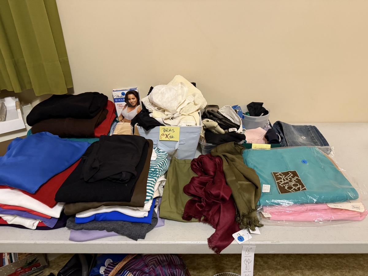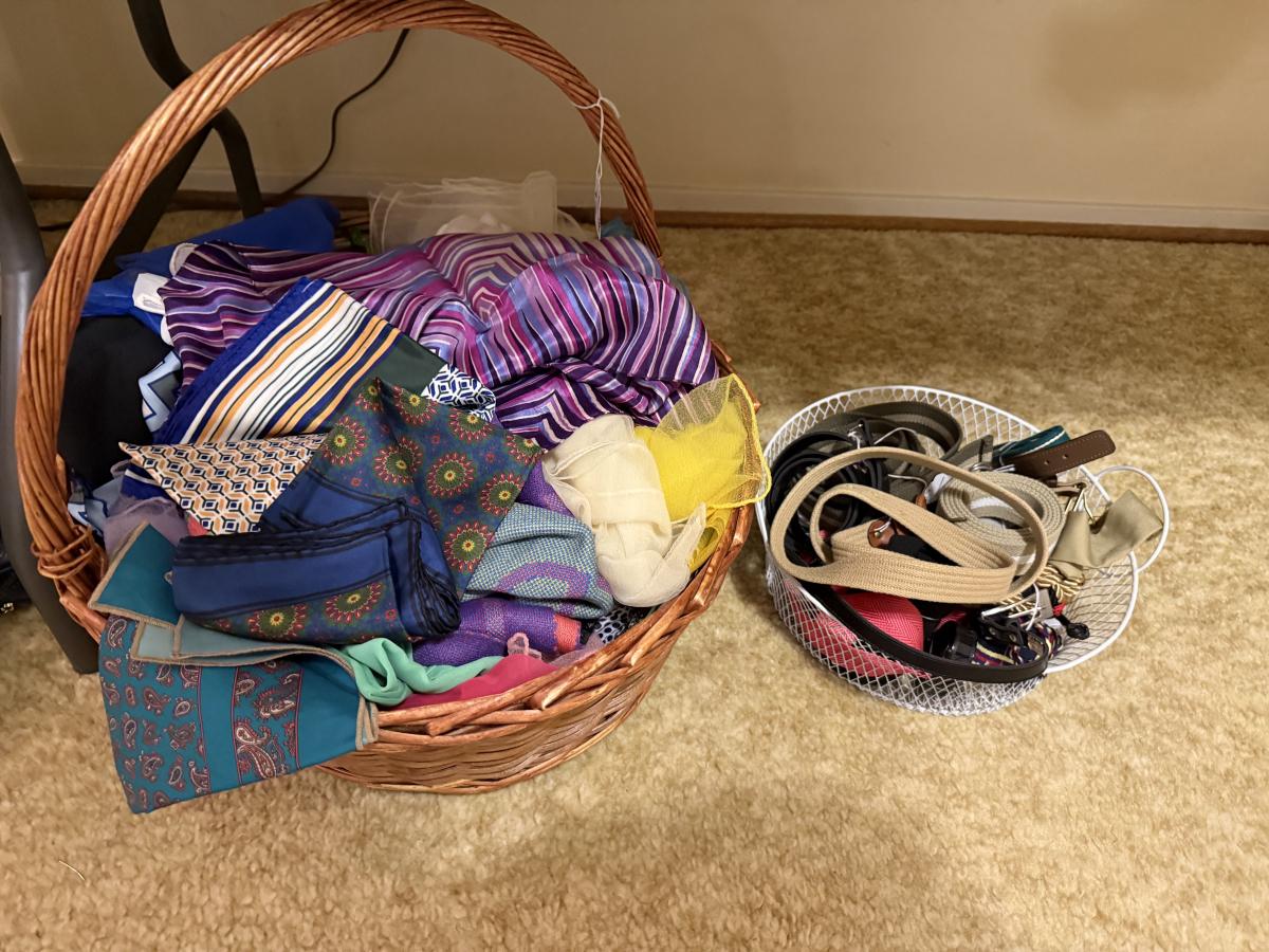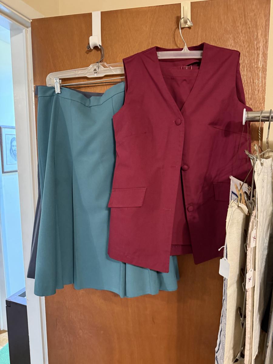 Women’s vintage clothing, shoes, purses, art work, file cabinet, clothes rack, curtains,
