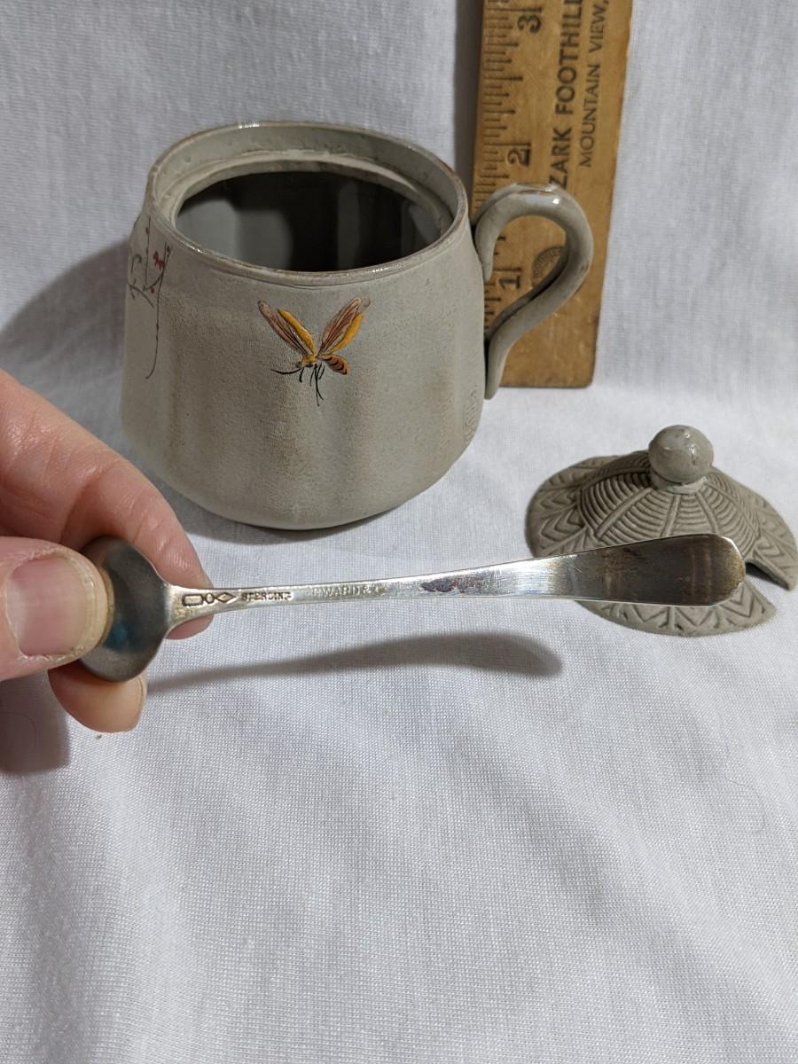 Wonderful Detailed, Hand Painted Mustard Pot with Sterling Silver Spoon