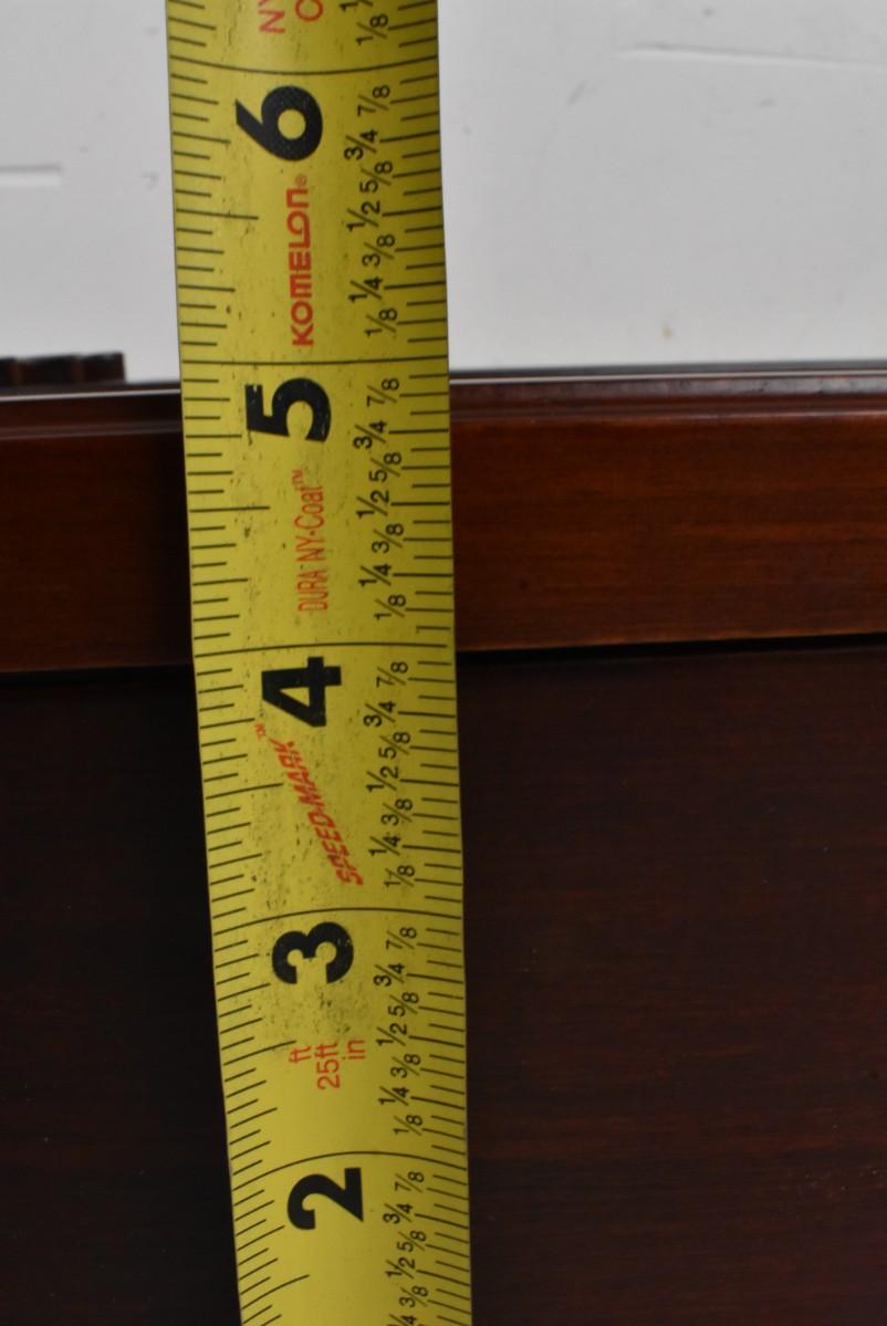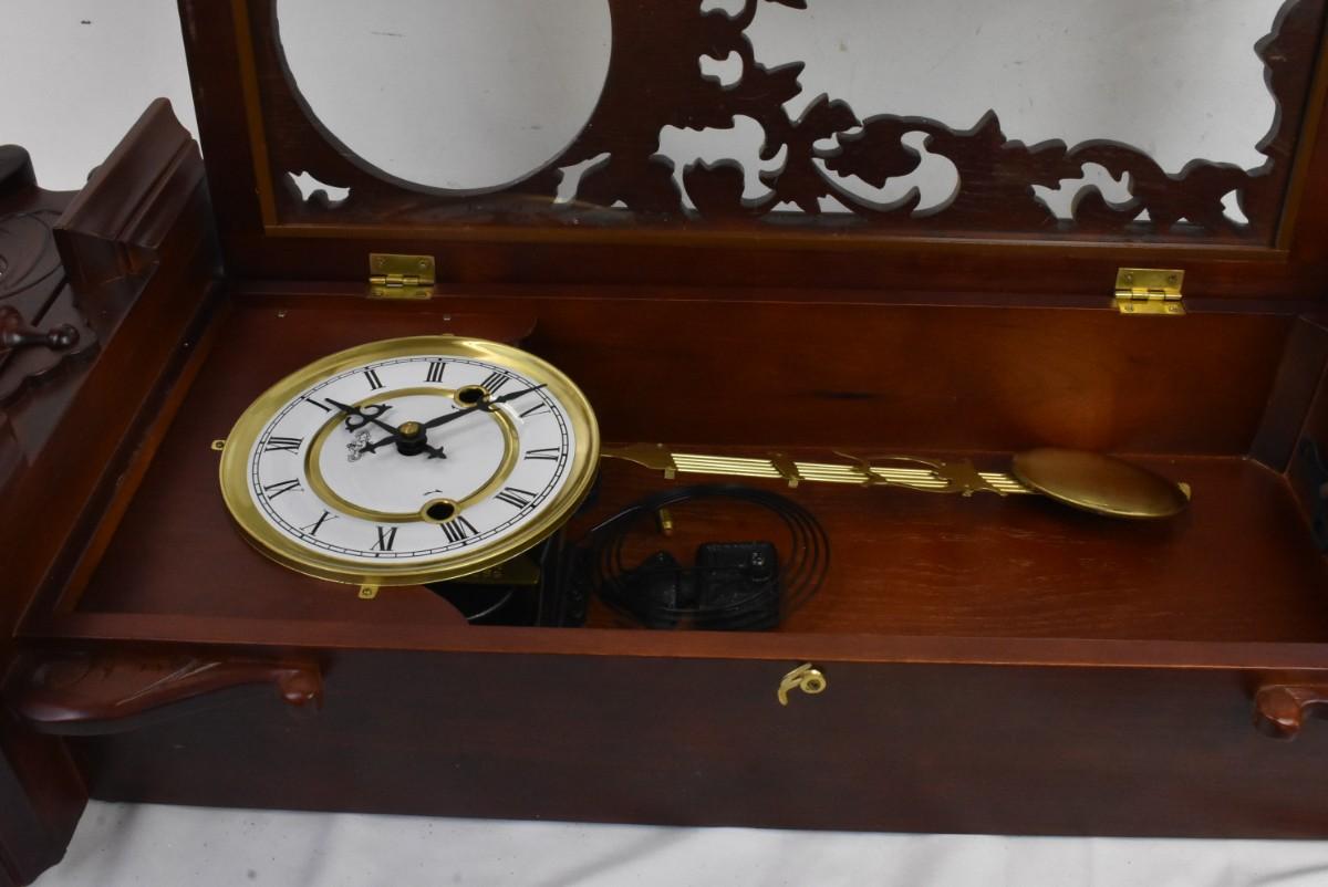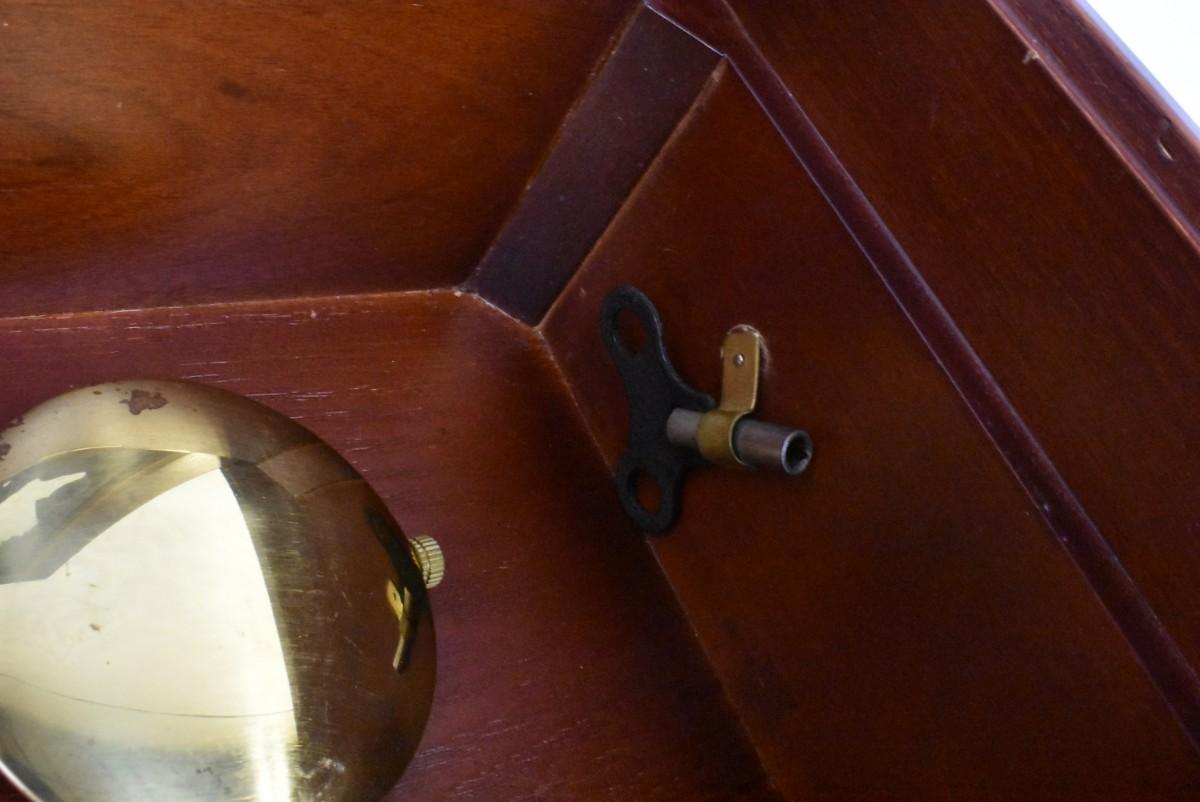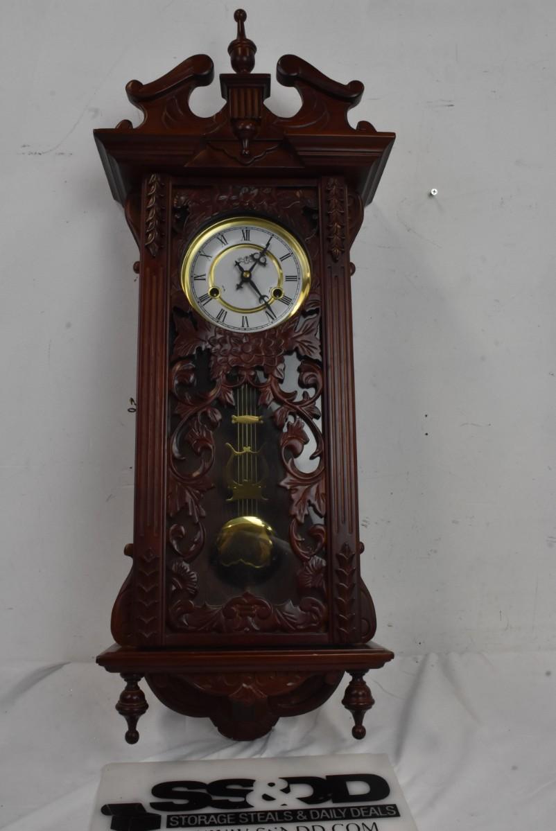 Wood Grandfather clock with key, hangs only mahogany colored wood