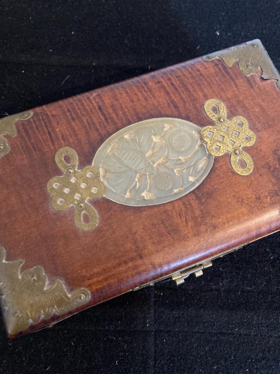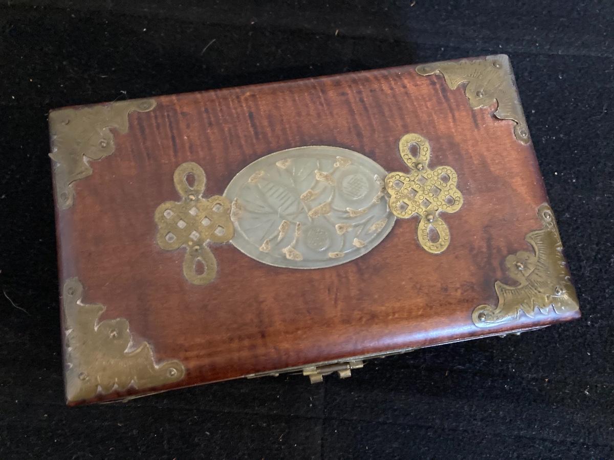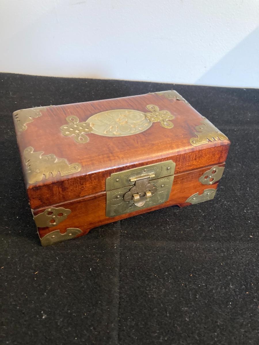 Wood and Brass Jewelry Box with Jade Top and Lock 6.5”w x 4”d