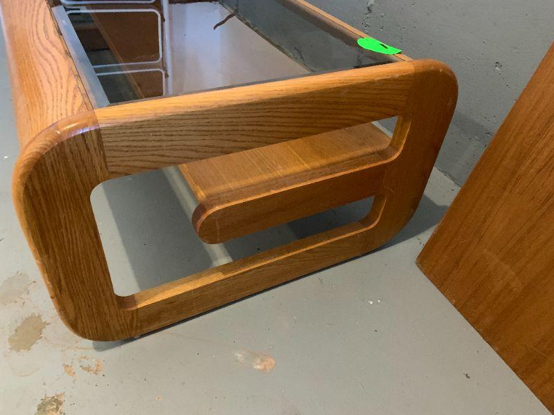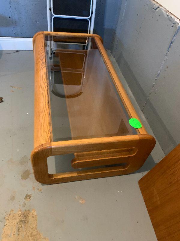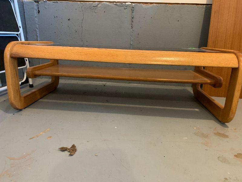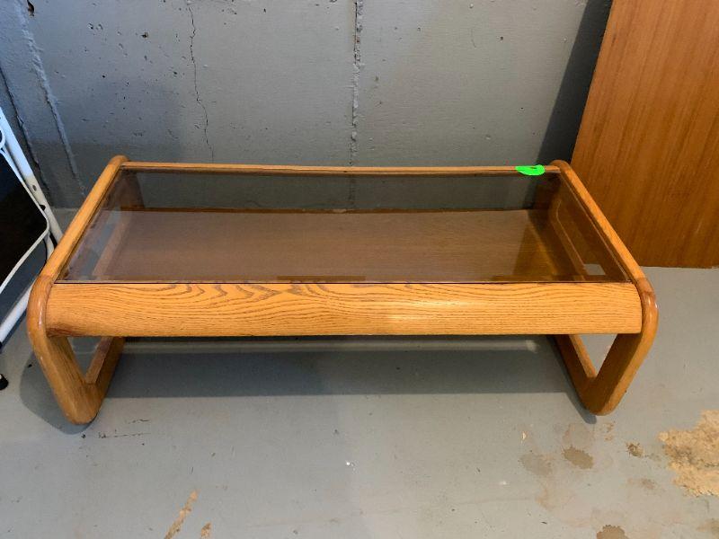 Solid wood coffee table with removable glass top. Features one shelf underneath.