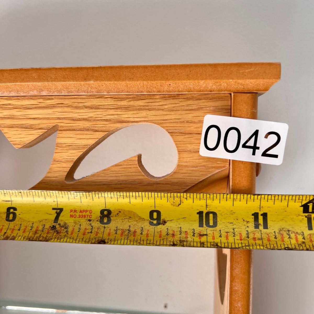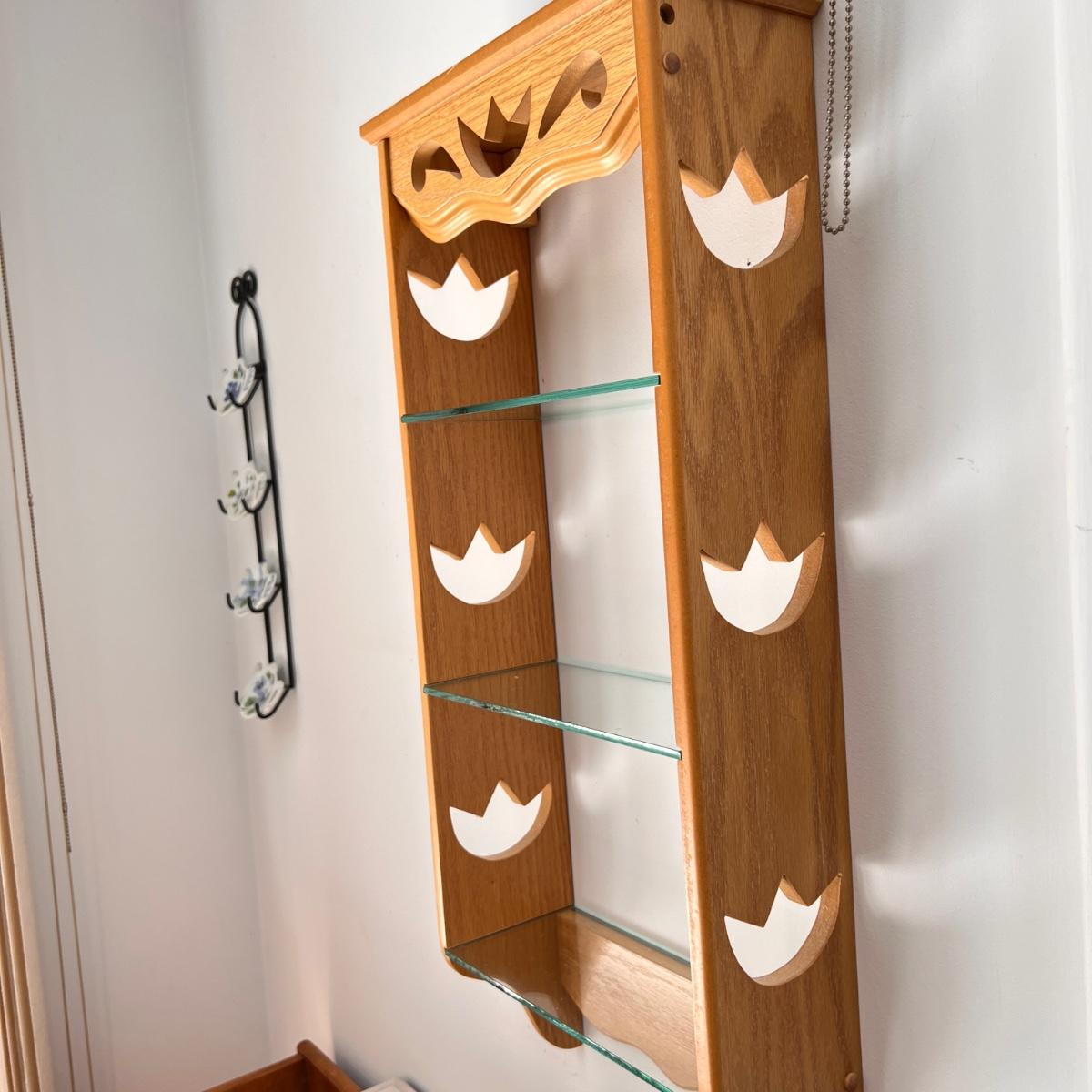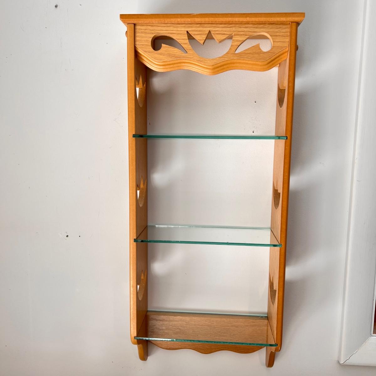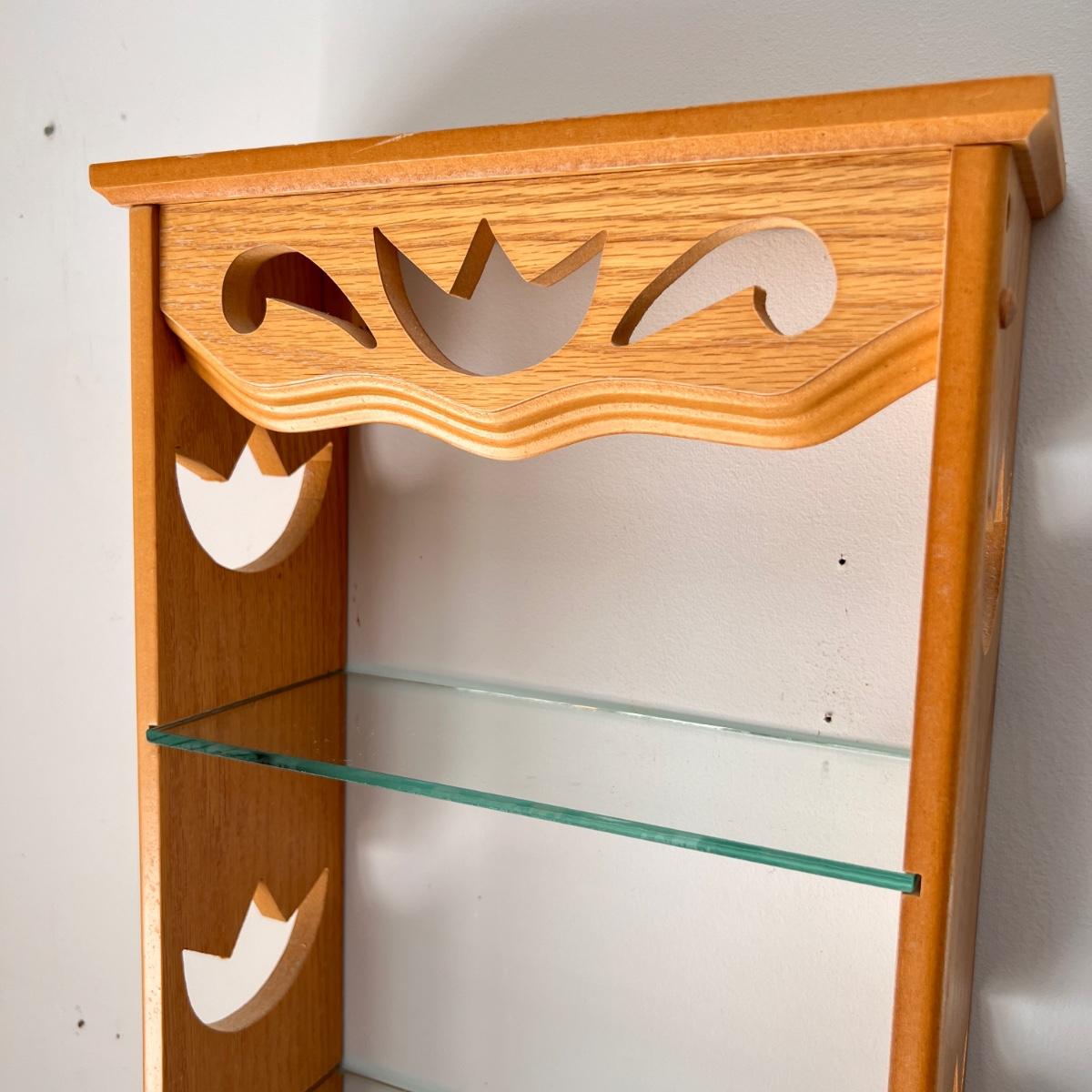 Vintage Wood and glass wall shelf with tulip cut outs on front and down the sides. Rustic cottage style decor.