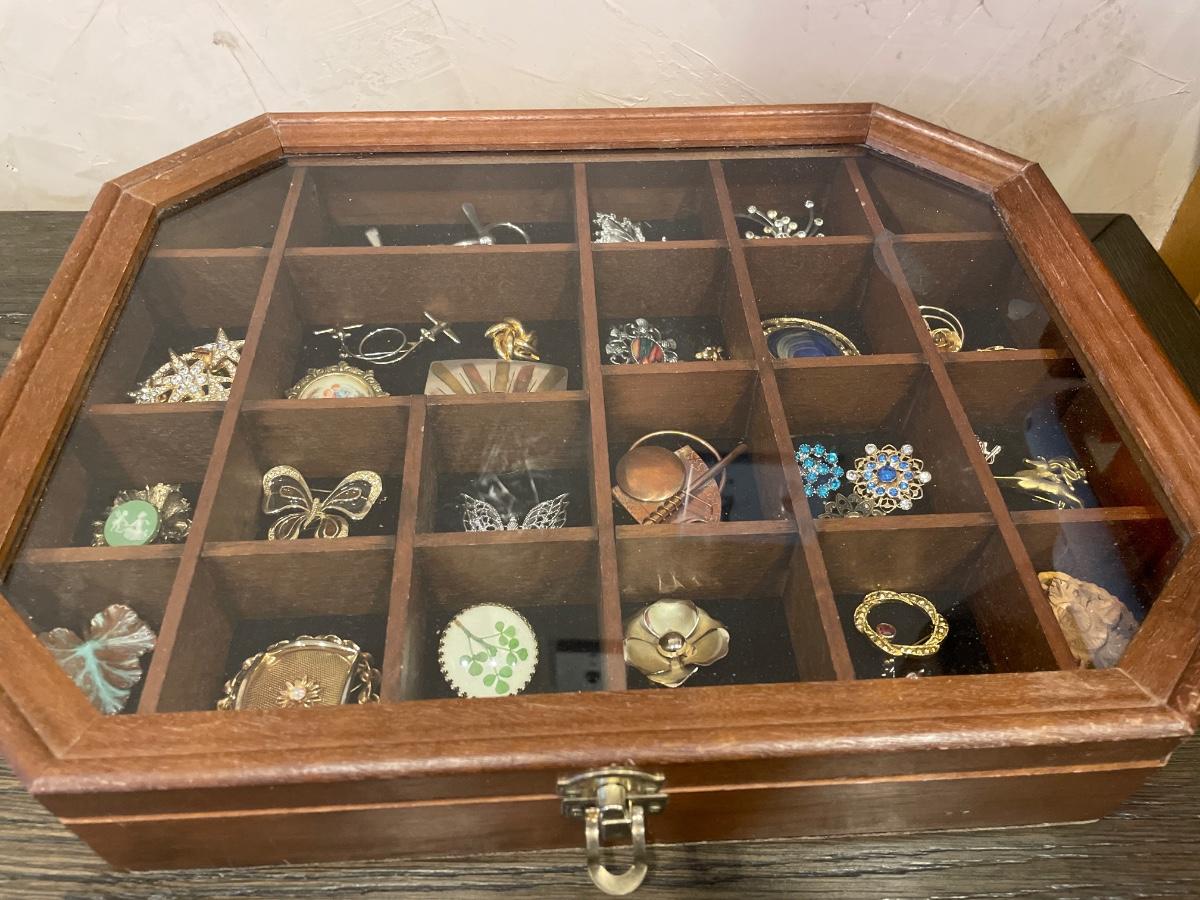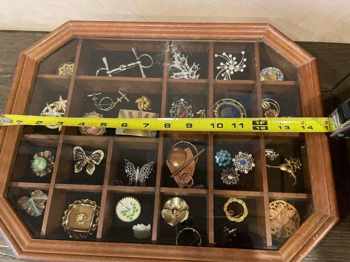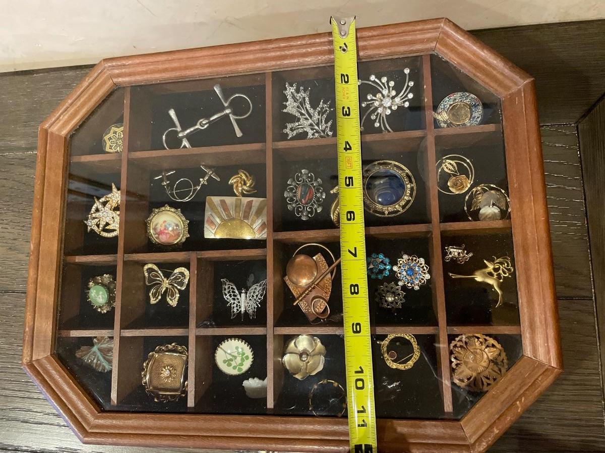Wood & glass top display case with 34 brooches