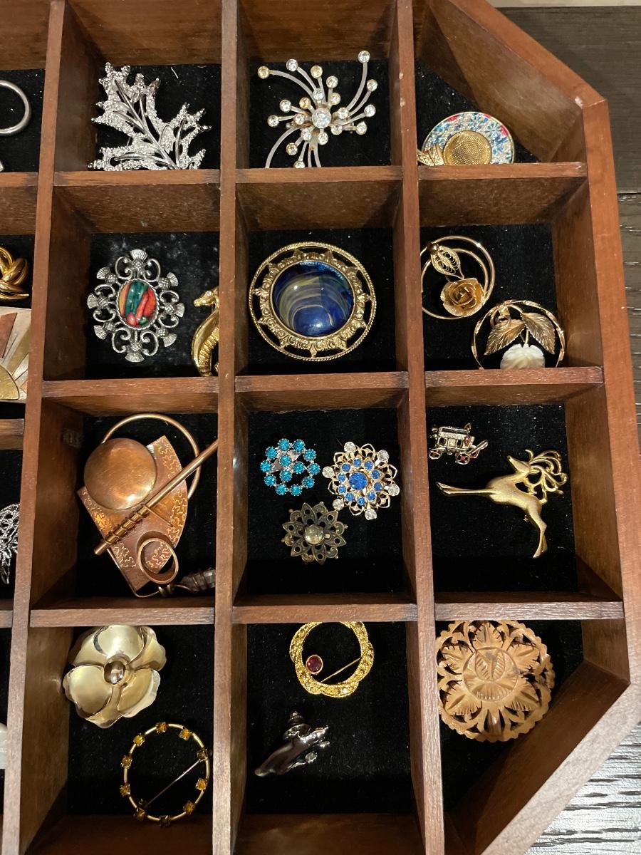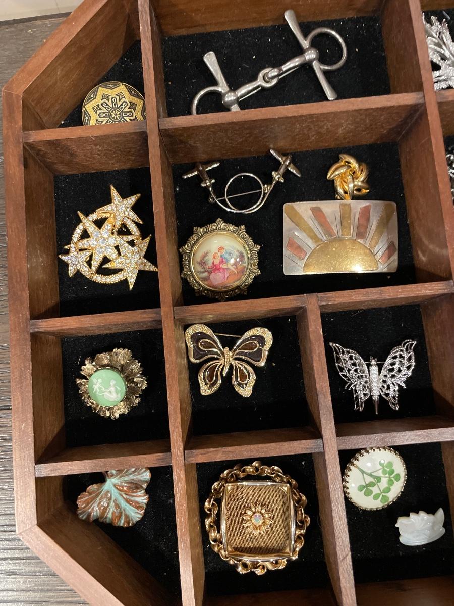 A lovely collection of different brooches in a display case that can be hung on the wall to showcase all of your great collection of trinkets! Includes 34 different brooches