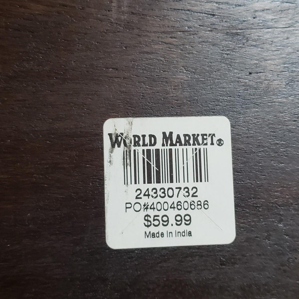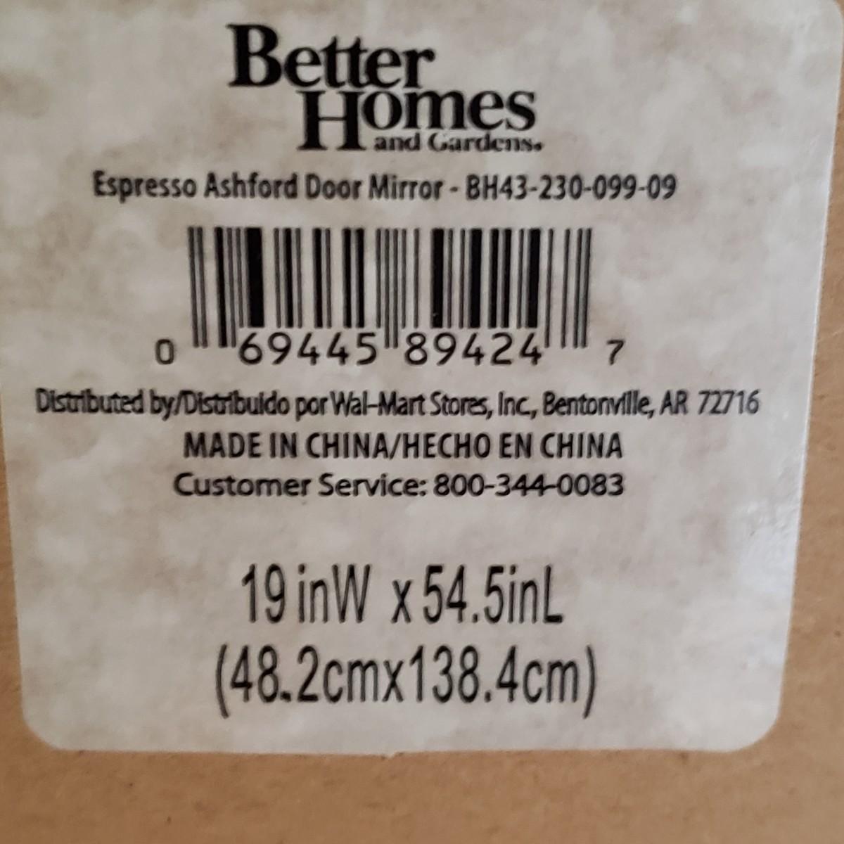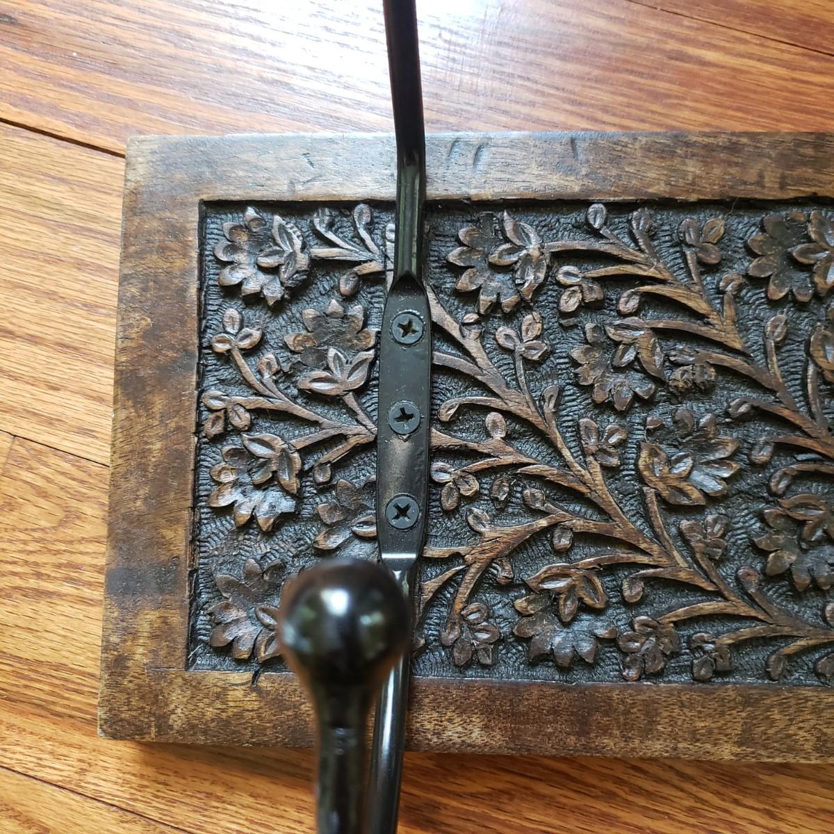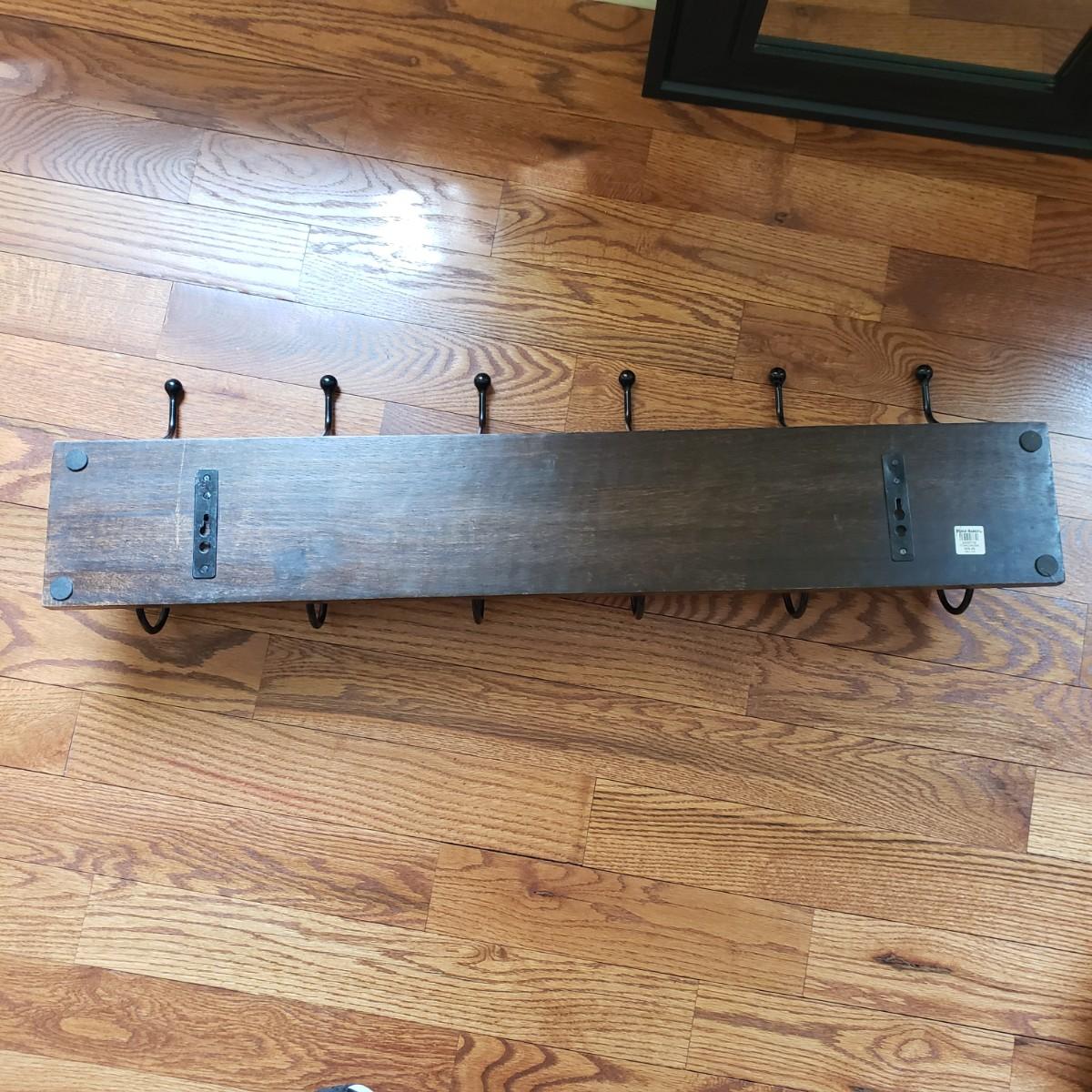 This lot contains a ornate wood coat rack with six metal hangers from World Market, which measures 35" x 6"H. The rack is a bit heavy. It has two screw attachments on the back. The floor length mirror has a plastic frame, also with two screw hangers and measures 19" x 55"H.