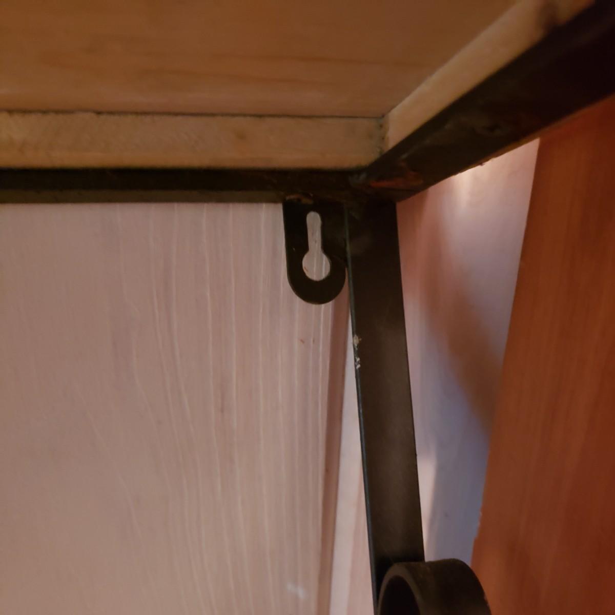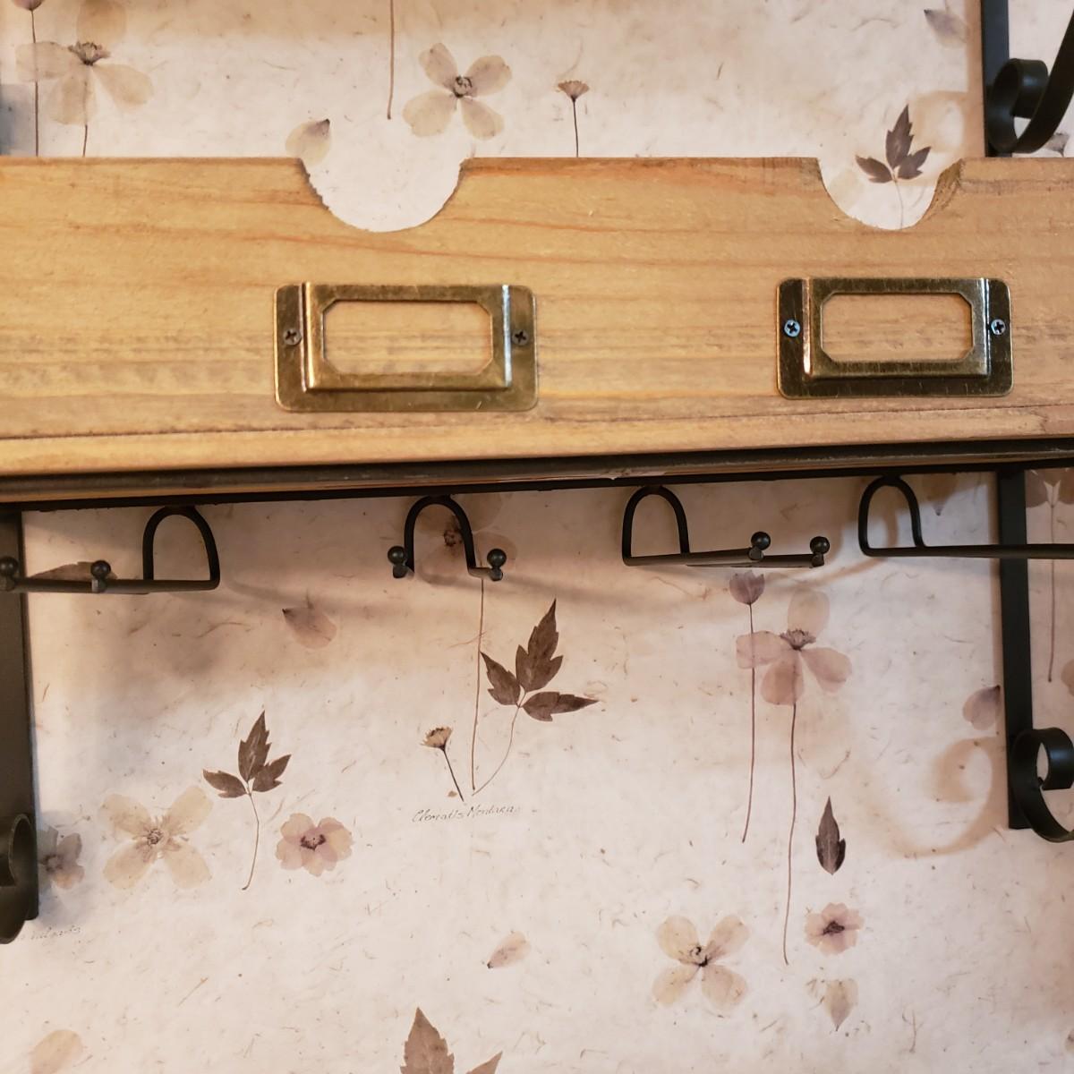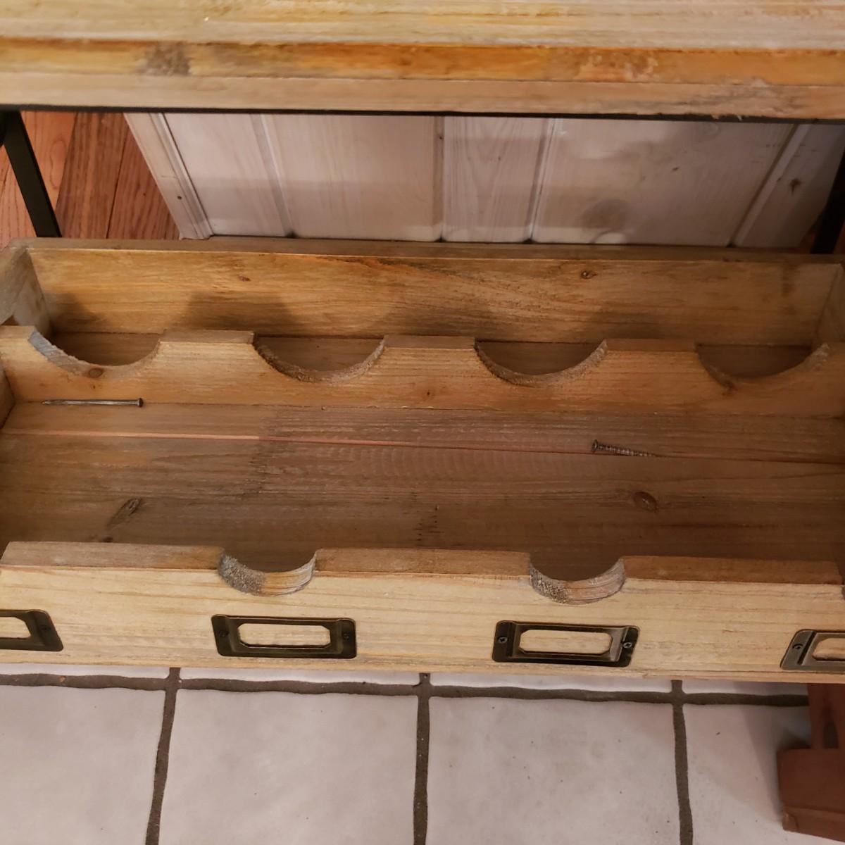 This wall hanging wine rack has space for four bottles of wine (11"x22"), a shelf (11"x22") and hanging metal racks for wine glasses. The entire unit measures 22" x 11" x 21"H. It attaches to the wall with two screw holes, see picture.