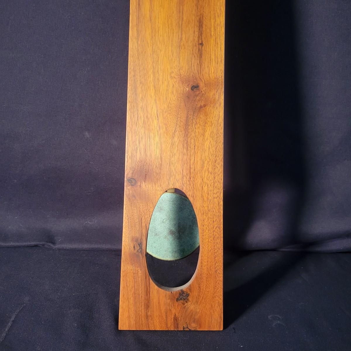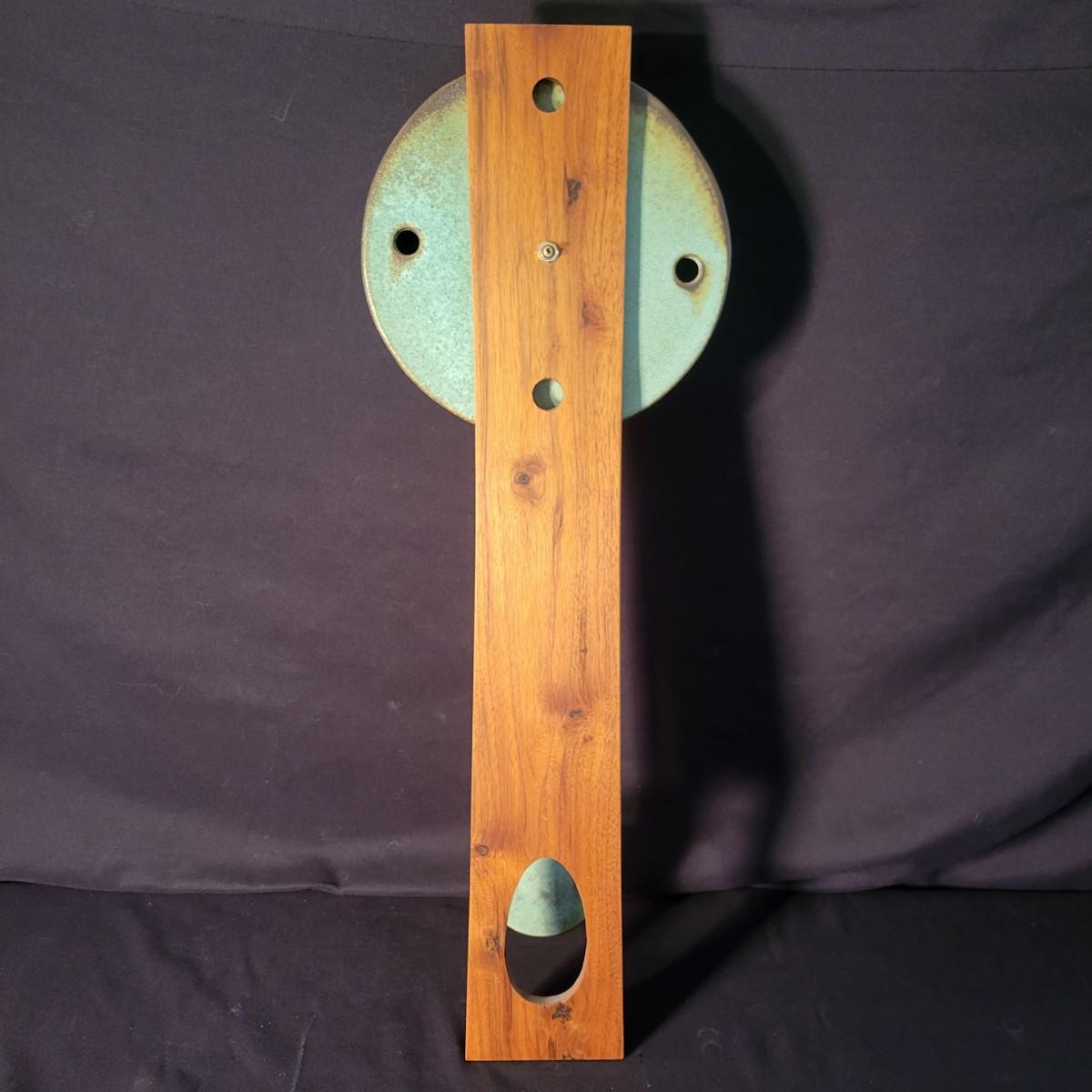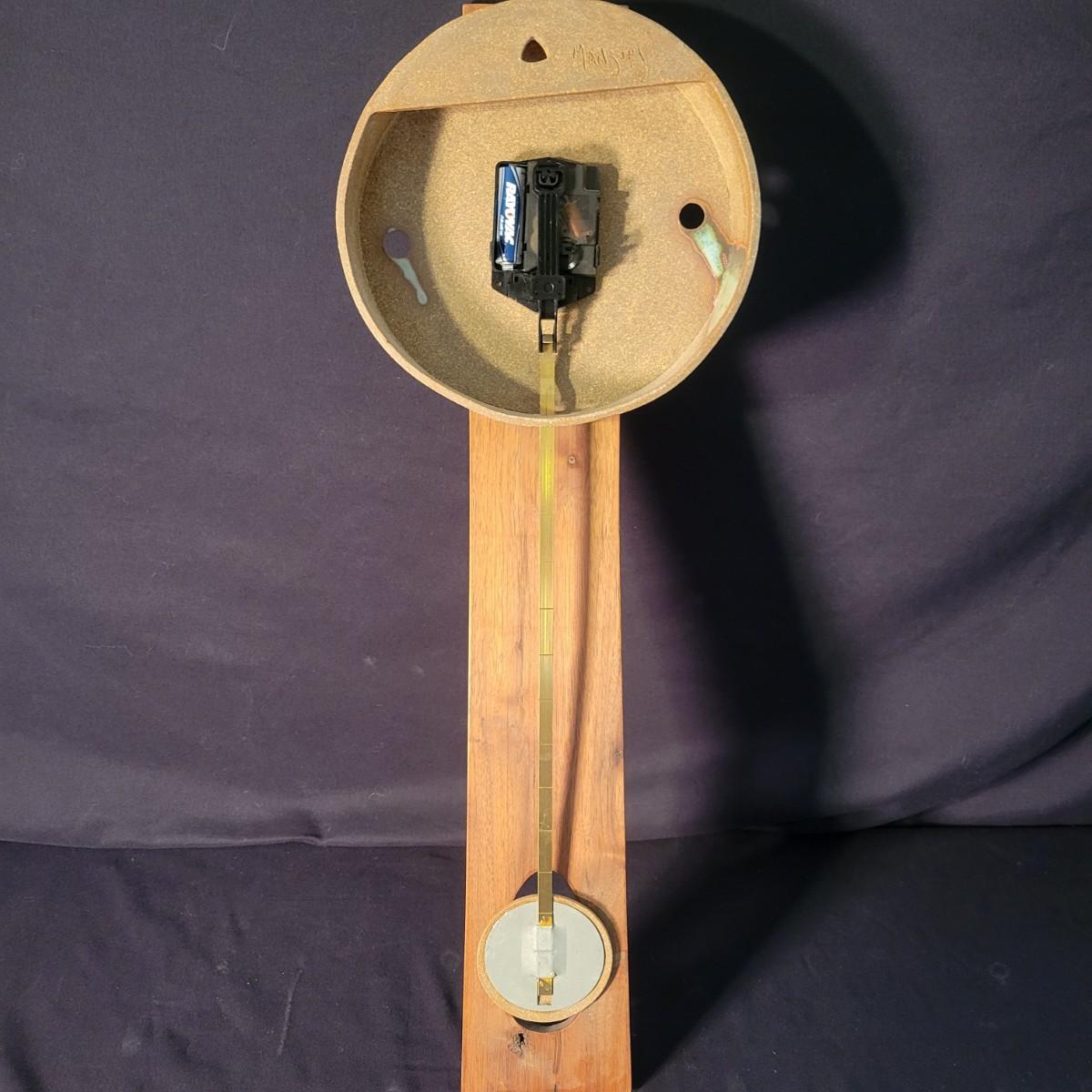 A wood and pottery clock body in good condition with no notable damage. The clock mechanics were not tested due to a dead battery and mechanism may need to be replaced since the hands are missing. The clock body has a modern look with a rustic feel. It's a combination of a glazed pottery face with wood body that has a rich brown stain measures approximately 8" x 24" x 2". Shipping available. Shipping can be costly. We suggest calling our local UPS with dimensions and getting an estimate before bidding: (828) 252-6930