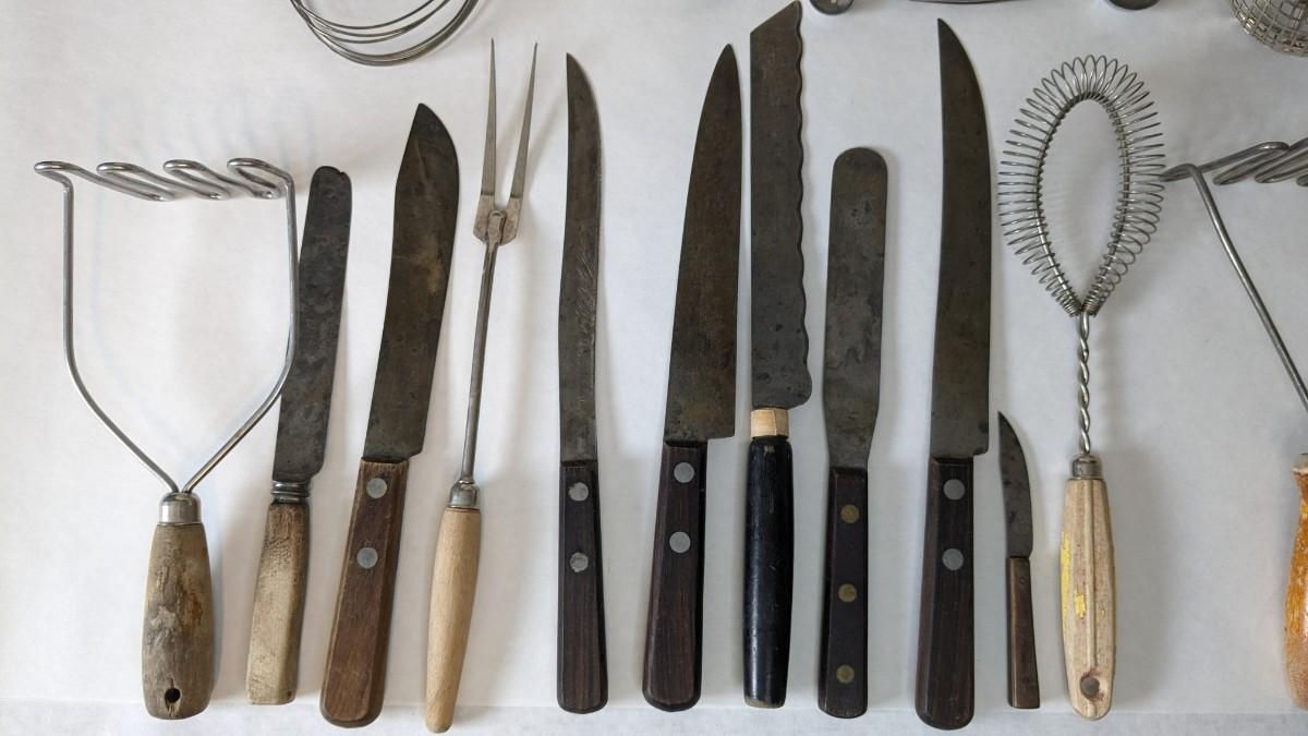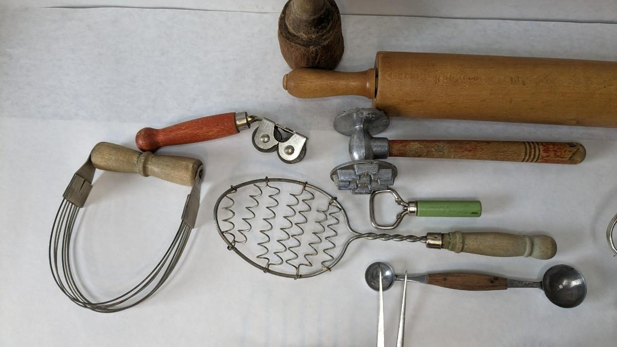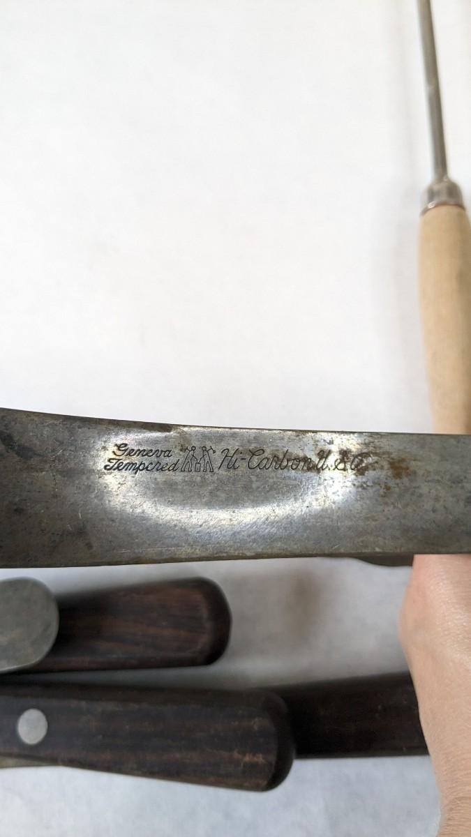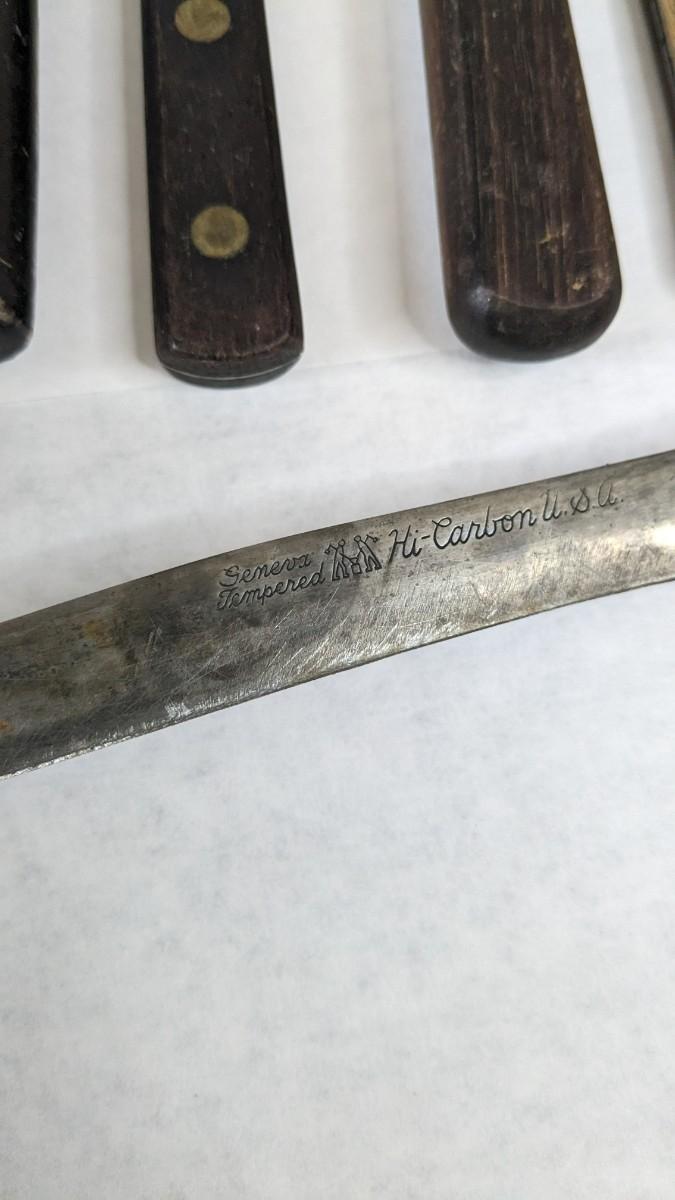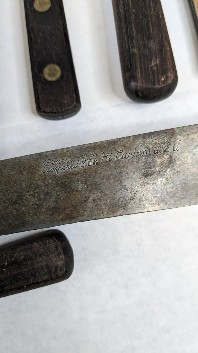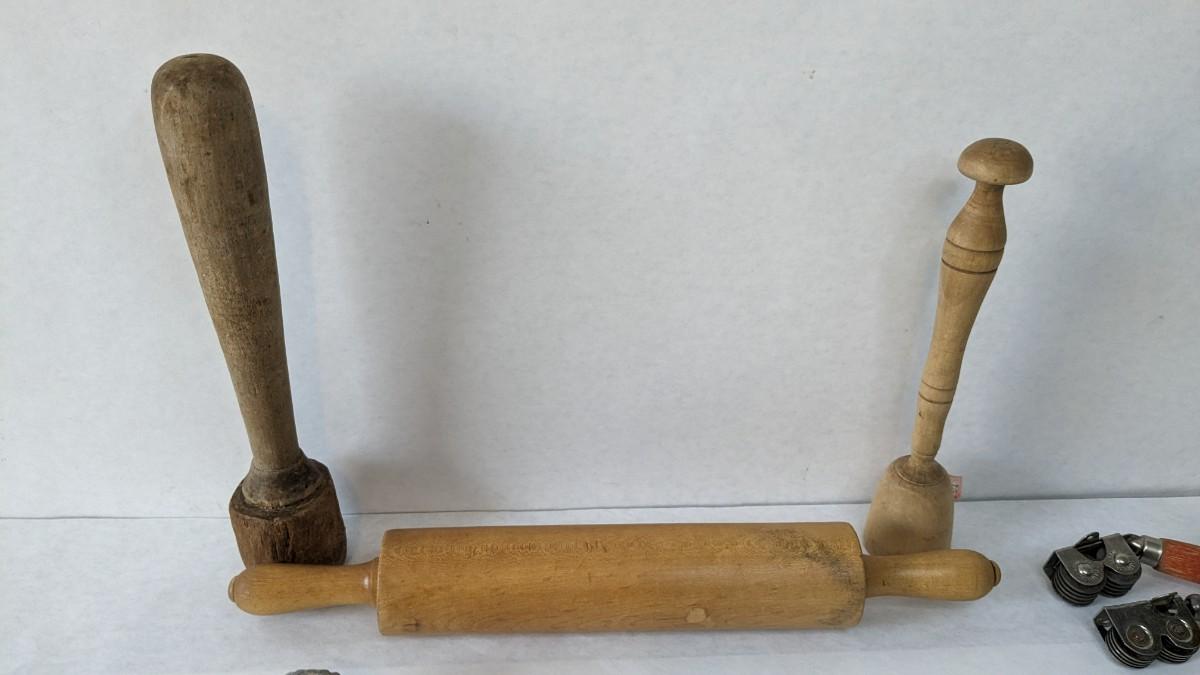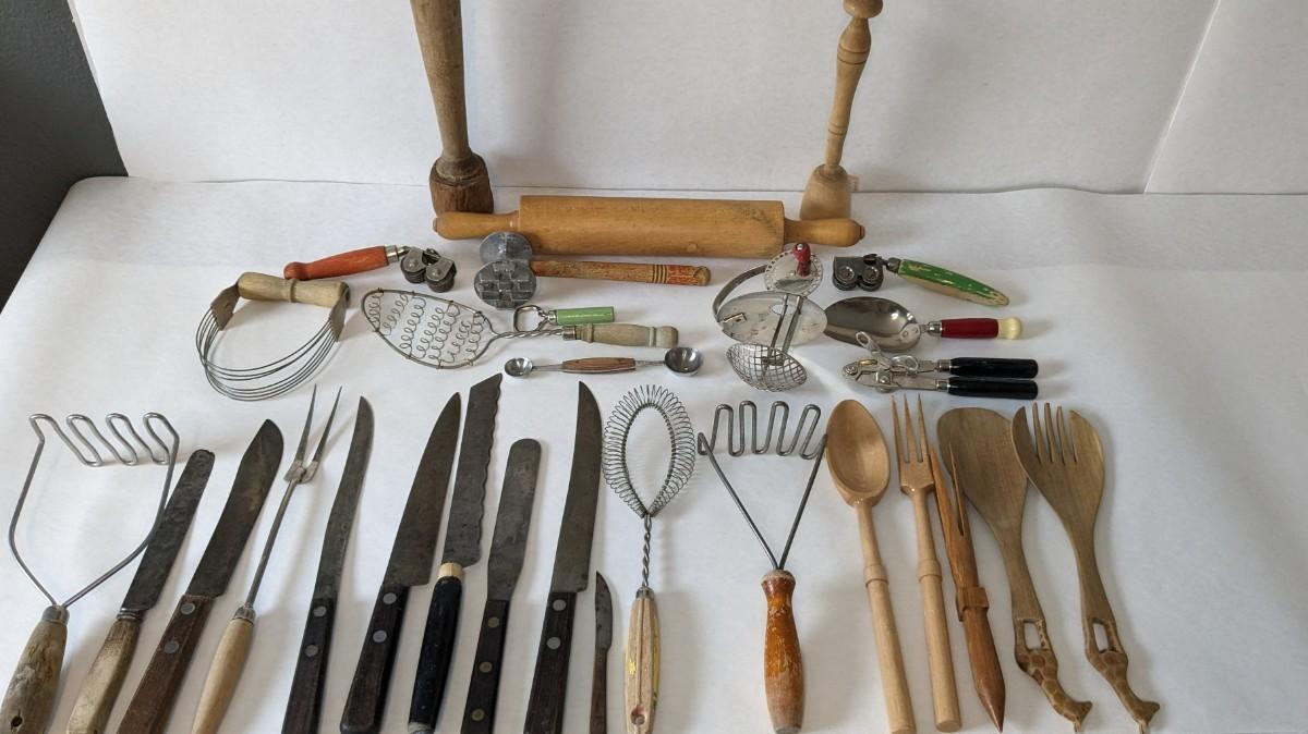 Includes 8 wood handle knives, half are marked Geneva Tempered Hi/Carbon USA that are still securely in handles, unmarked bread knife shows repair where blade meets handle. Also includes various solid wood kitchen tongs, mallets, and a rolling pin. With 12 pieces of wood handle/metal utensils. Note meat tenderizer has serious gouging in handle. Overall paint loss in accordance with age and use.