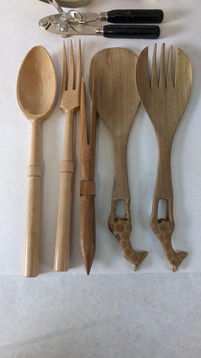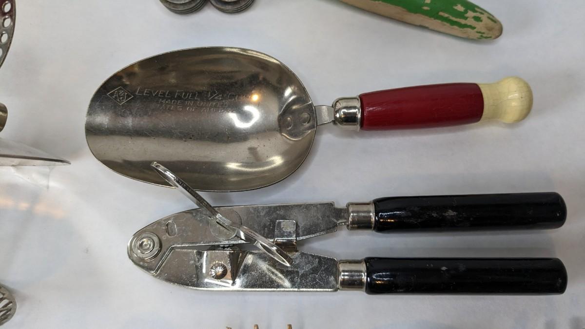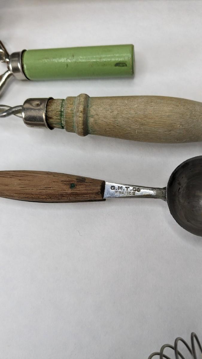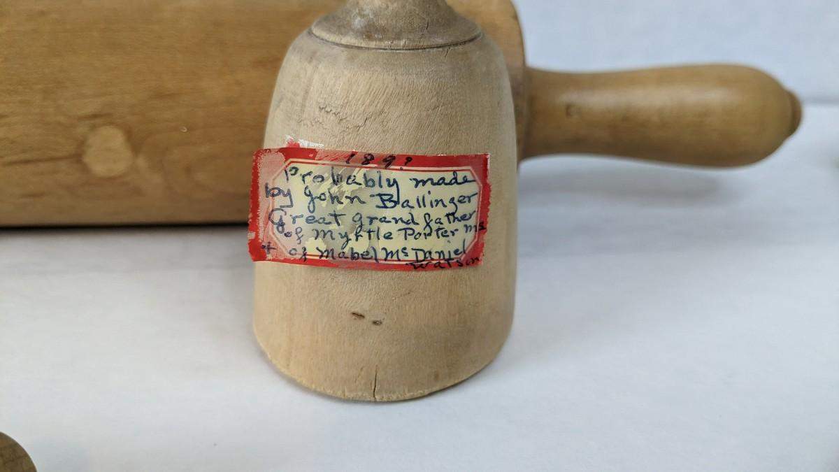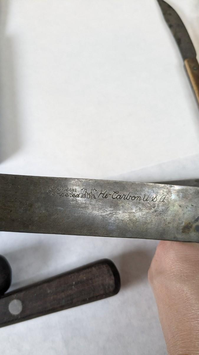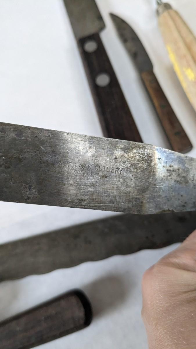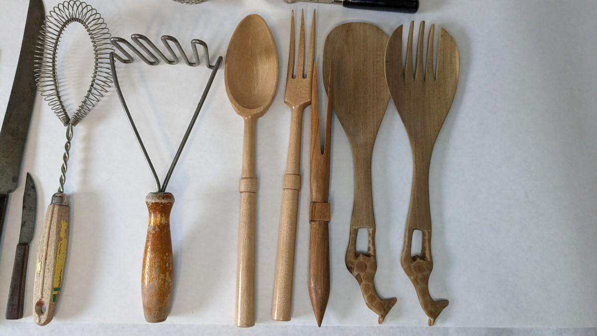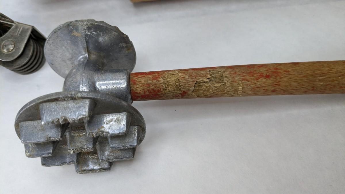 Includes 8 wood handle knives, half are marked Geneva Tempered Hi/Carbon USA that are still securely in handles, unmarked bread knife shows repair where blade meets handle. Also includes various solid wood kitchen tongs, mallets, and a rolling pin. With 12 pieces of wood handle/metal utensils. Note meat tenderizer has serious gouging in handle. Overall paint loss in accordance with age and use.