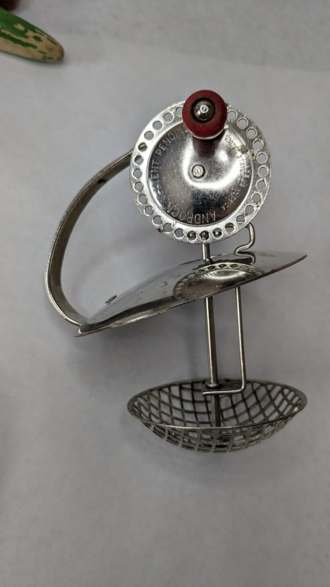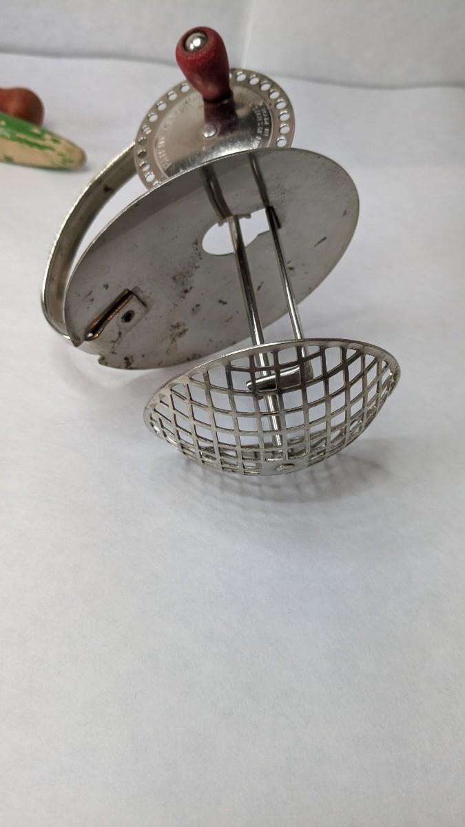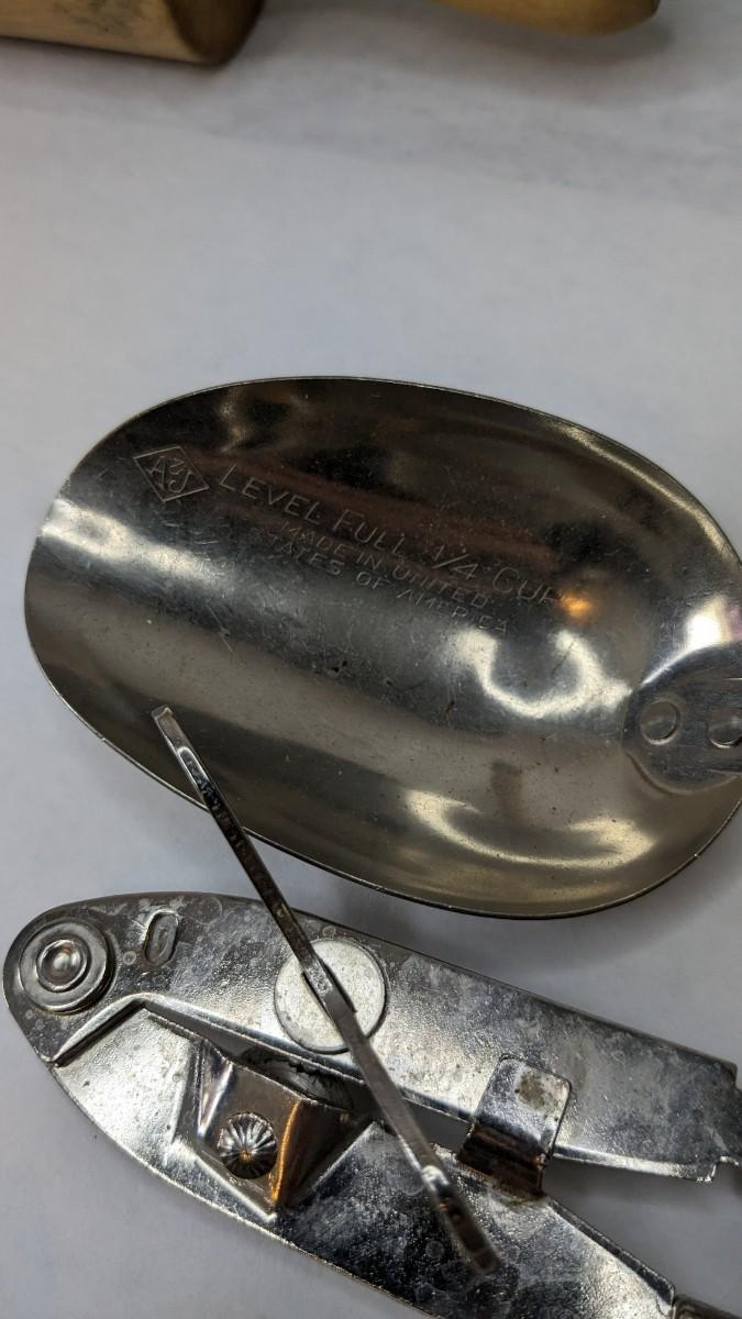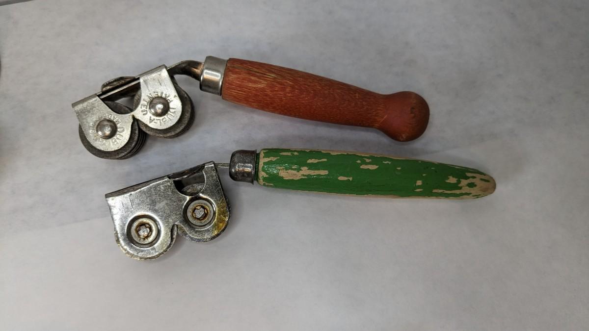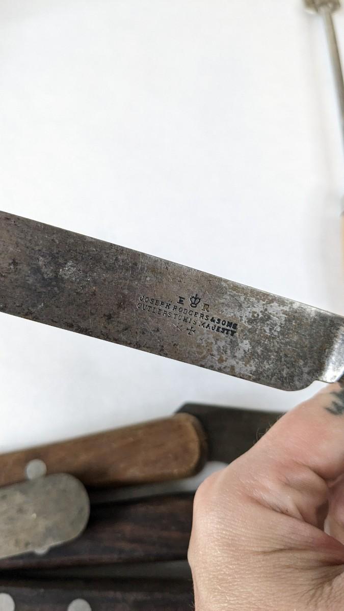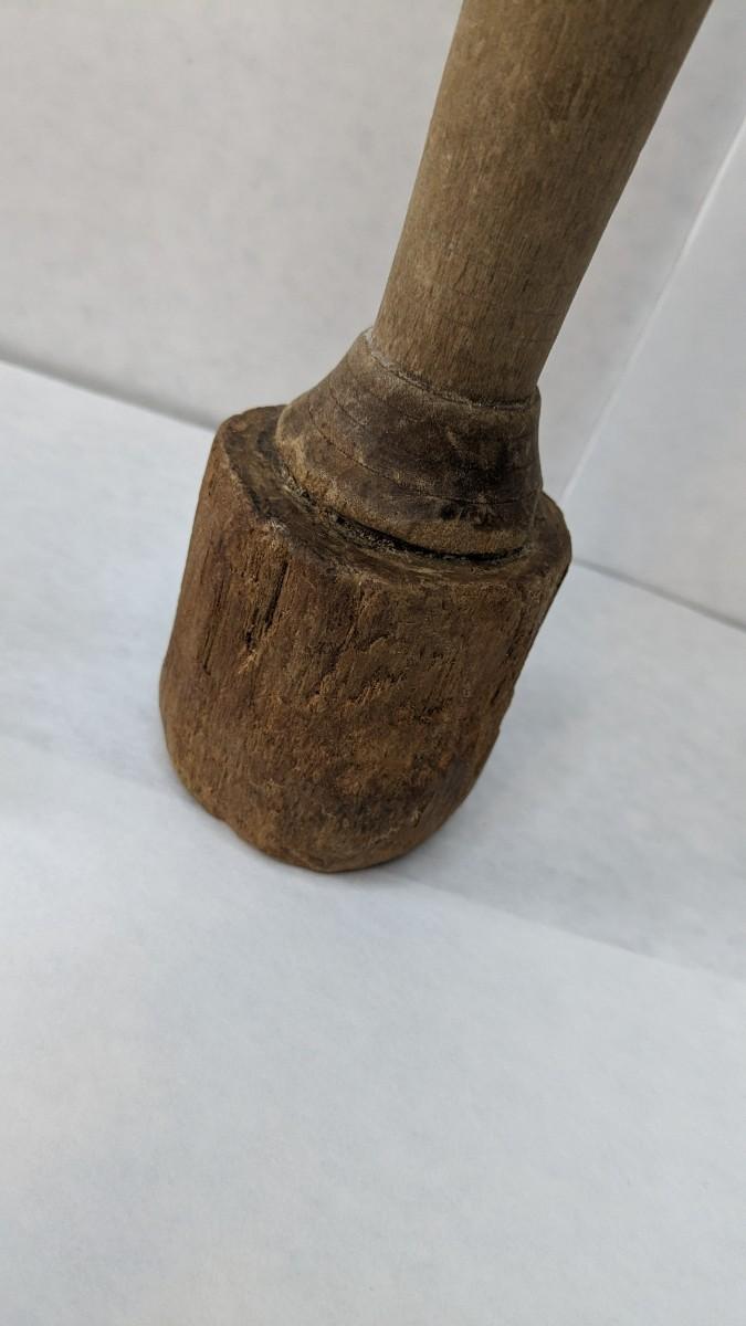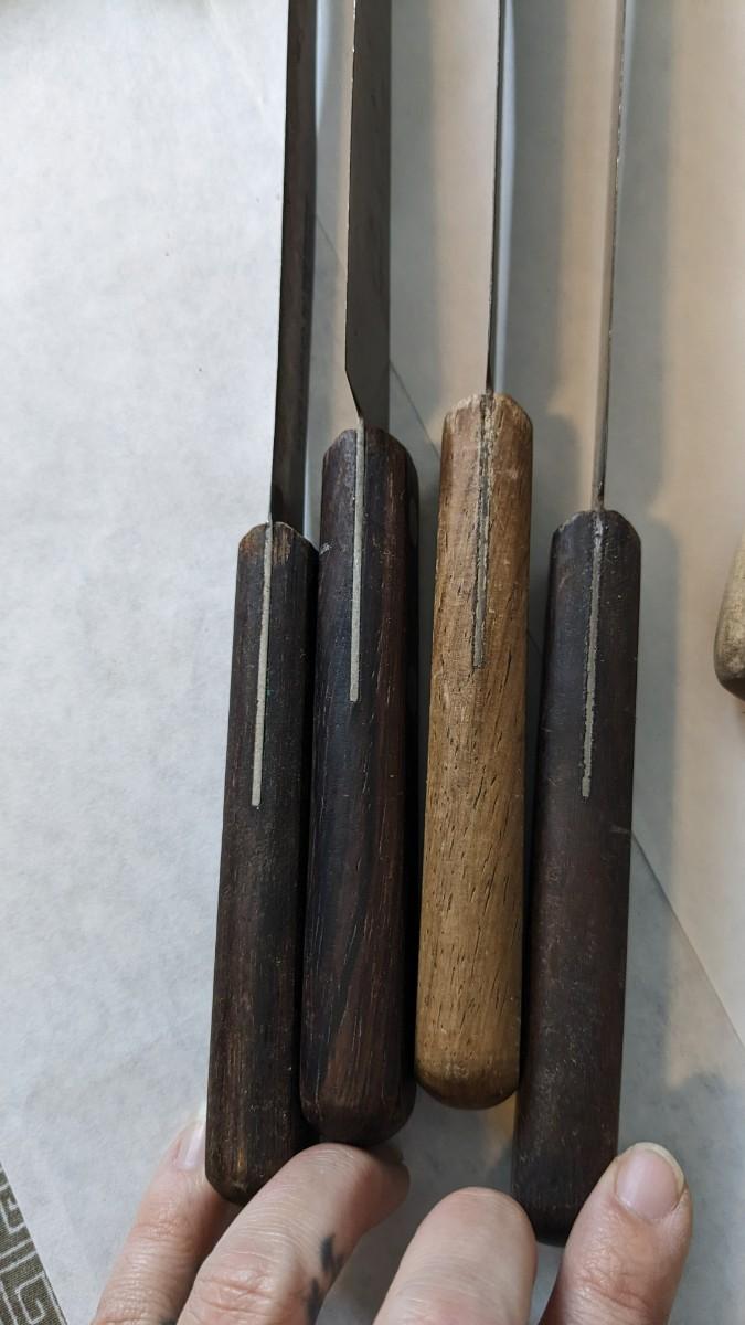 Includes 8 wood handle knives, half are marked Geneva Tempered Hi/Carbon USA that are still securely in handles, unmarked bread knife shows repair where blade meets handle. Also includes various solid wood kitchen tongs, mallets, and a rolling pin. With 12 pieces of wood handle/metal utensils. Note meat tenderizer has serious gouging in handle. Overall paint loss in accordance with age and use.