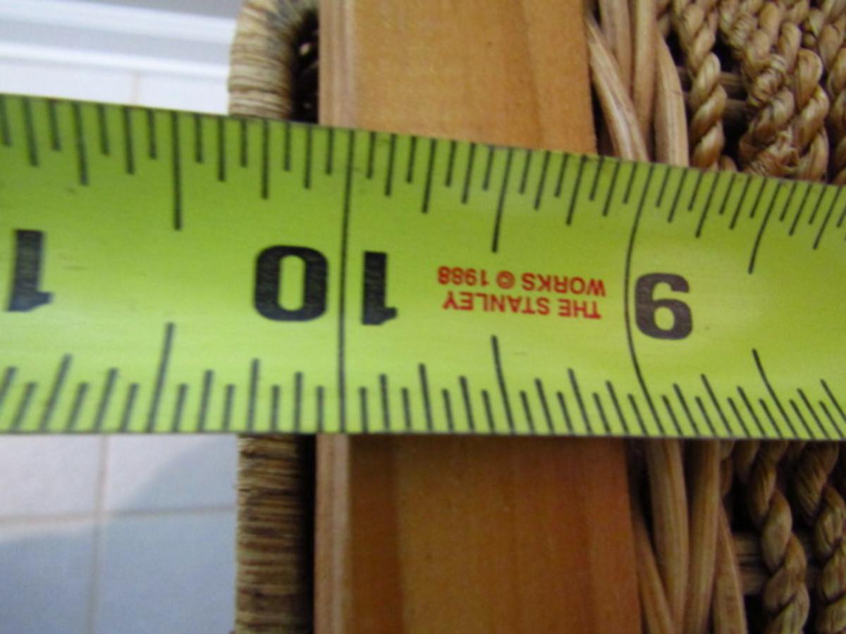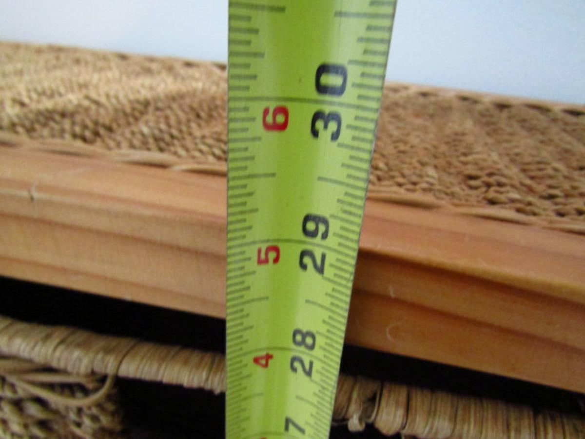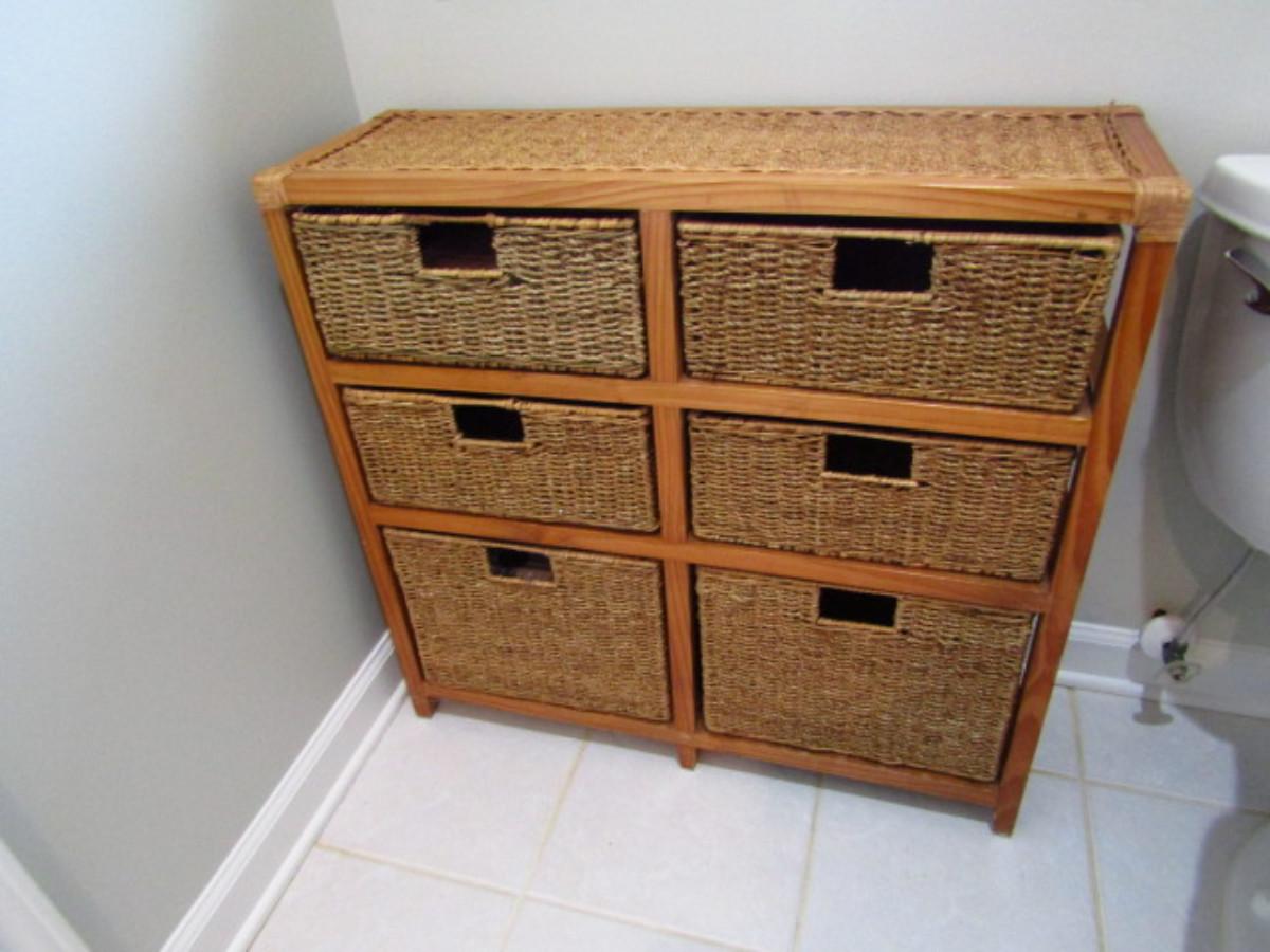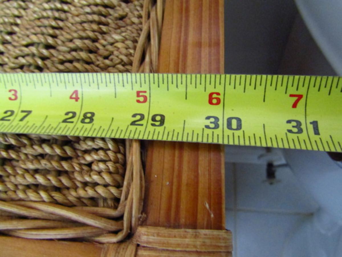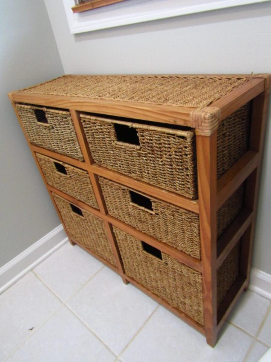 Wood and Woven Rush Cubby Cabinet with Storage Baskets- Item is Upstairs. Measures approx 30" wide, 10" deep, 29" tall.. Upstairs item