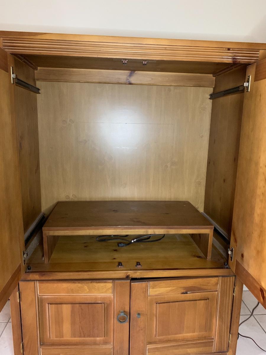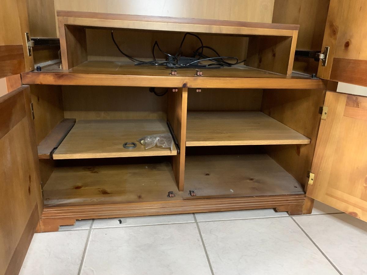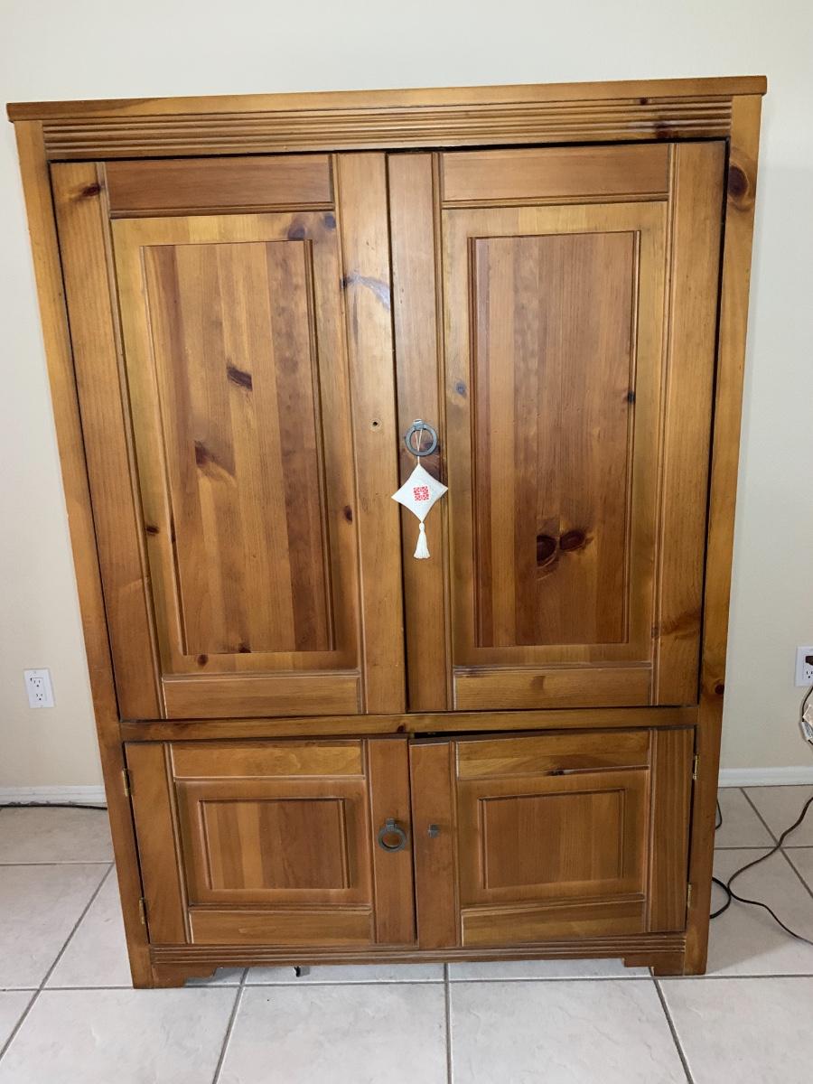 Wood, mission style knotty wood armoire with upper cabinet doors that have a raised shelf for TV. Missing one pull on the uppers and one pull on the lowers. The lower cabinet is smaller with a center divider and a shelf on each side, There is a small power strip mounted to the inside near back. Wood is in great condition. Dimensions 44” wide x 23” deep x 62” tall.