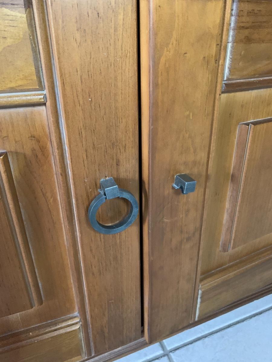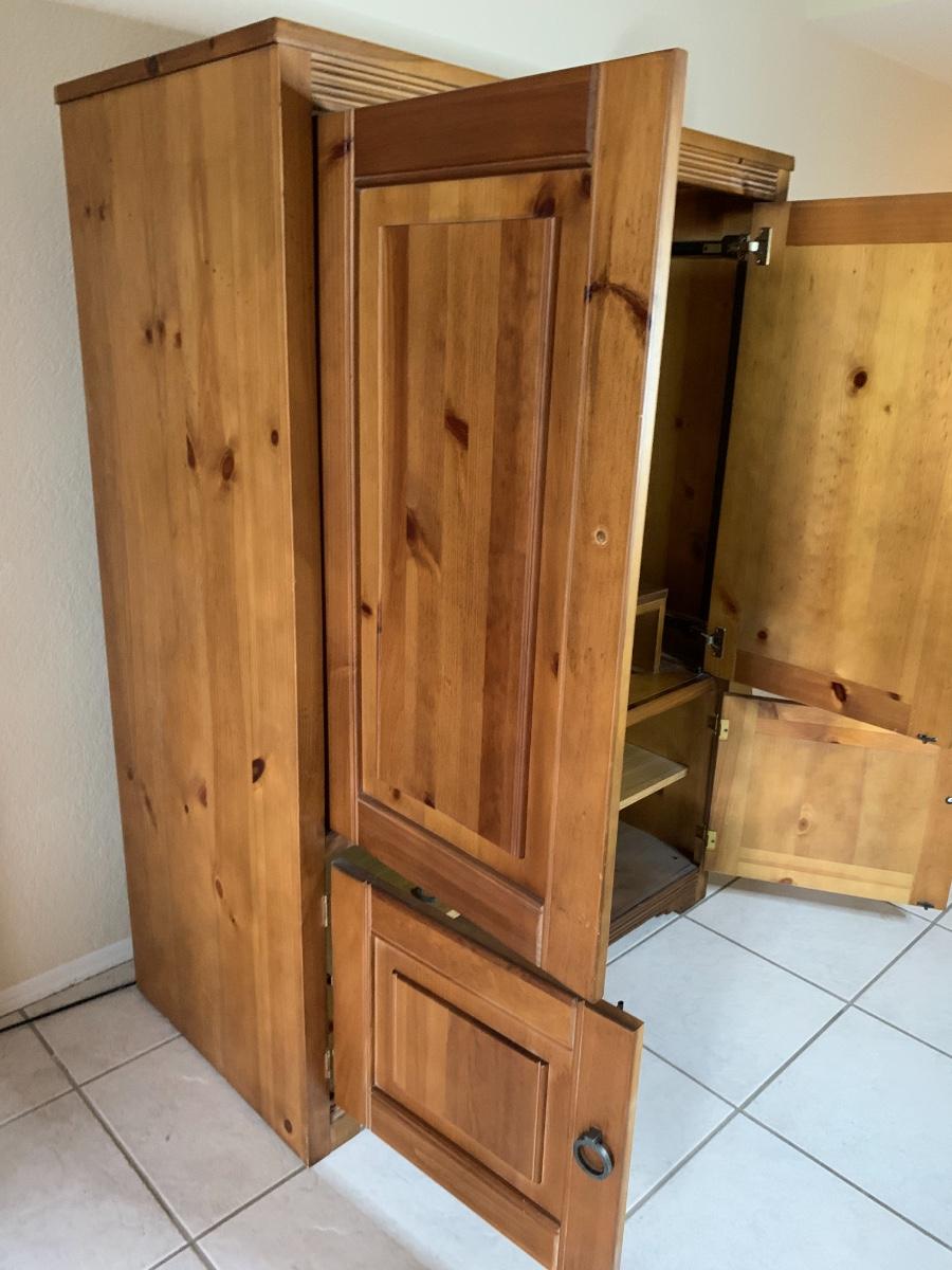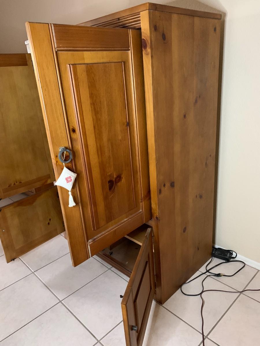 Wood, mission style knotty wood armoire with upper cabinet doors that have a raised shelf for TV. Missing one pull on the uppers and one pull on the lowers. The lower cabinet is smaller with a center divider and a shelf on each side, There is a small power strip mounted to the inside near back. Wood is in great condition. Dimensions 44” wide x 23” deep x 62” tall.