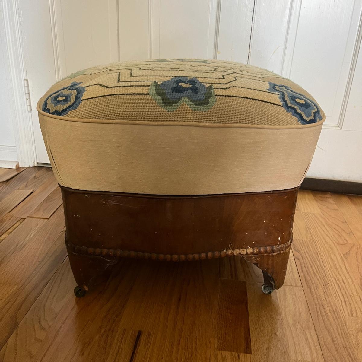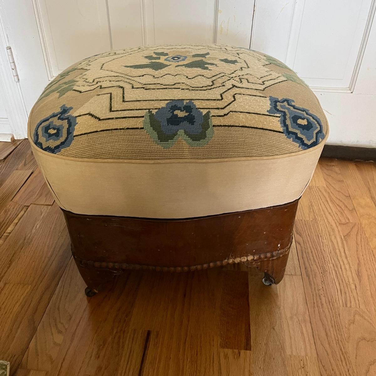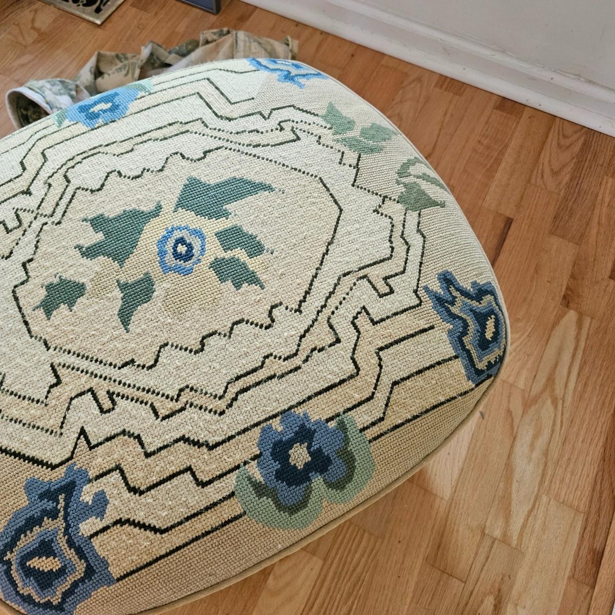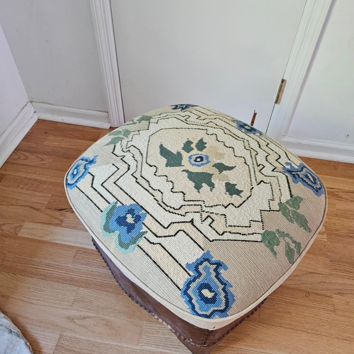 Square shape ottoman with needlepoint top and wood base. Seat is adorned with flowers and background, also includes a slip on cover piece. Ottoman measures 21.5" x 20" x 18"H. Wood base has four corner legs with metal wheel casters. Some of the legs appear to have had repair. See photos for details. Local pickup only.