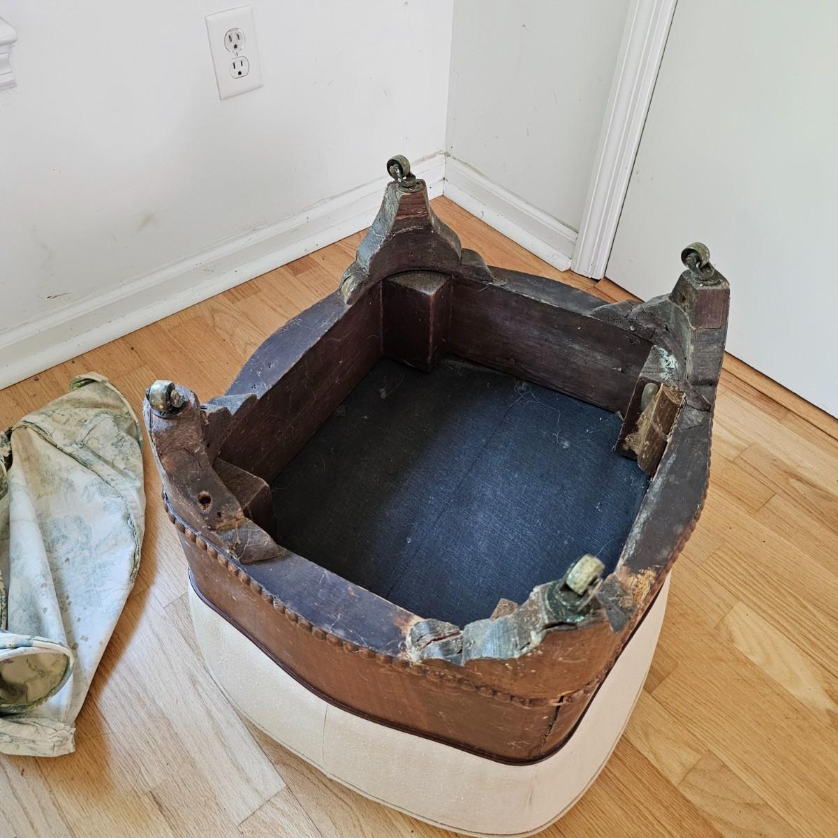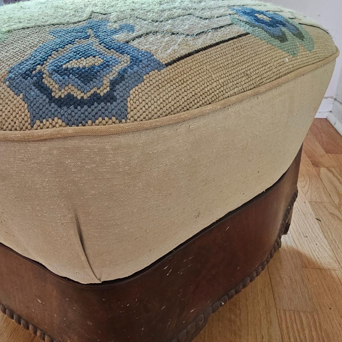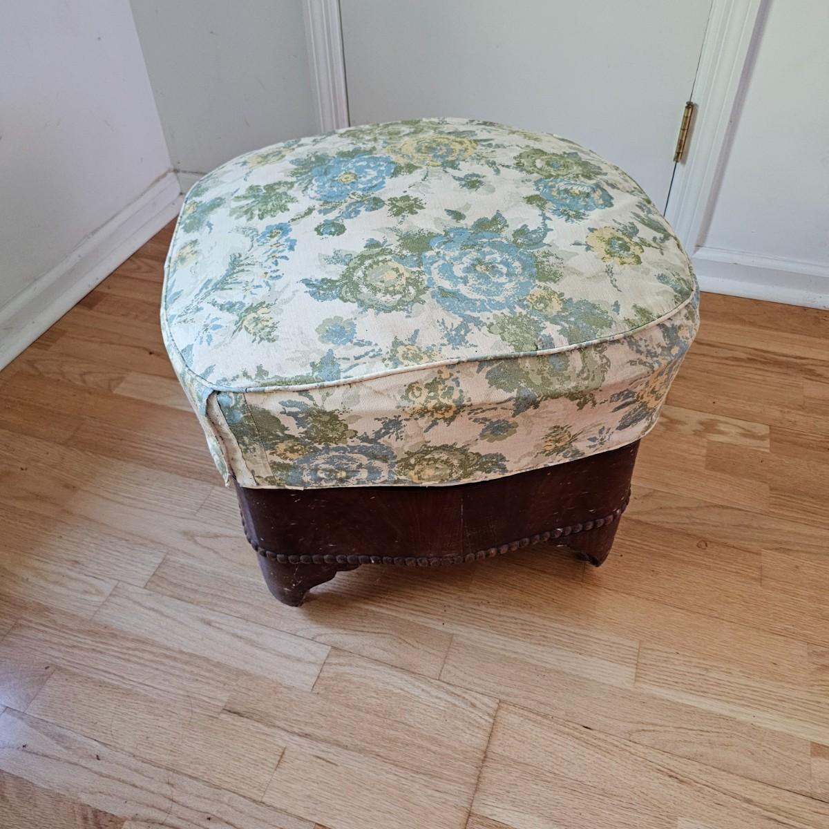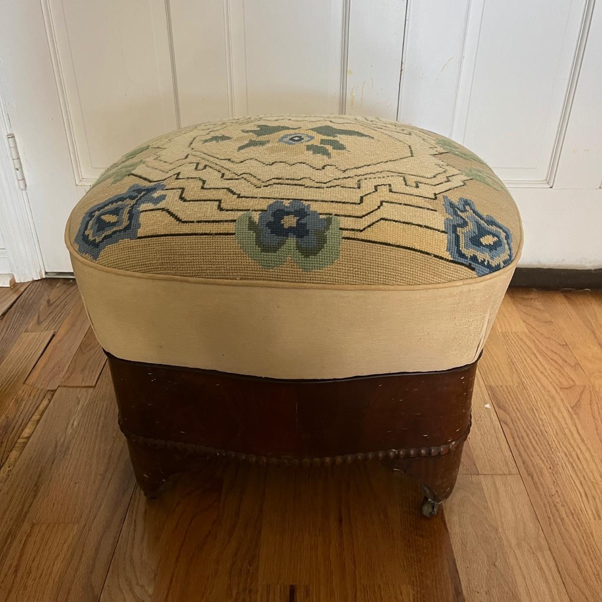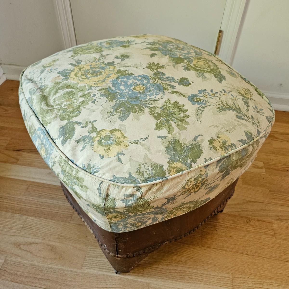 Square shape ottoman with needlepoint top and wood base. Seat is adorned with flowers and background, also includes a slip on cover piece. Ottoman measures 21.5" x 20" x 18"H. Wood base has four corner legs with metal wheel casters. Some of the legs appear to have had repair. See photos for details. Local pickup only.