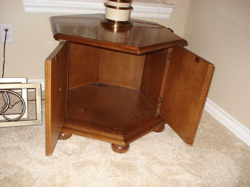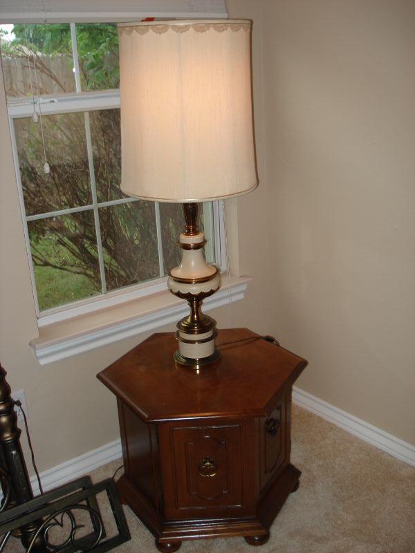 Wood bedside or end table with 2 doors on front. Doors don't want to stay shut together, they stay shut independently just fine. Probably an easy fix for the talented handy person. Heavy vintage metal lamp with 3 way switch.