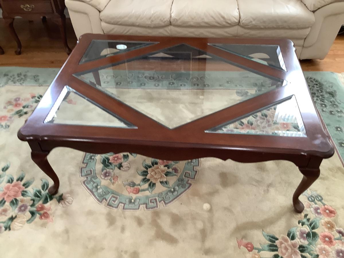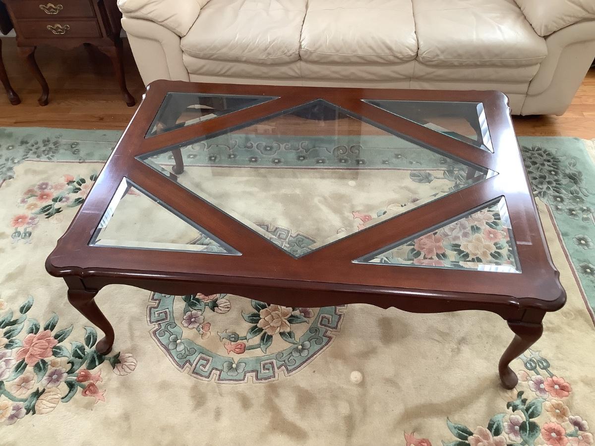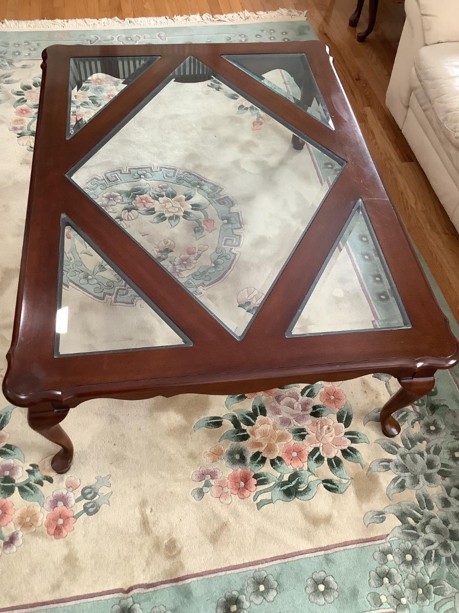 Wood & beveled glass coffee table 17”H 51” x 37”