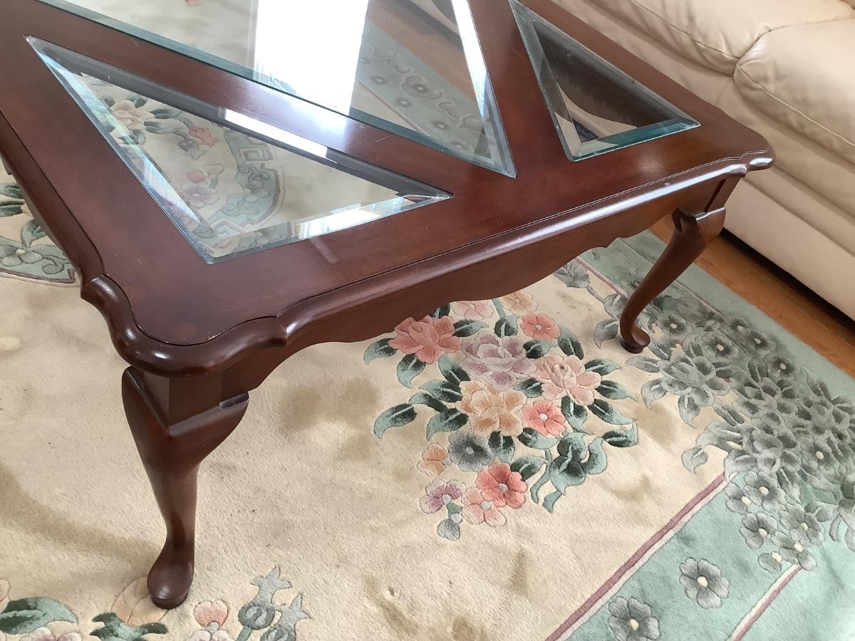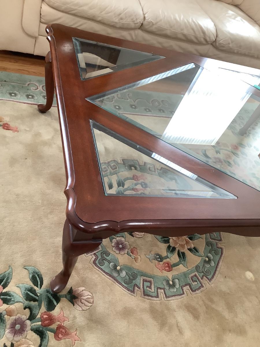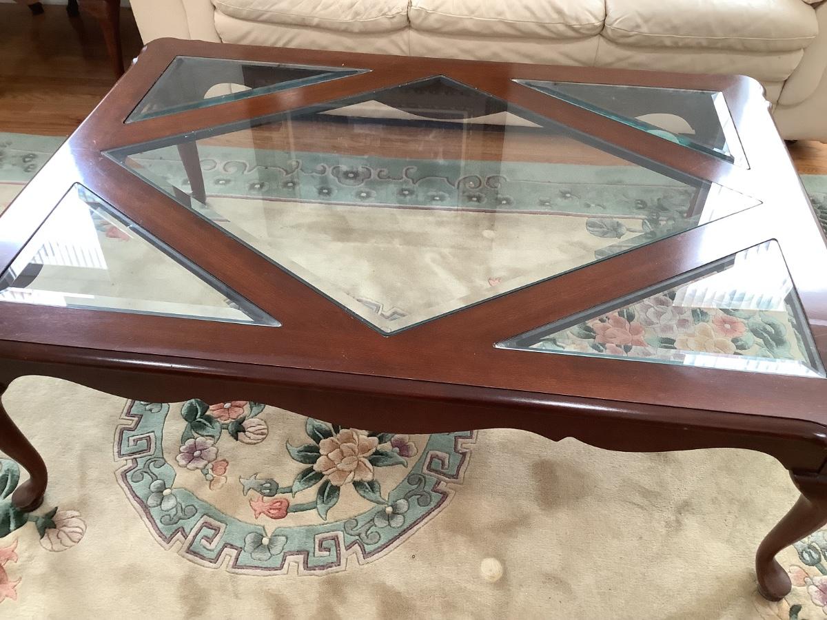 Wood & beveled glass coffee table 17”H 51” x 37”