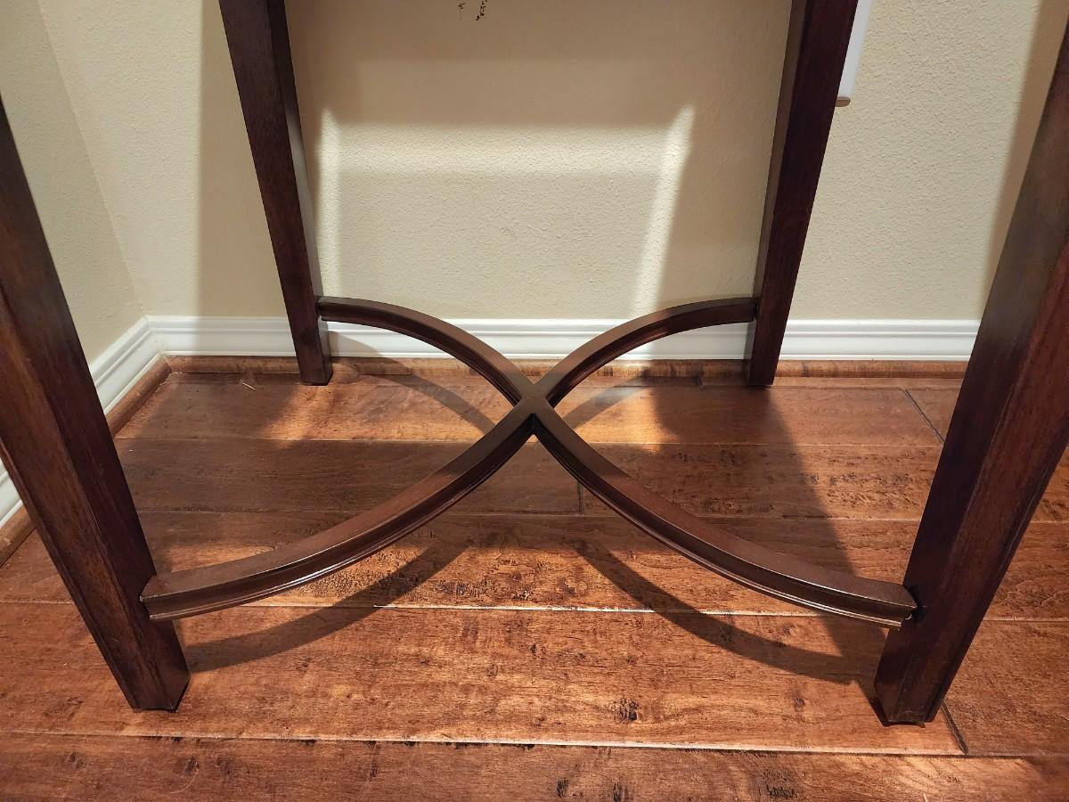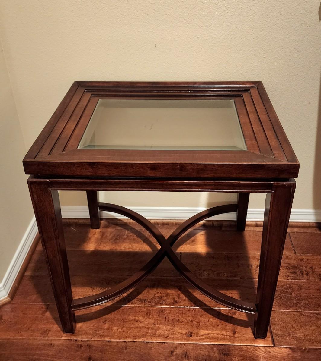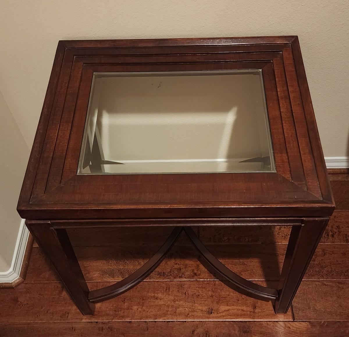 Pretty rectangular side table with beveled glass top. 24 long. 20 wide. 24.5 tall.