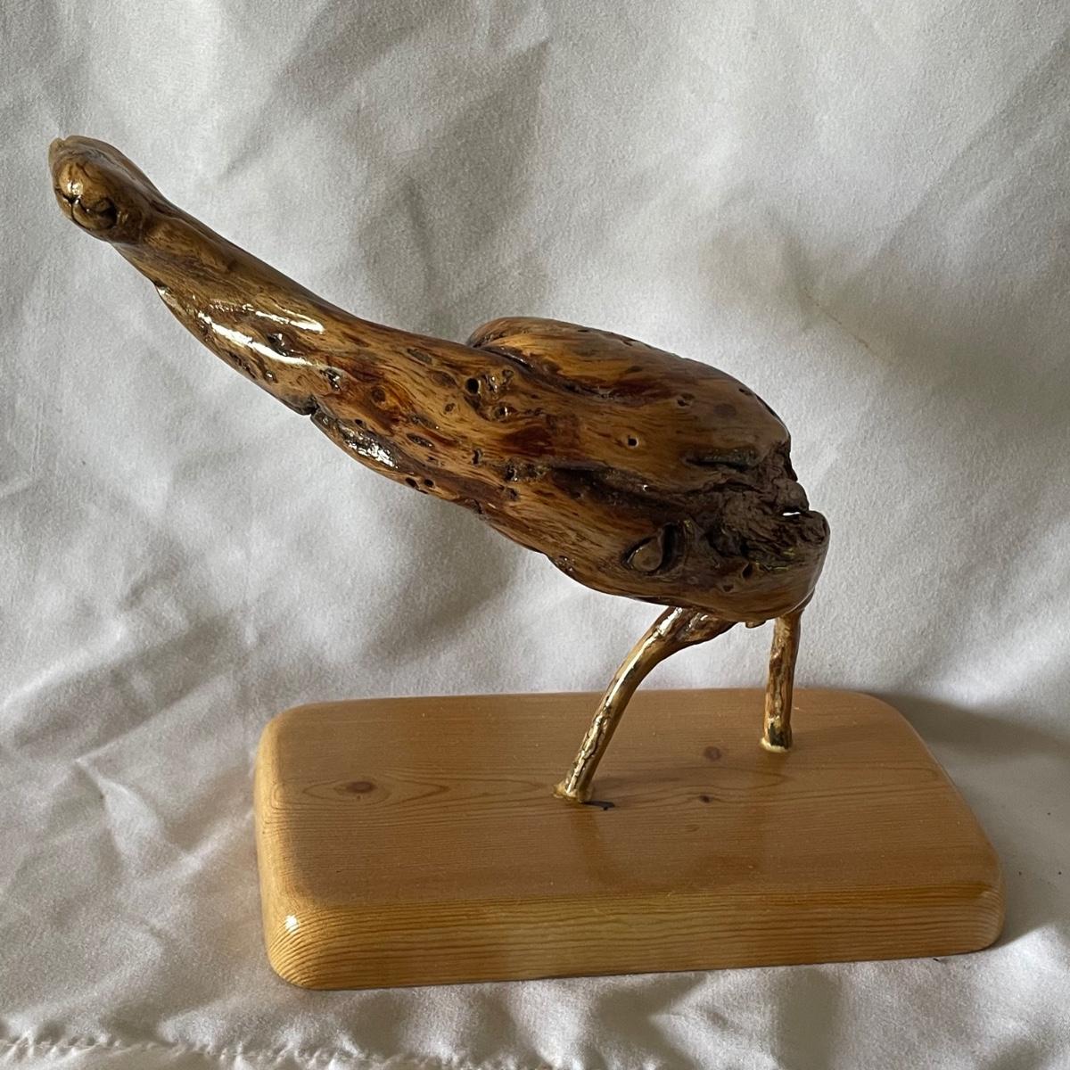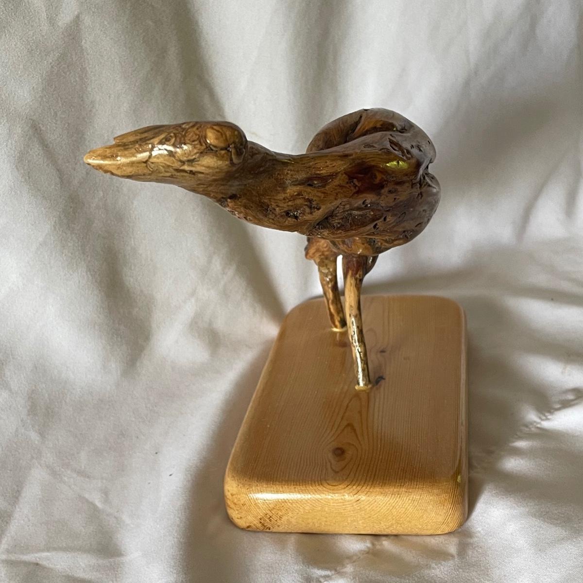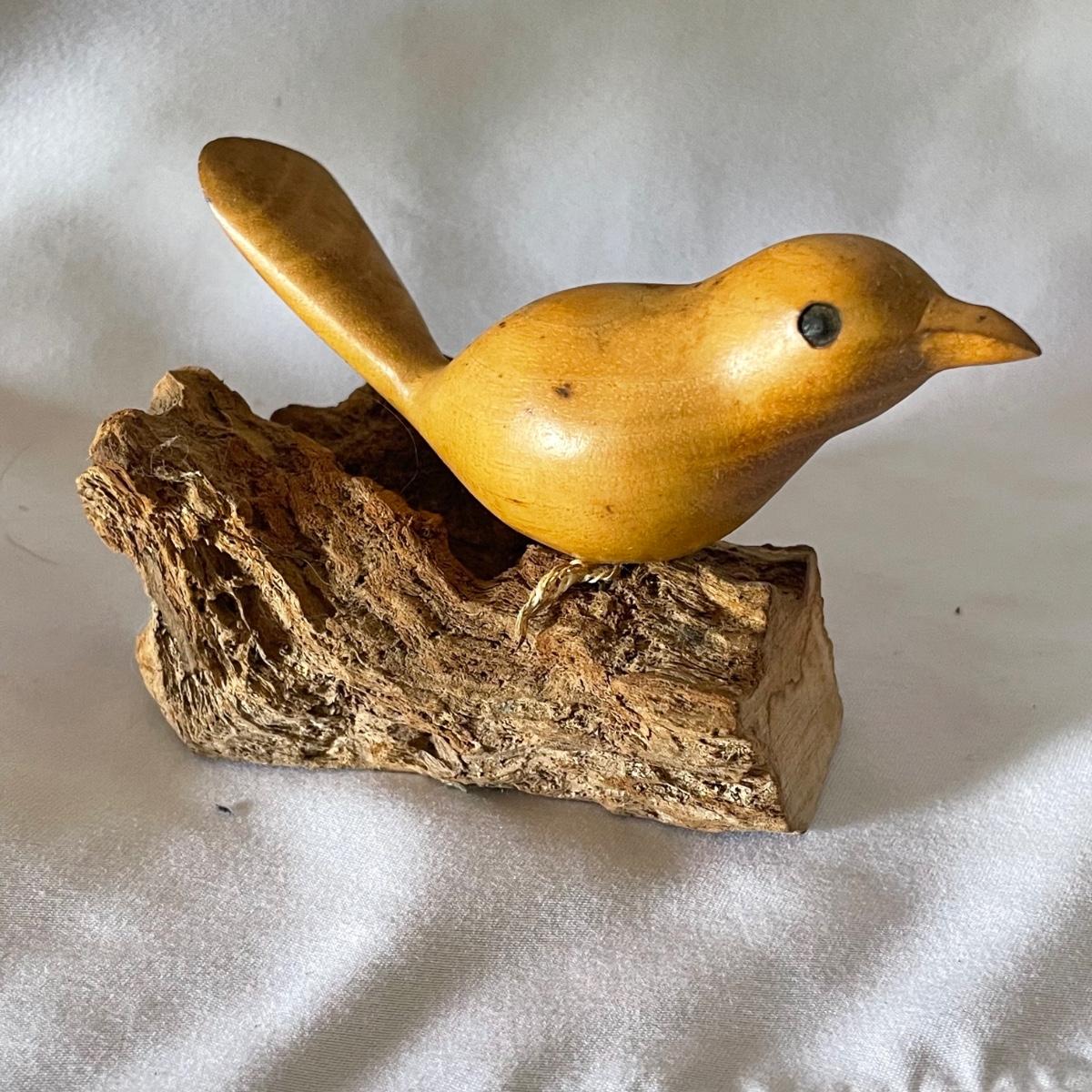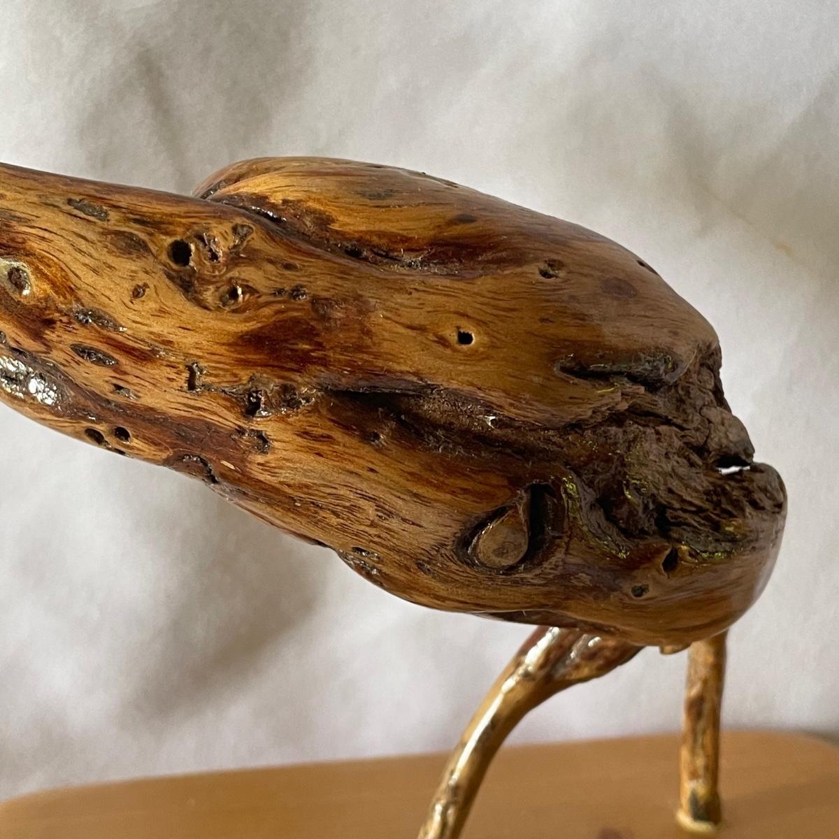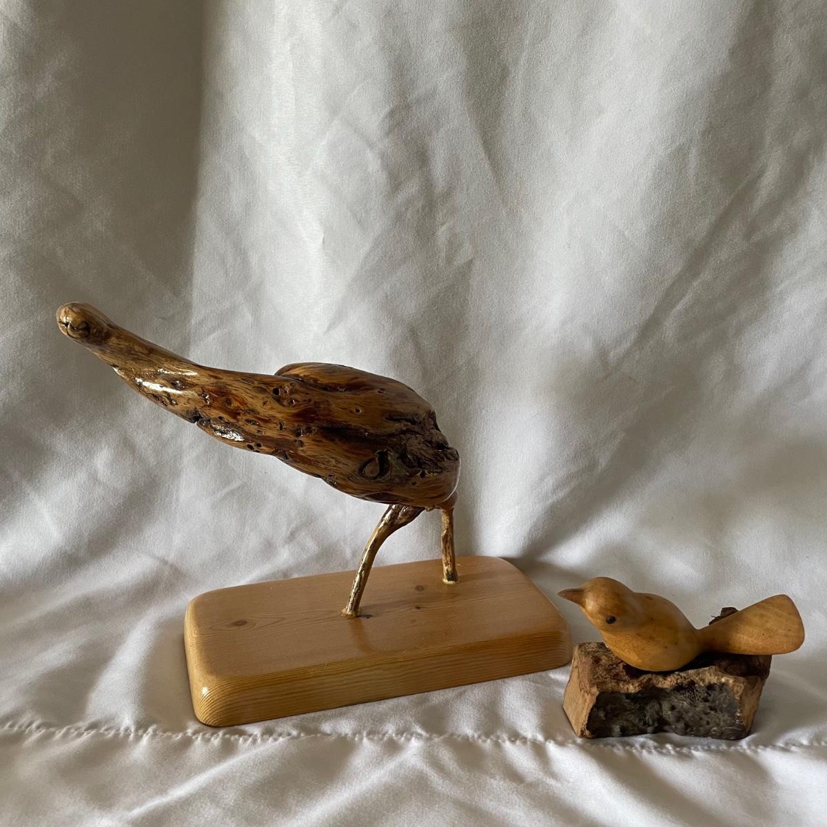 The little wood bird is mounted onto a piece of driftwood and has been paired with a heron type bird made out of some gnarled wood (note the beak is broken), which measures 6” x 3.5” x 6”.