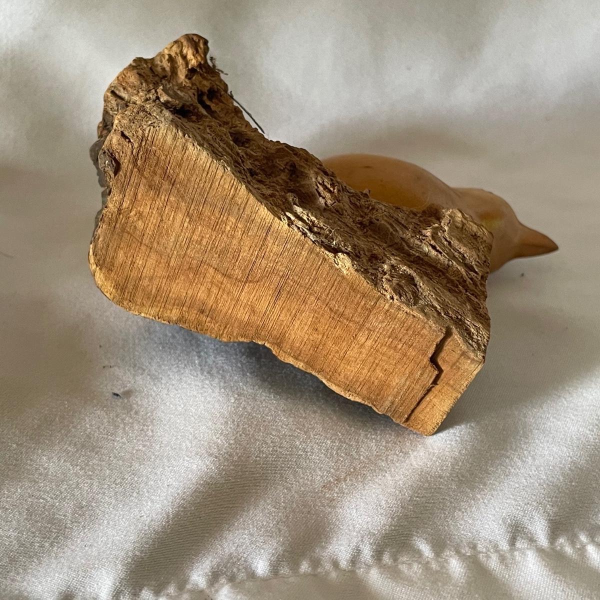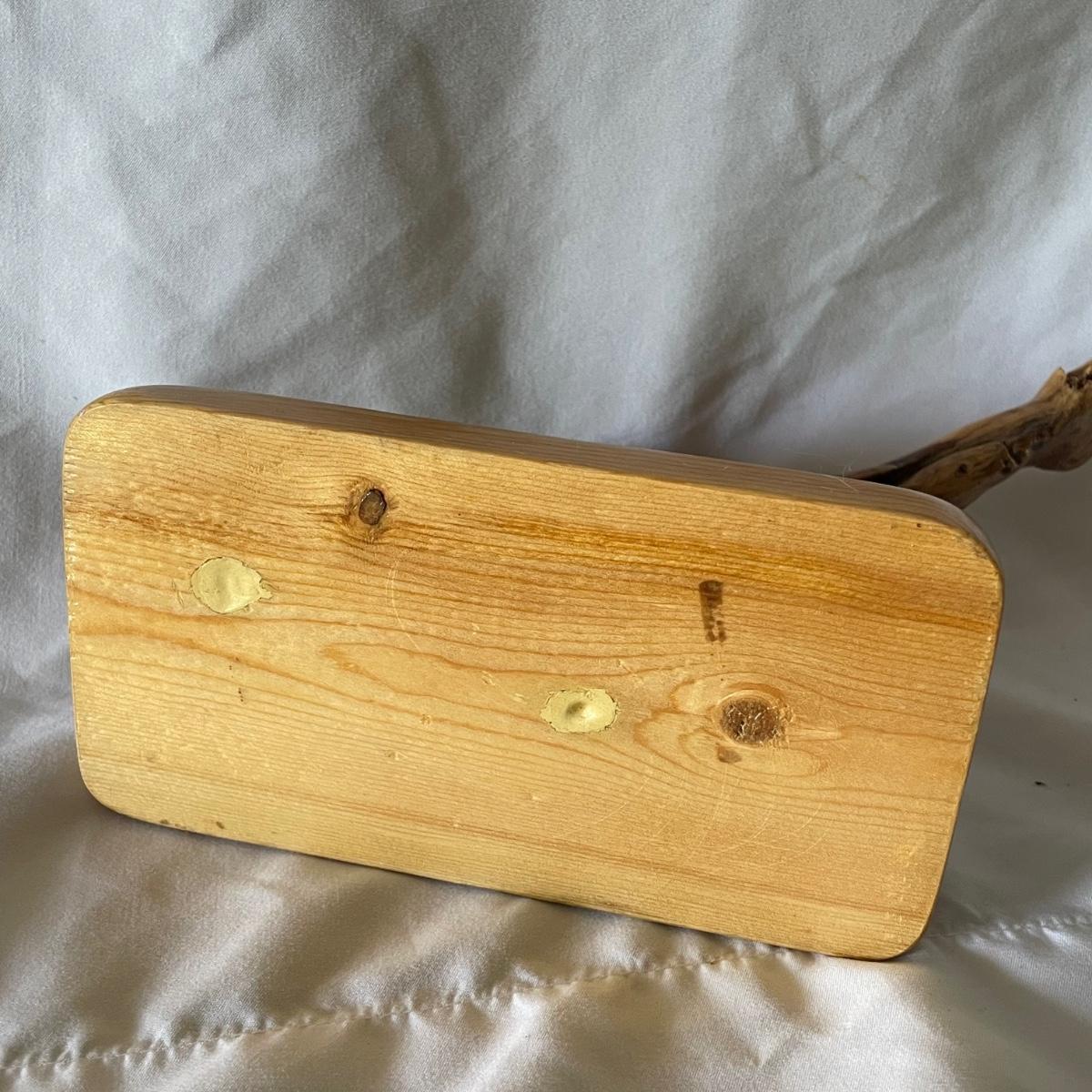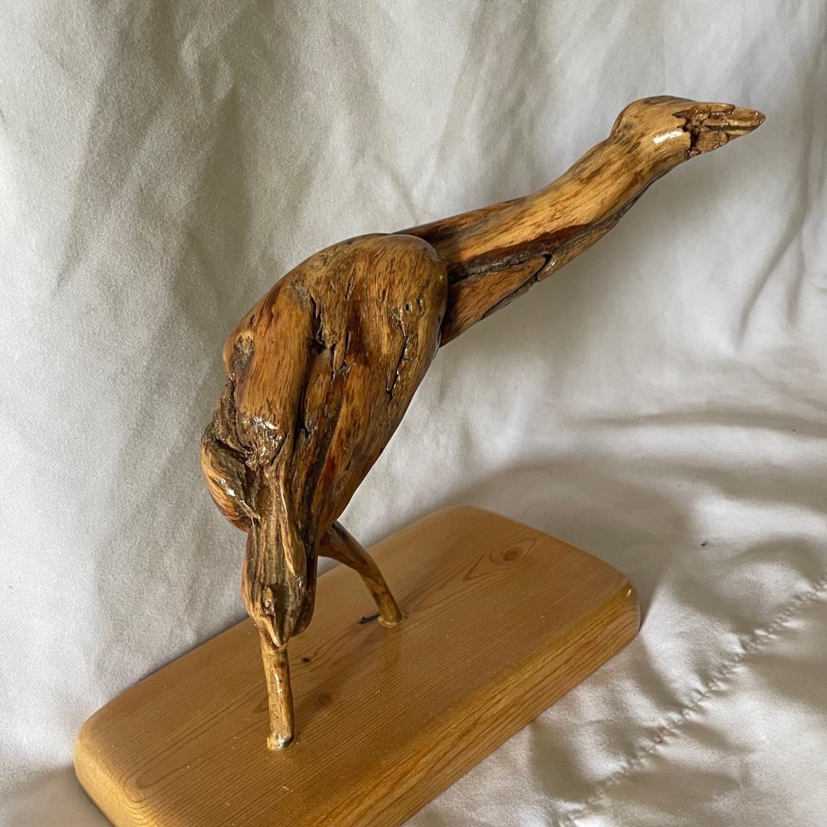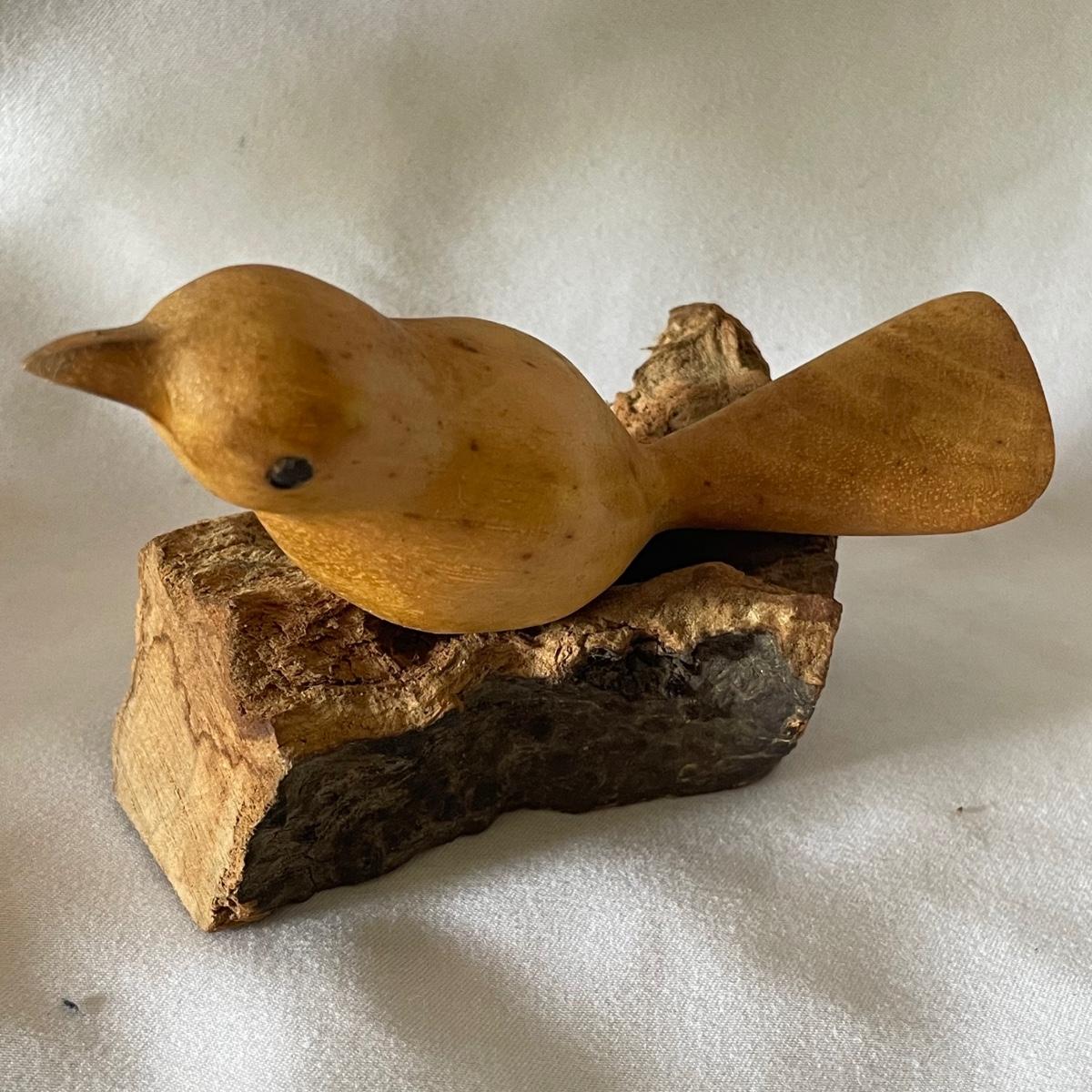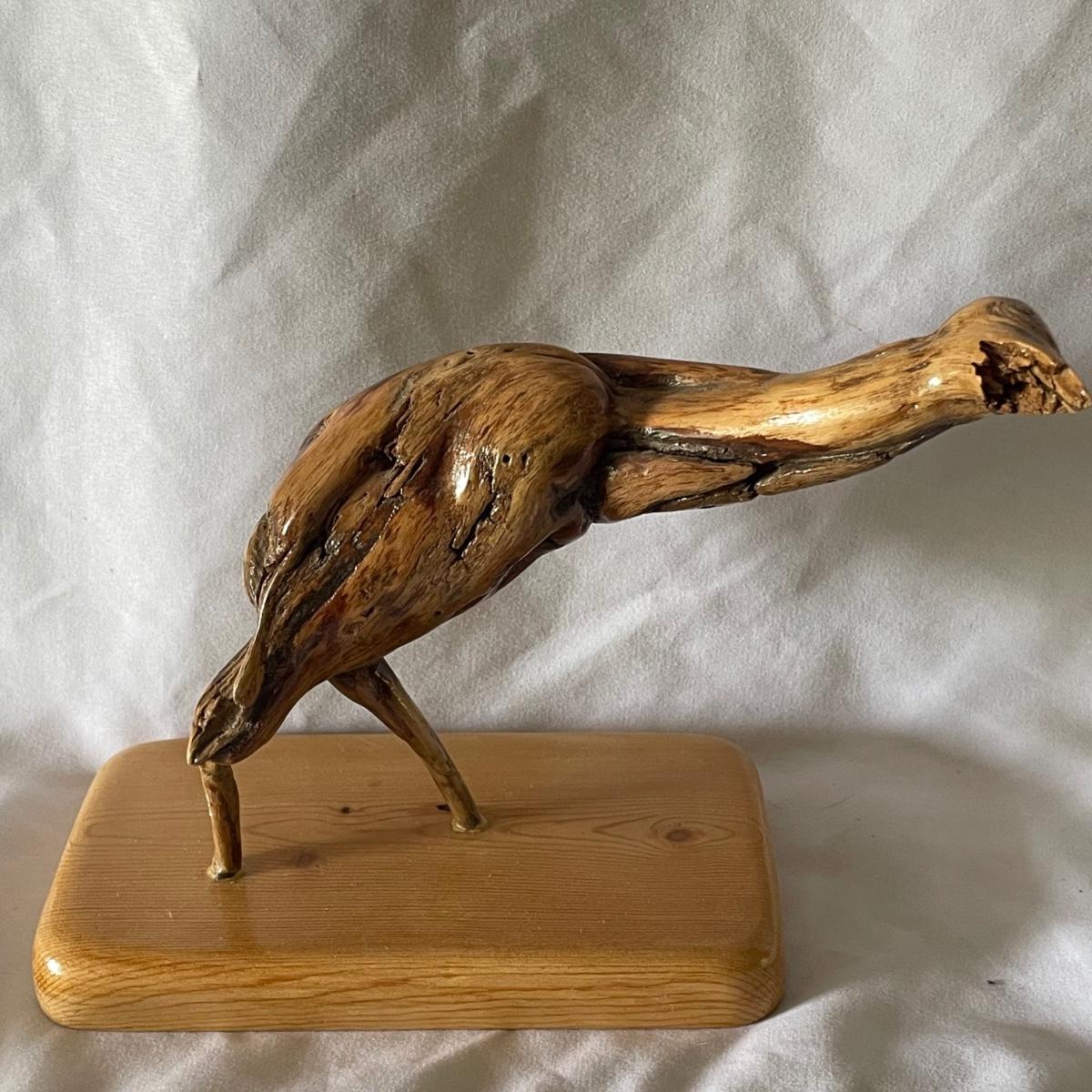 The little wood bird is mounted onto a piece of driftwood and has been paired with a heron type bird made out of some gnarled wood (note the beak is broken), which measures 6” x 3.5” x 6”.